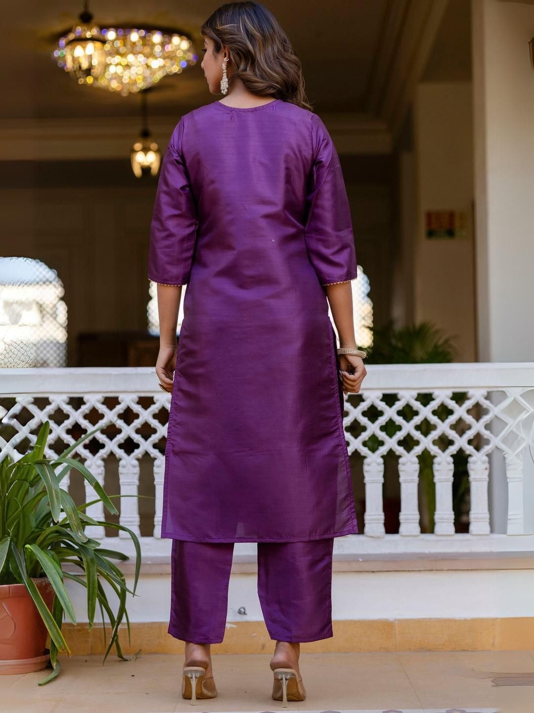 KALINI Women Wine Round Neck Art Silk Three-Quarter Sleeves Embroidered Kurta Sets