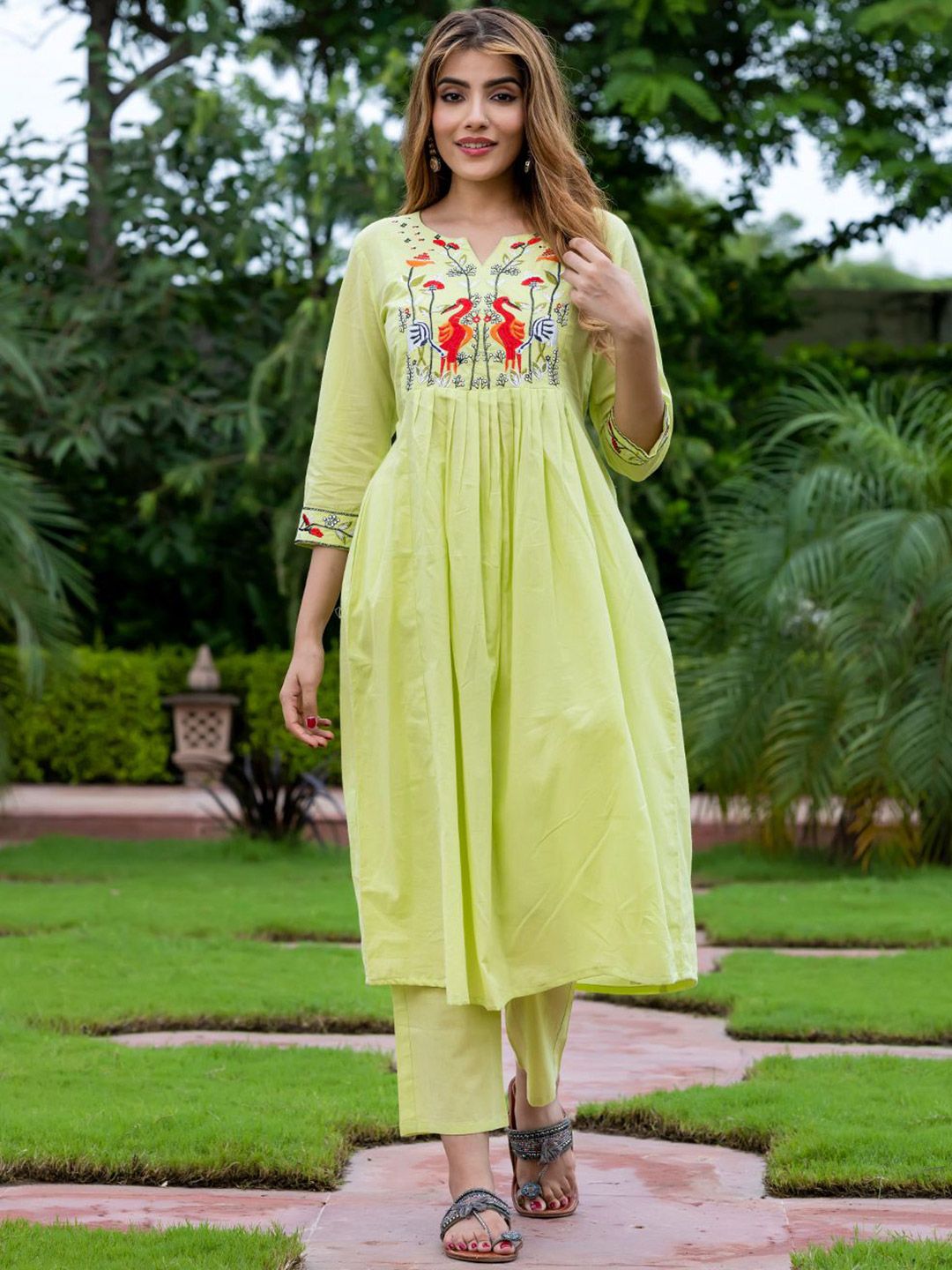 KALINI Women Woven Design Embroidered Cotton Anarkali Kurta with Trousers