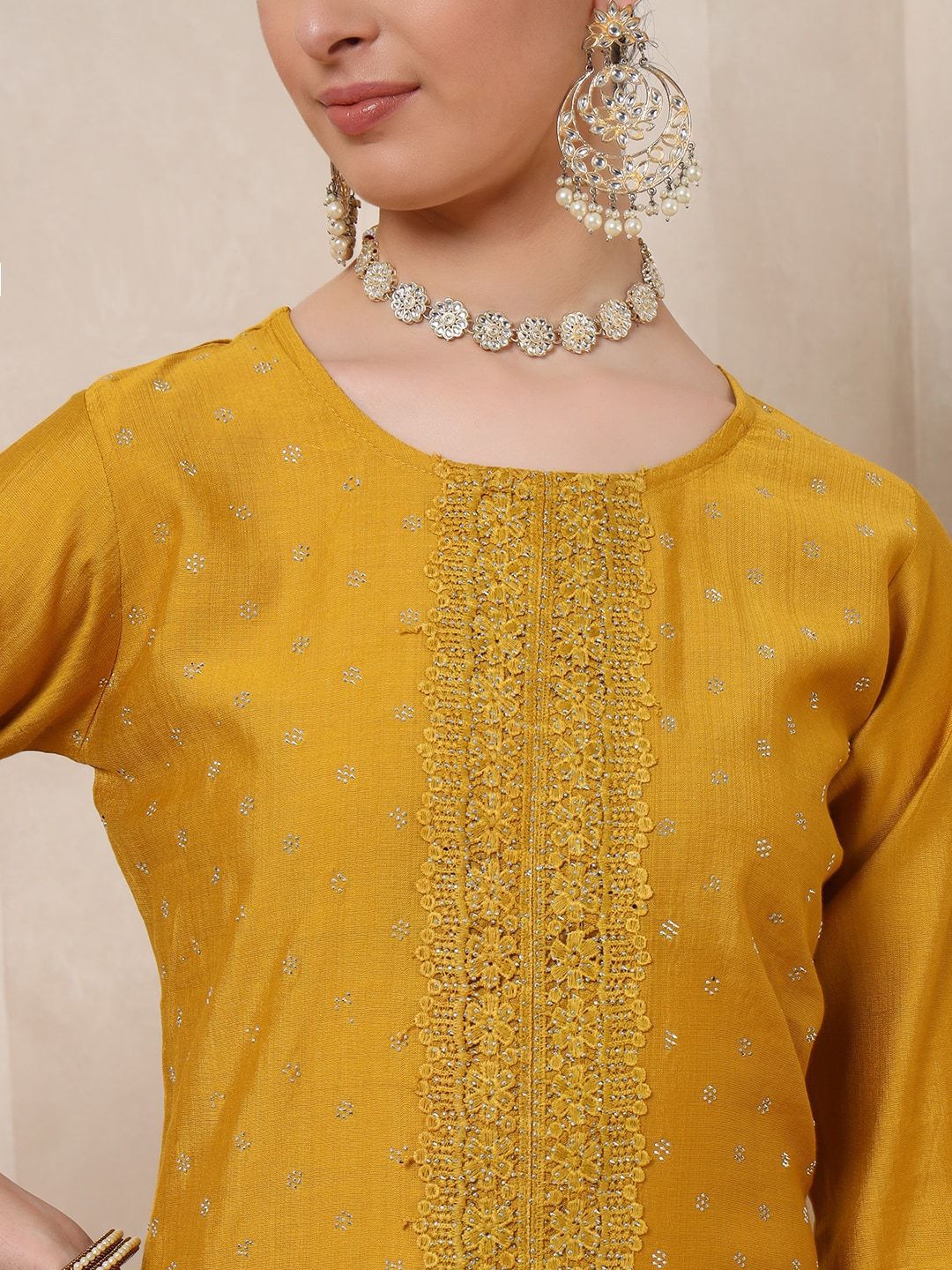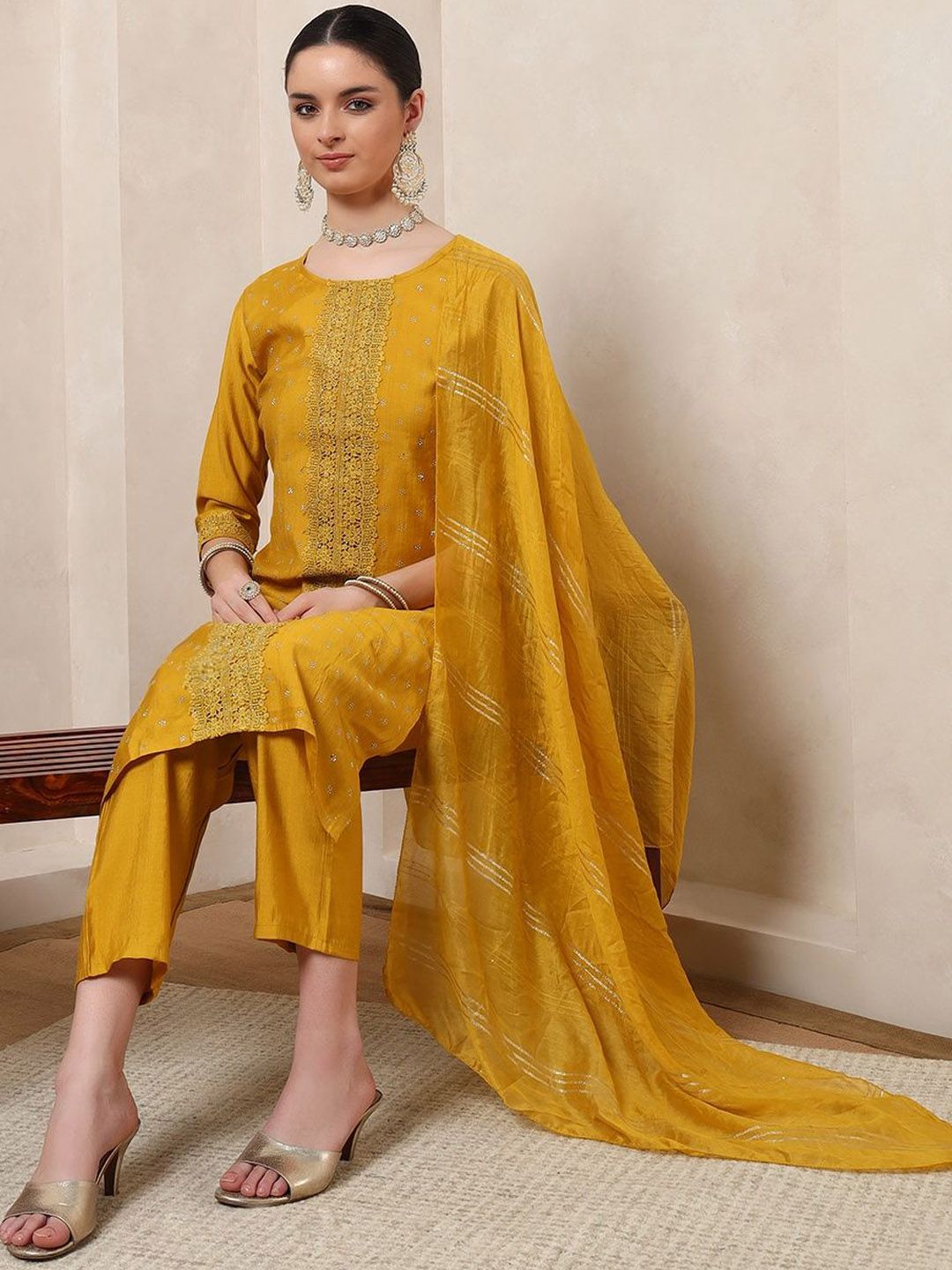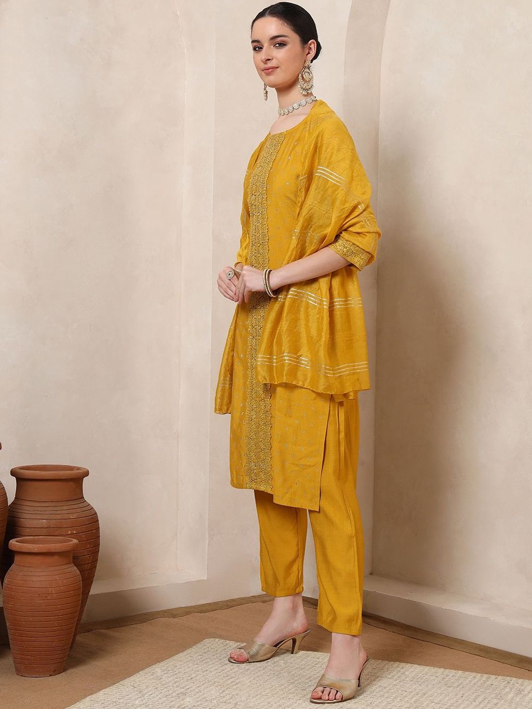 KALINI Women Woven Design Embroidered Cotton Kurta with Trousers & Dupatta