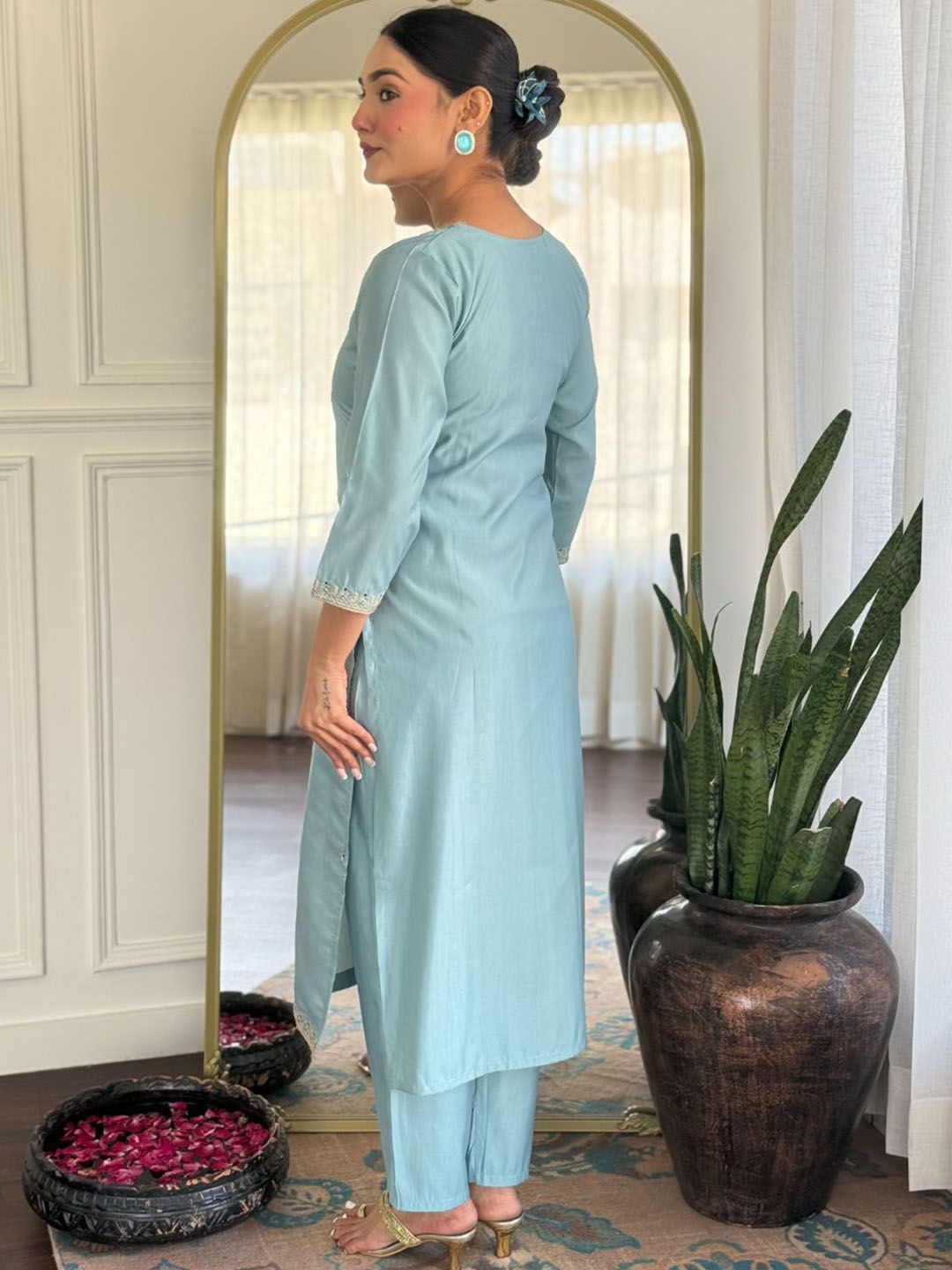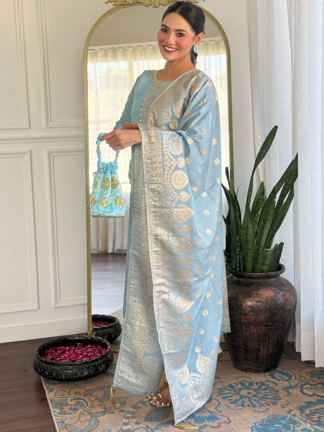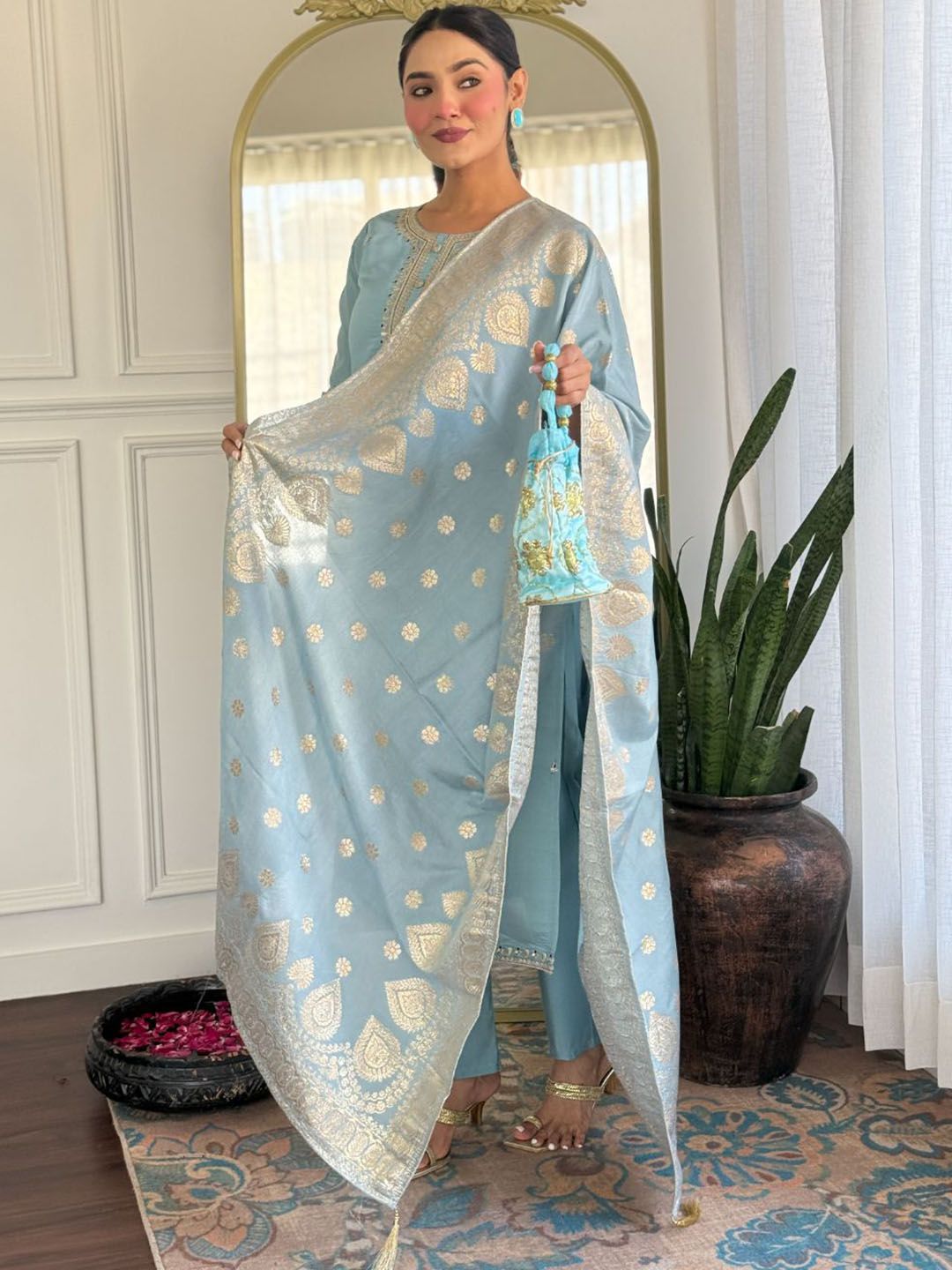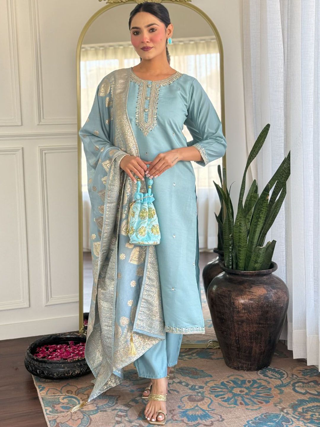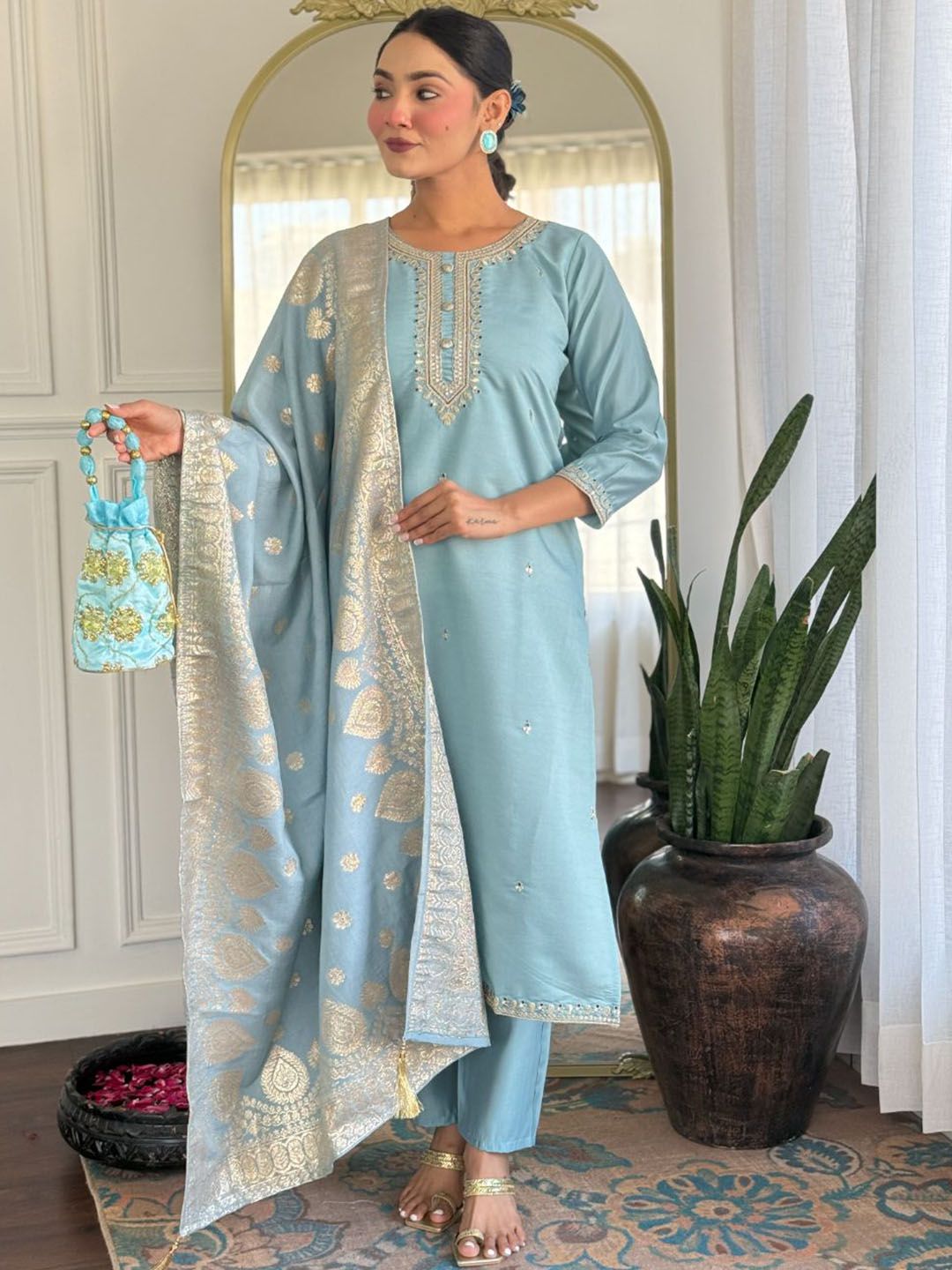 KALINI Women Woven Design Embroidered Kurta with Trousers & Dupatta