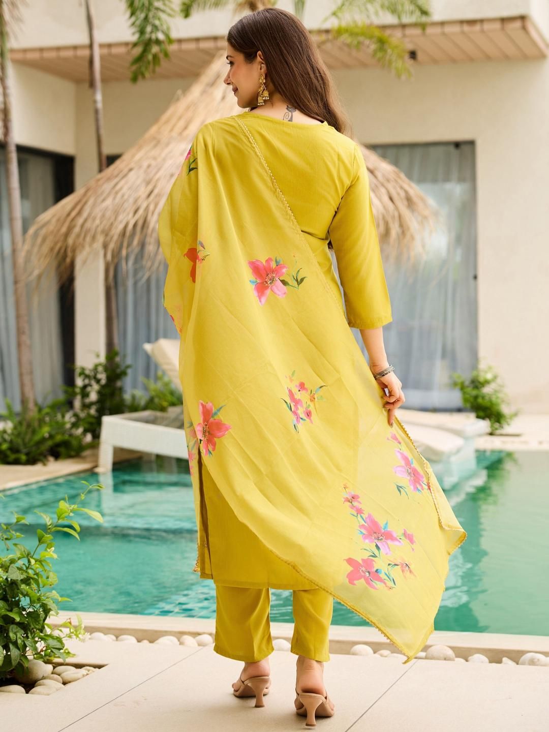 KALINI Women Yellow Floral Embroidered Rayon V-Neck Kurta With Trouser & Dupatta
