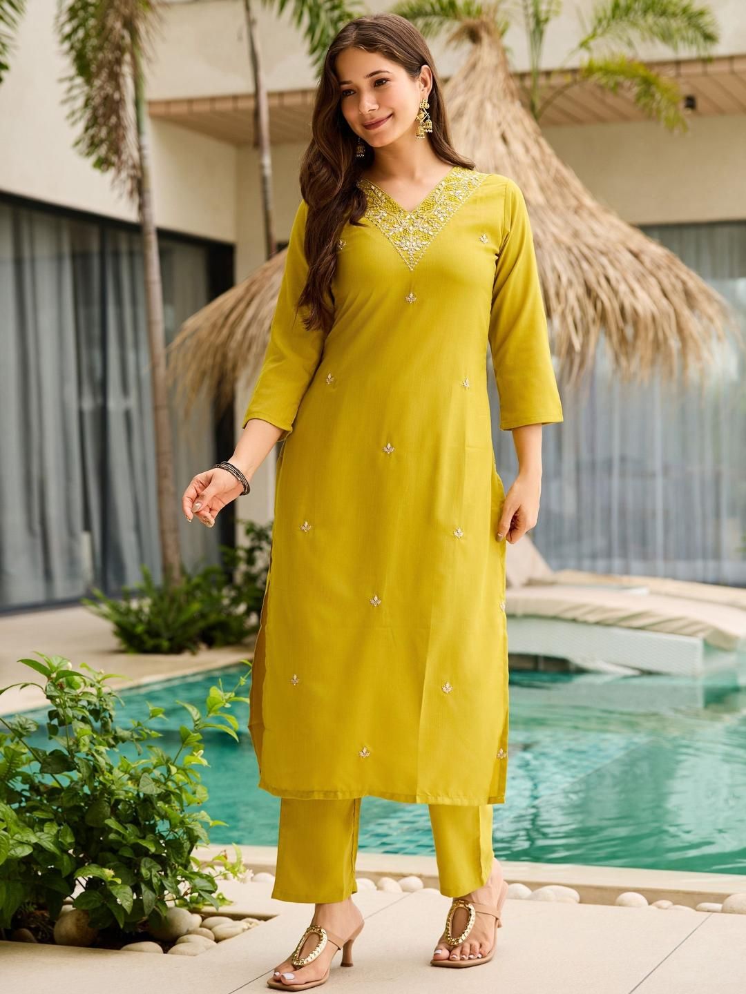 Buy this stylish KALINI Women Yellow Floral Embroidered Rayon V-Neck Kurta With Trouser & Dupatta at Marincart Nepal. This product offers great quality and value. Perfect for those looking for the latest trends in fashion. Get yours now at unbeatable prices.