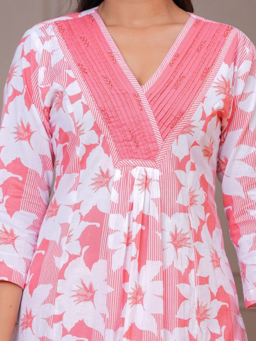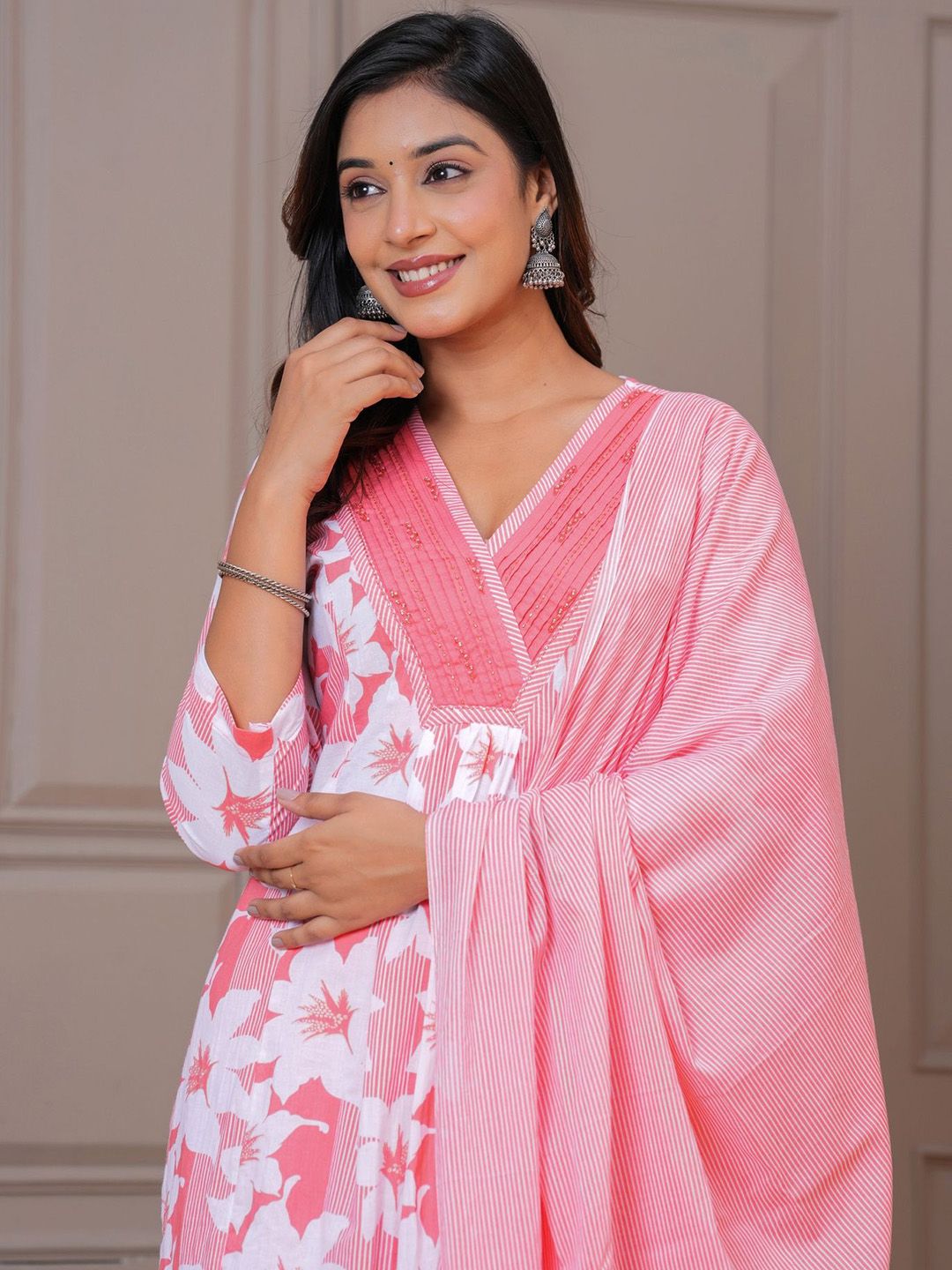 Kanahari Floral Printed V-Neck Pure Cotton Kurta With Trousers & Dupatta