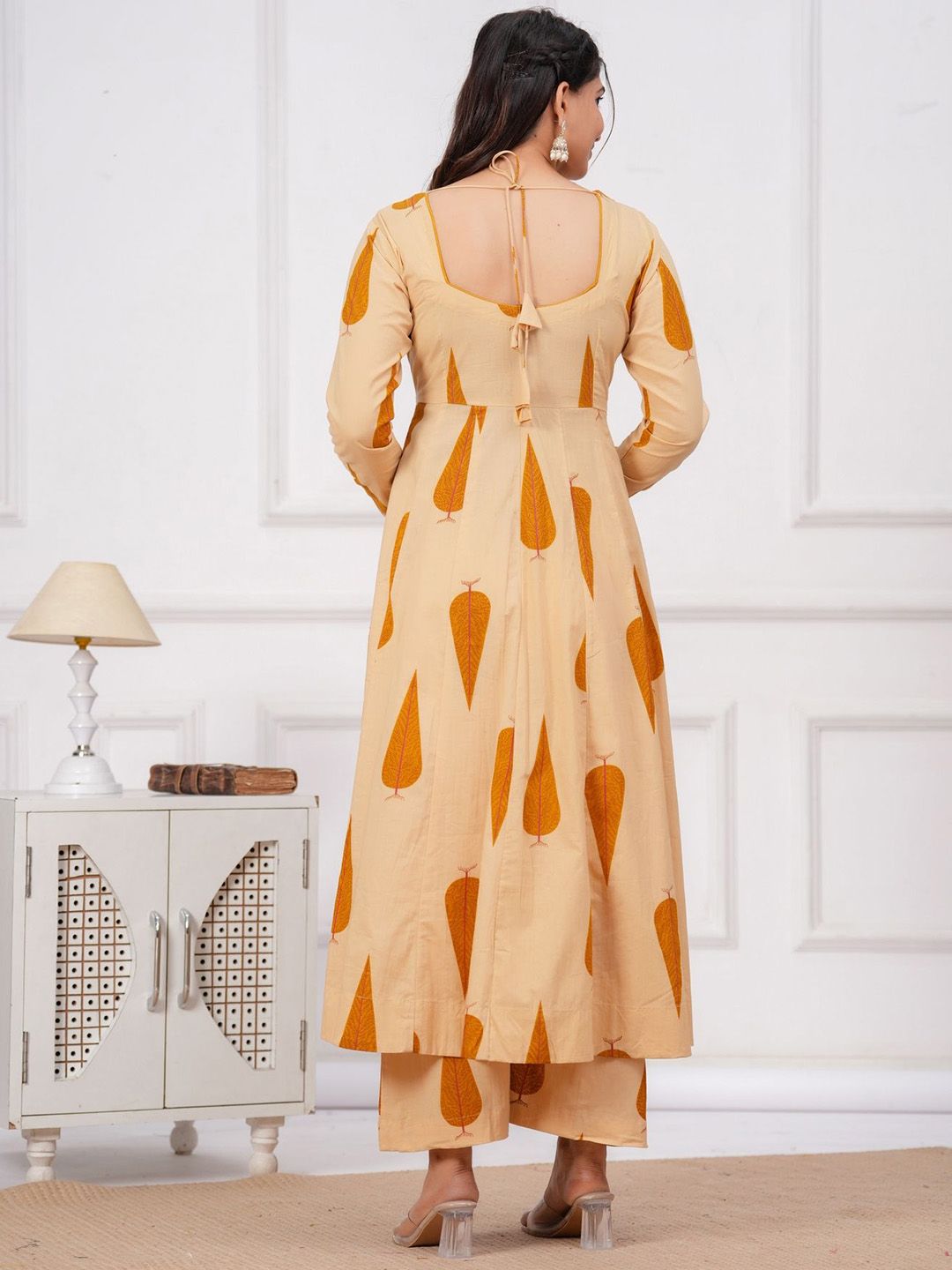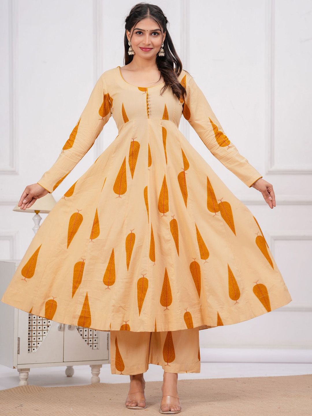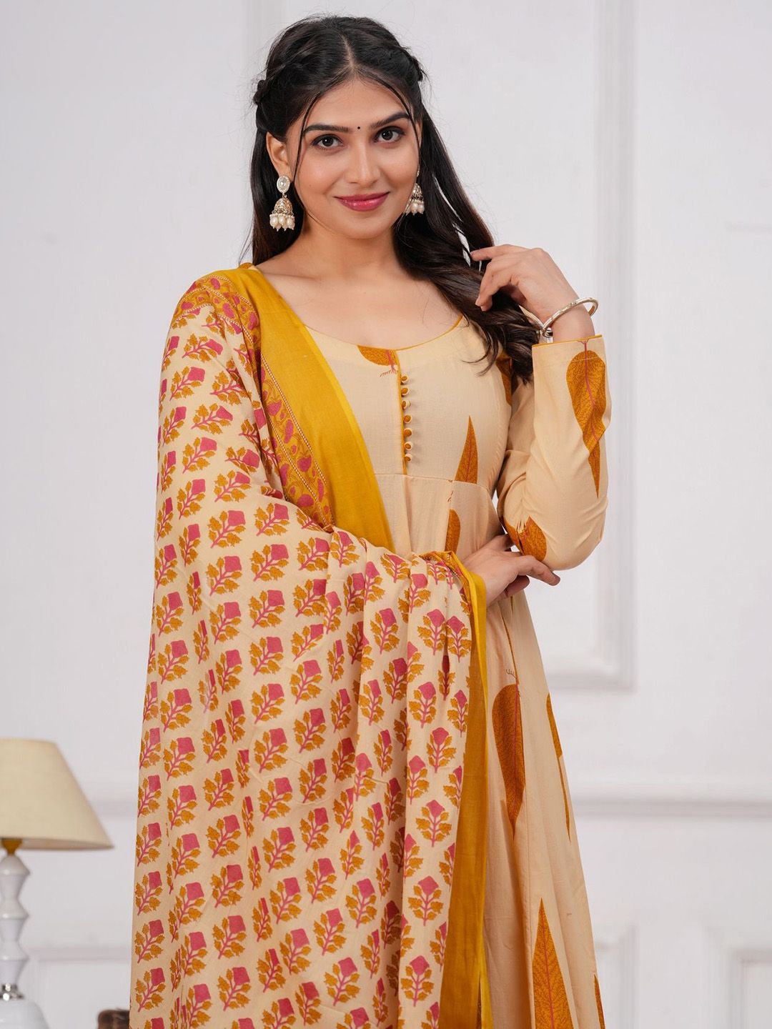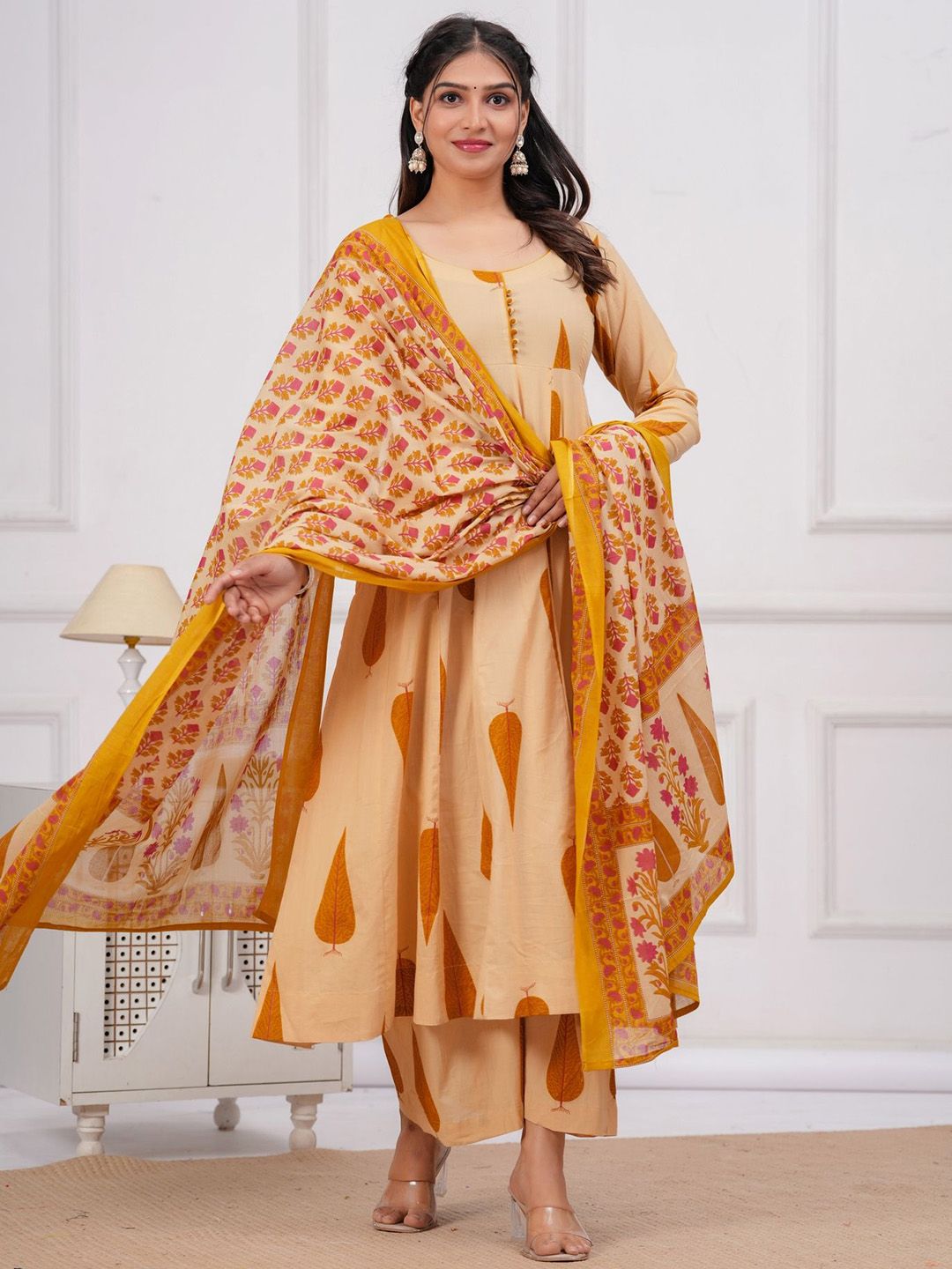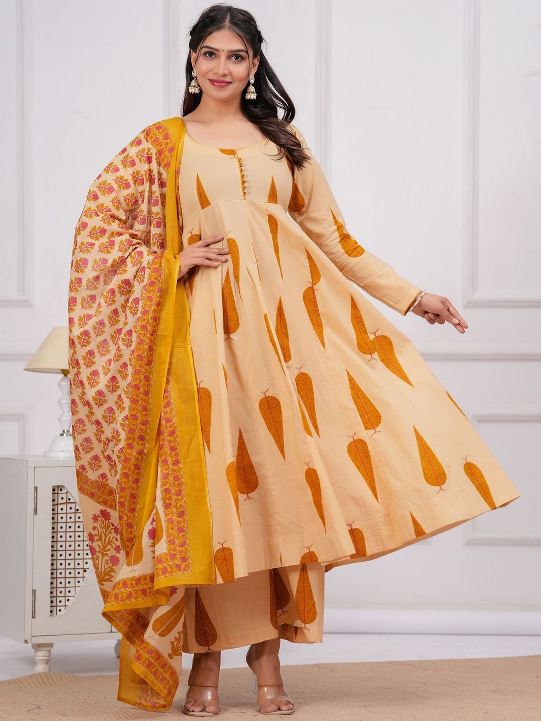Kanahari Women Ethnic Motifs Leaf Print Pure Cotton Anarkali Kurta with Trousers & Dupatta