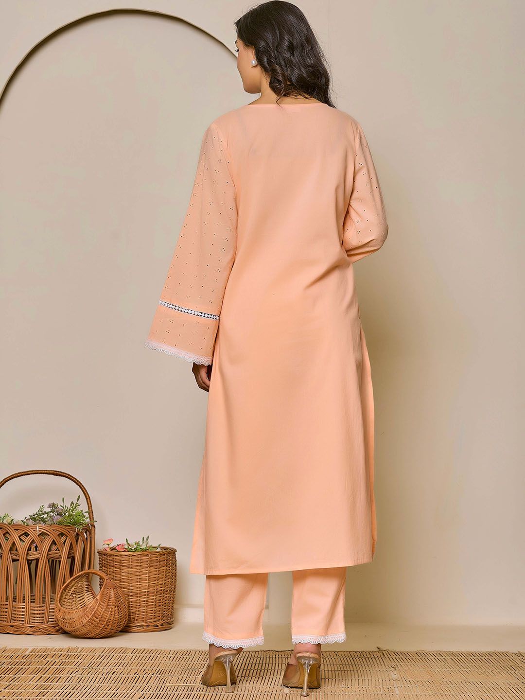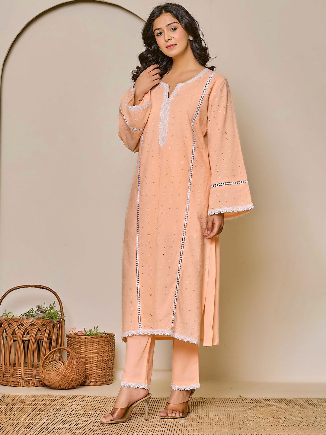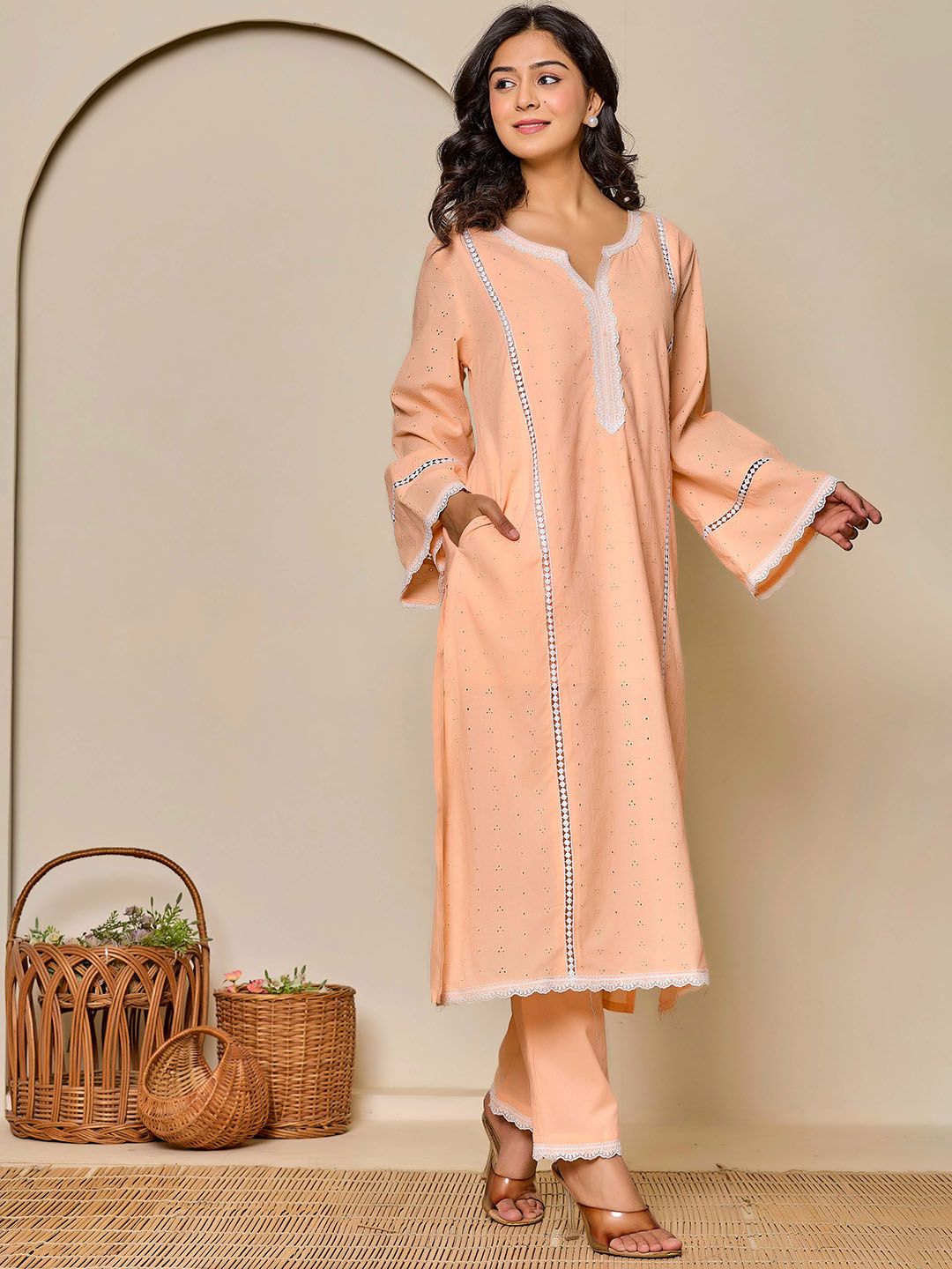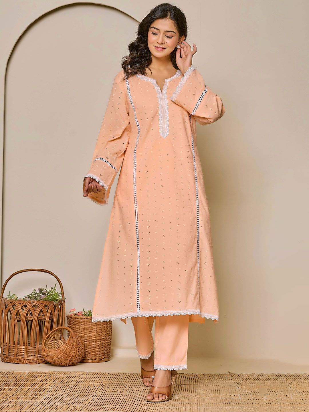 KASYA Women Schiffli Embroidered Regular Pure Cotton Kurta with Trousers
