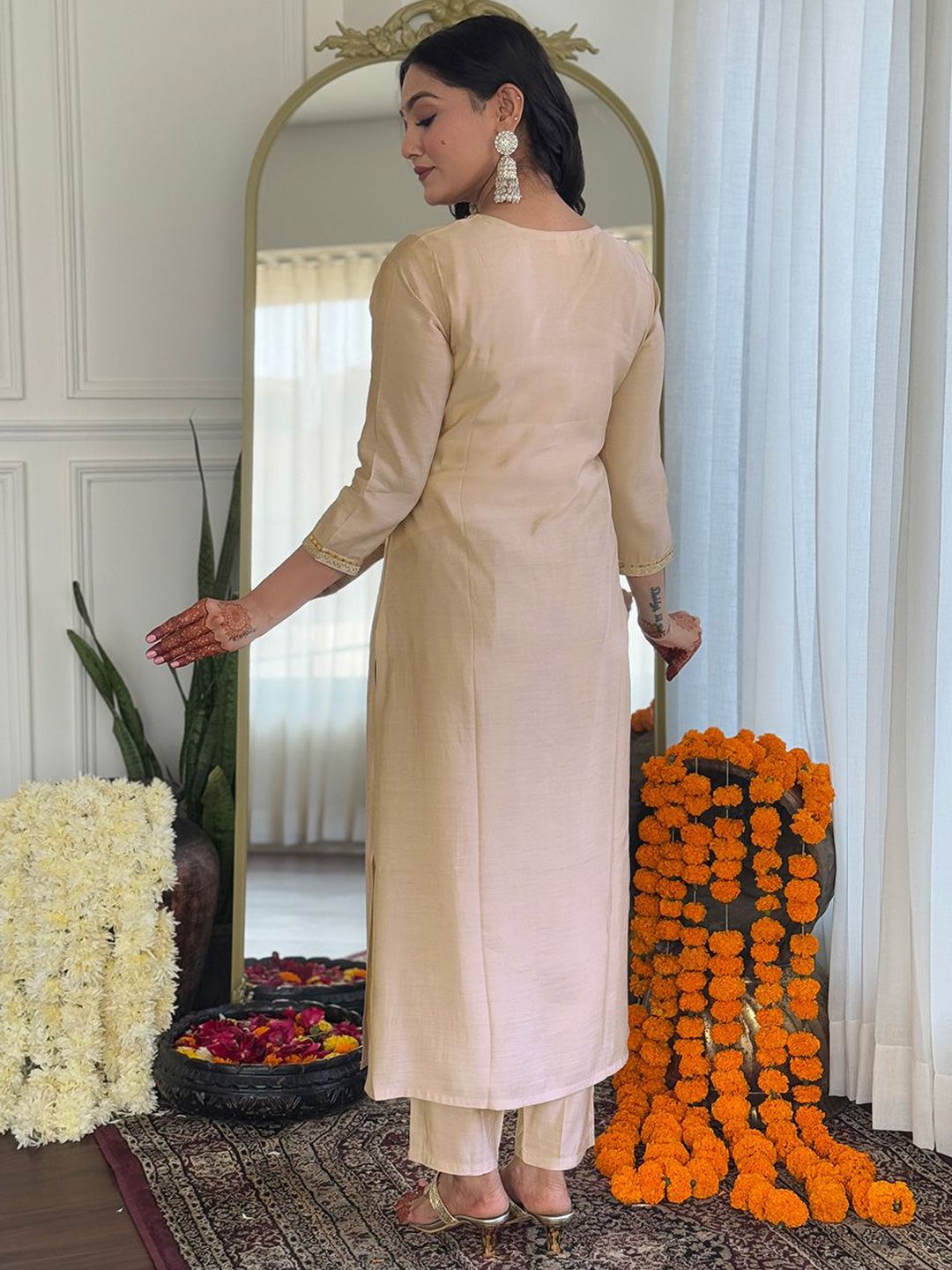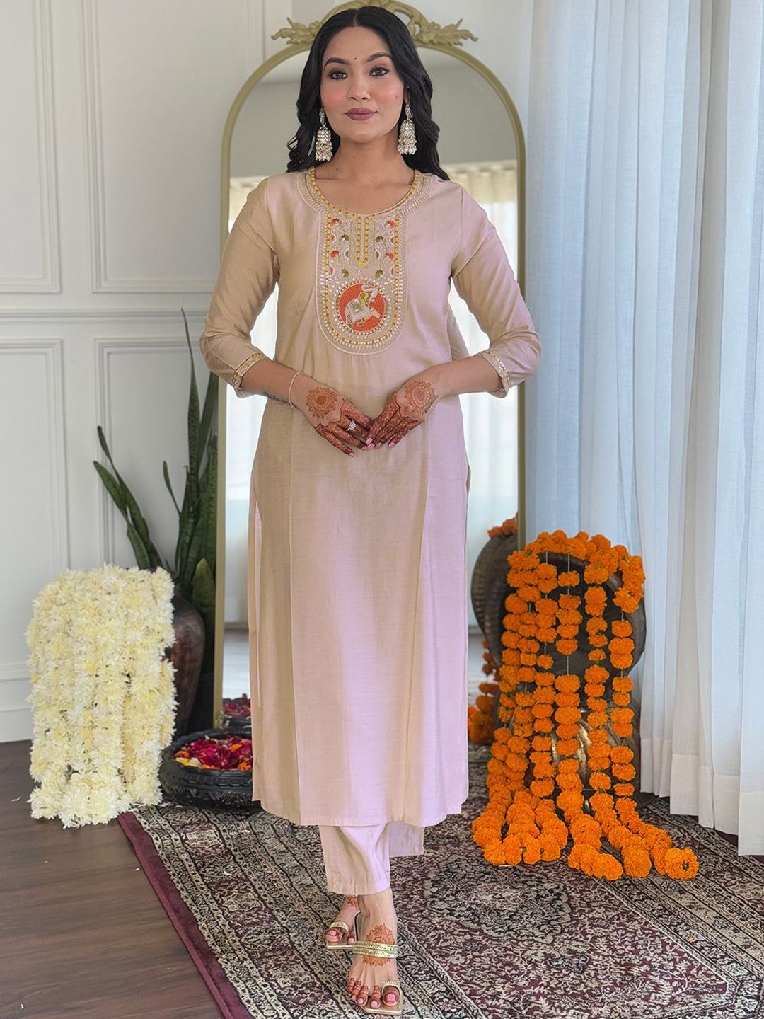 KAUTIK FABRICS Ethnic Motifs Embroidered Sequinned Straight Kurta With Trousers & Dupatta