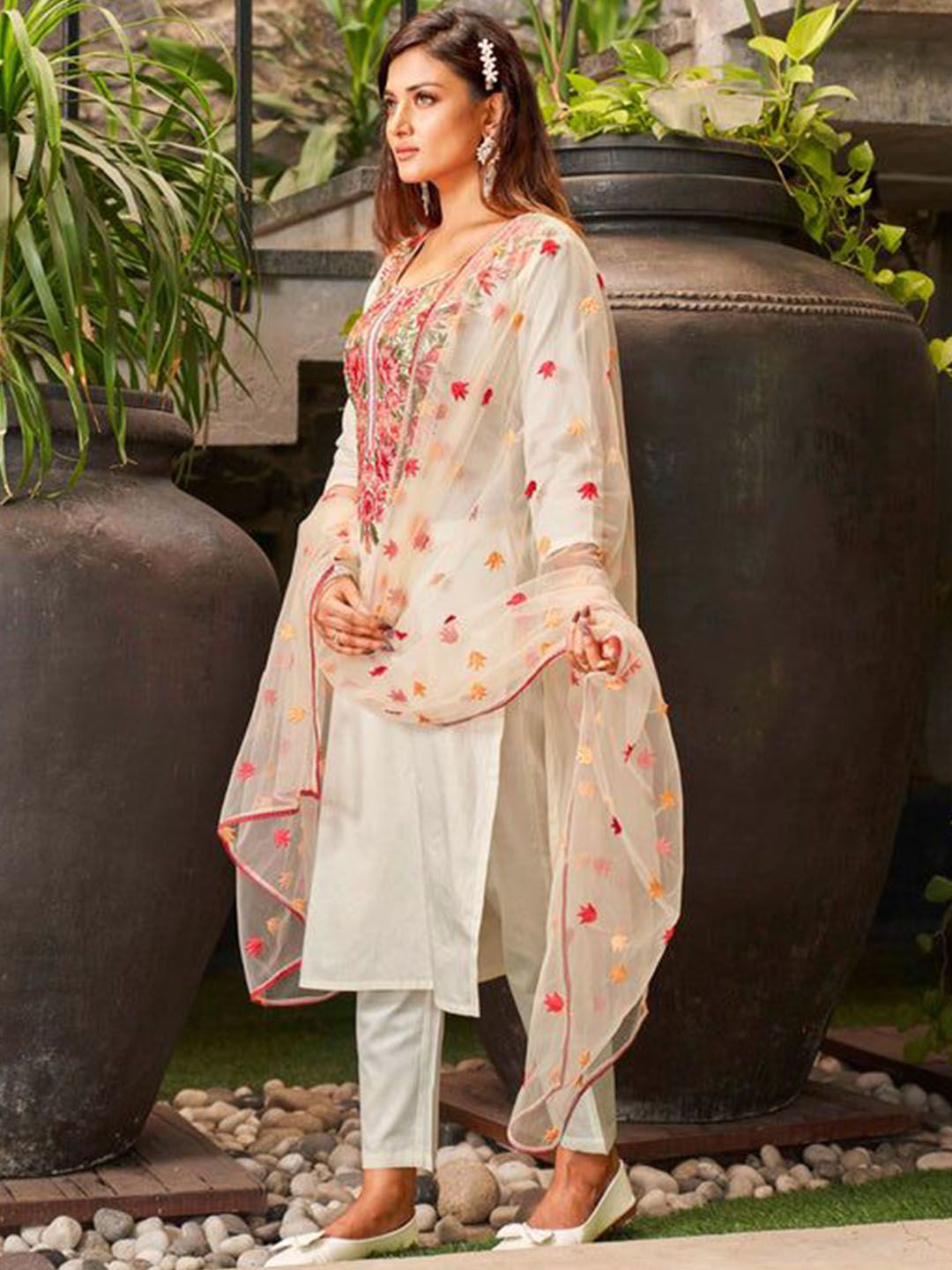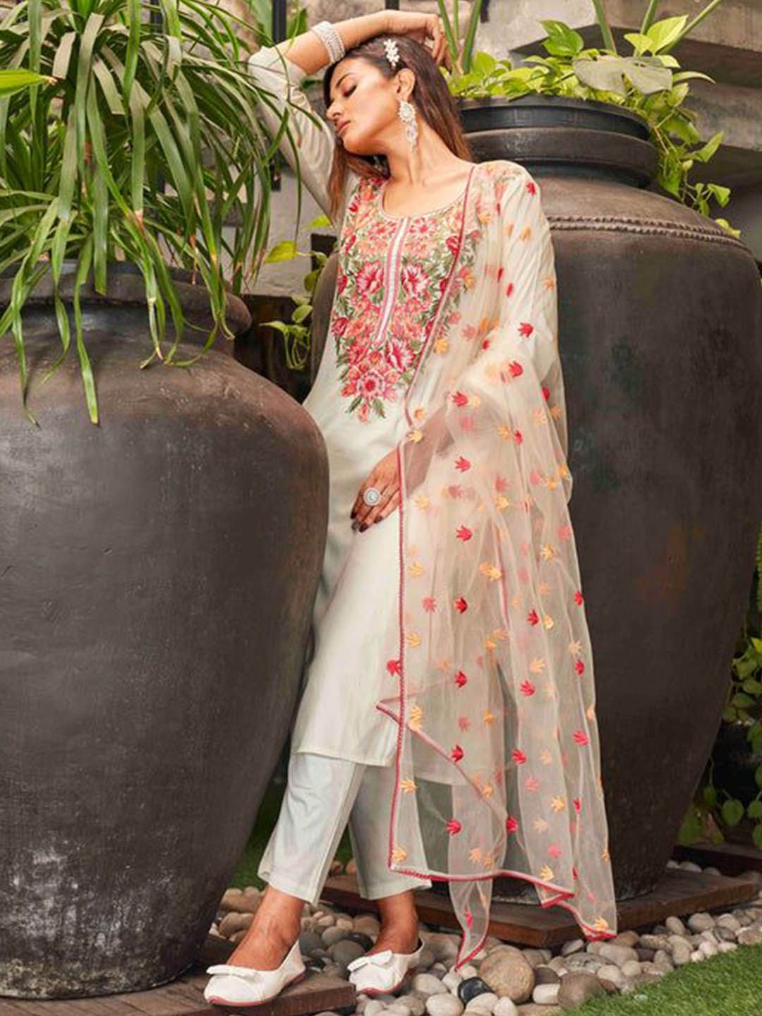 KAUTIK FABRICS Floral Embroidered Round Thread Work Kurta With Trousers & Dupatta