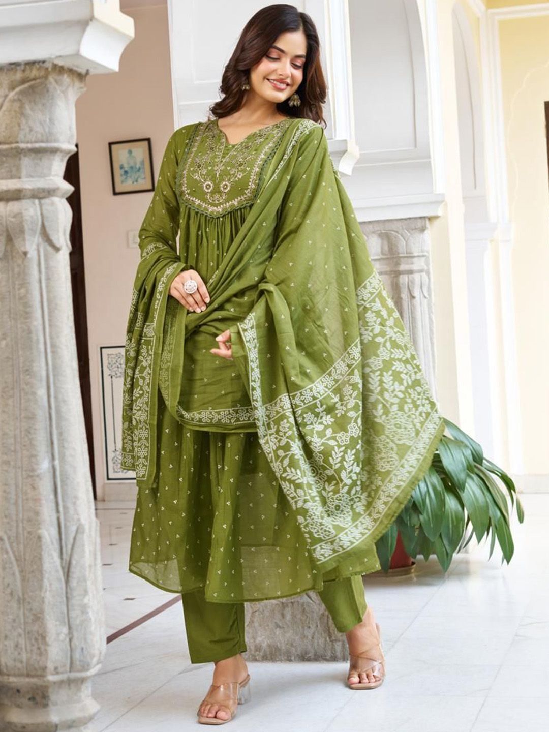 KAUTIK FABRICS Floral Embroidered Thread Work V-Neck Kurta With Trousers & Dupatta