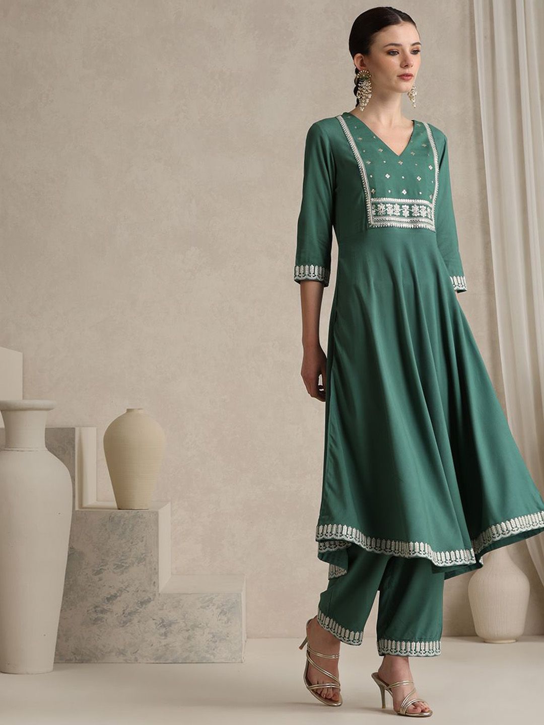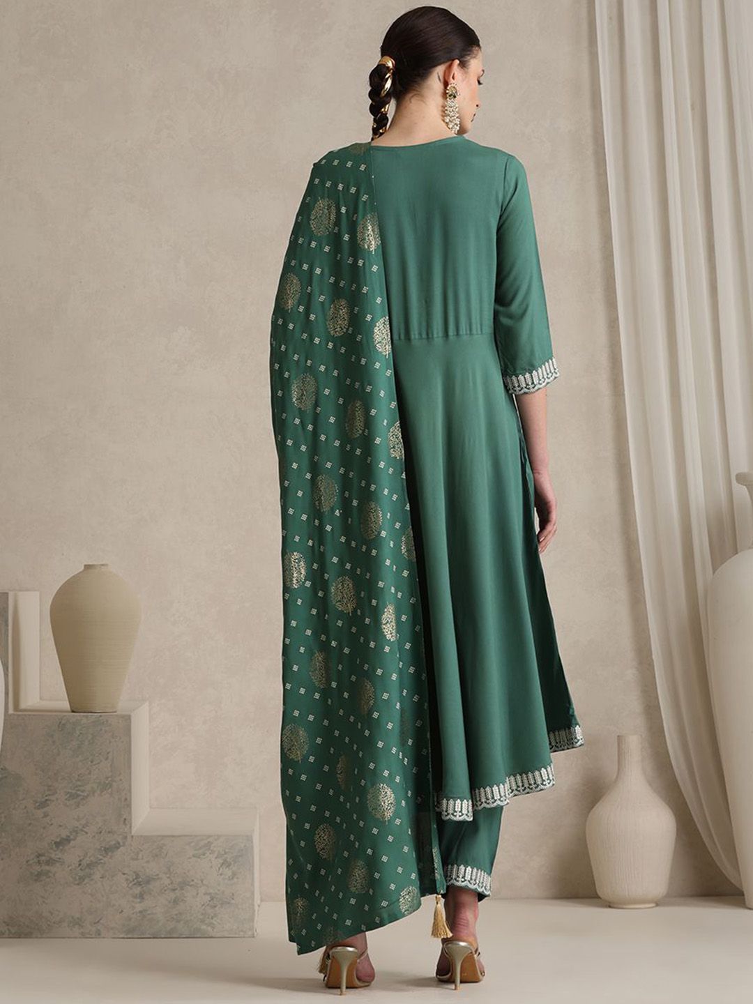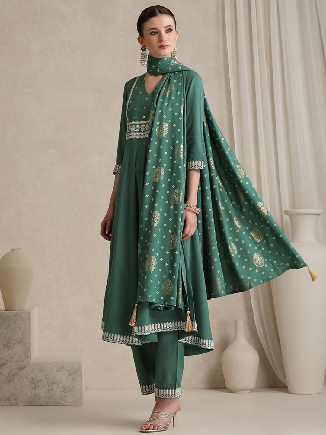 Khushal K Ethnic Motifs Embroidered Anarkali Sequinned Kurta With Palazzos & Dupatta