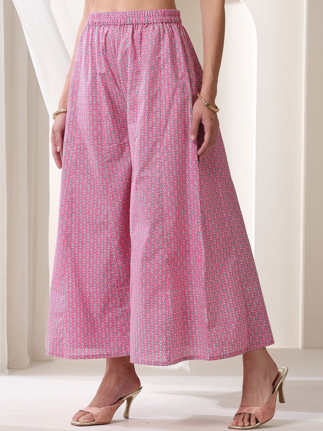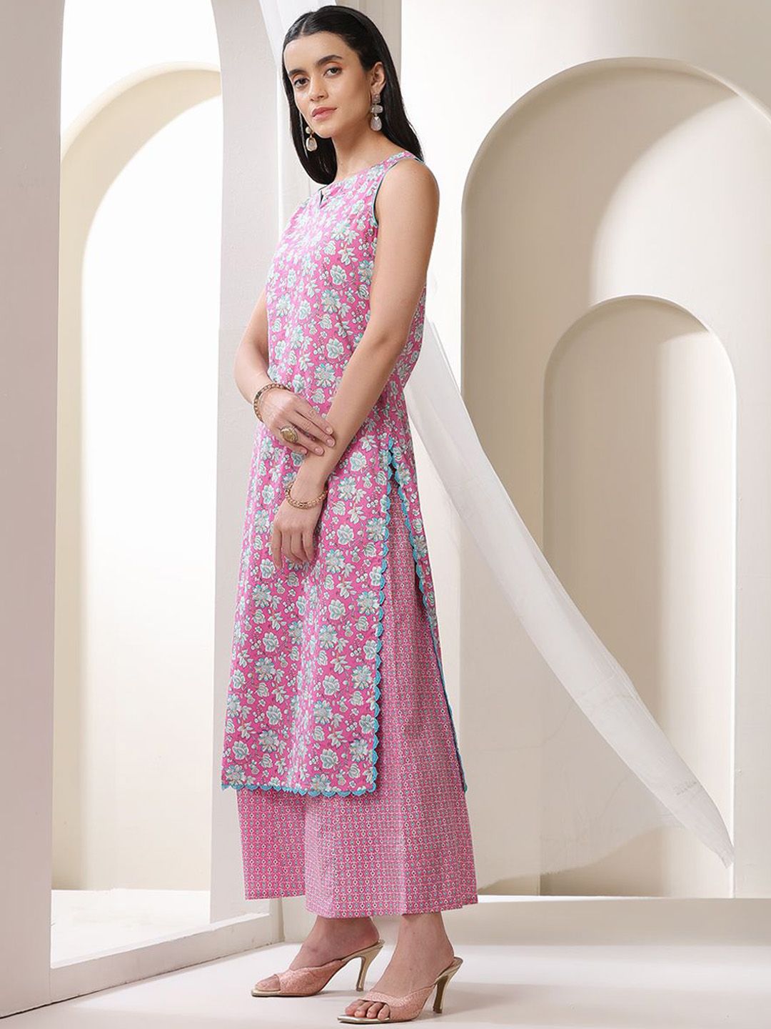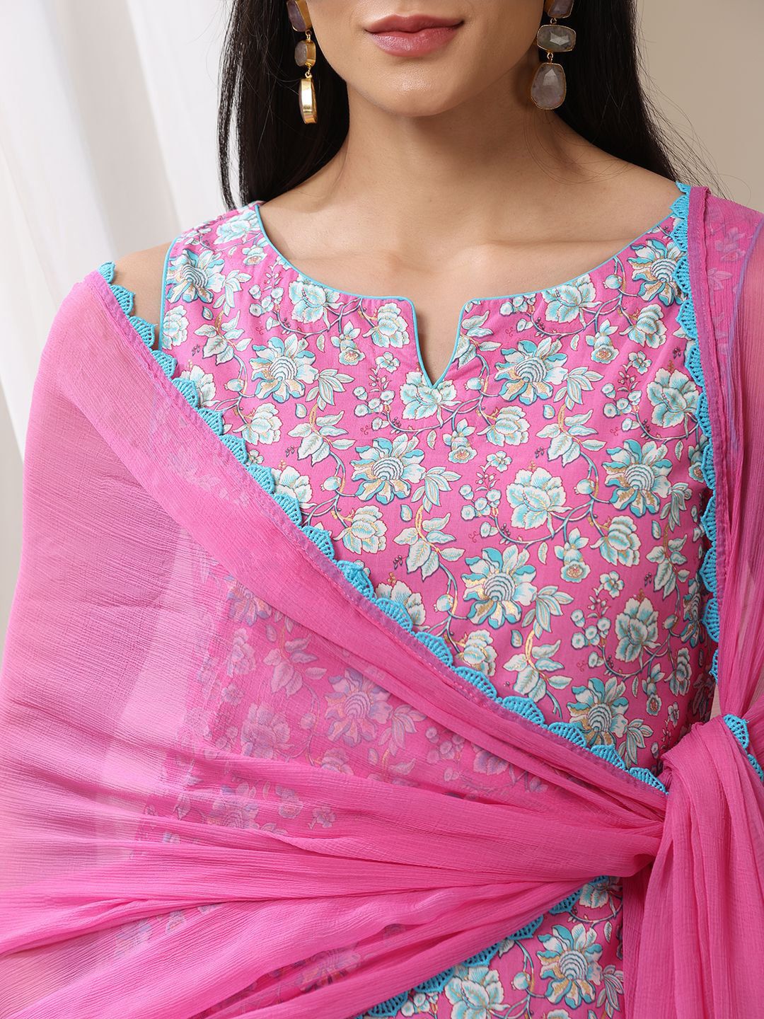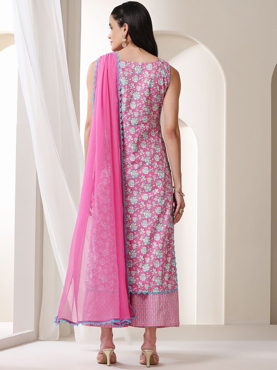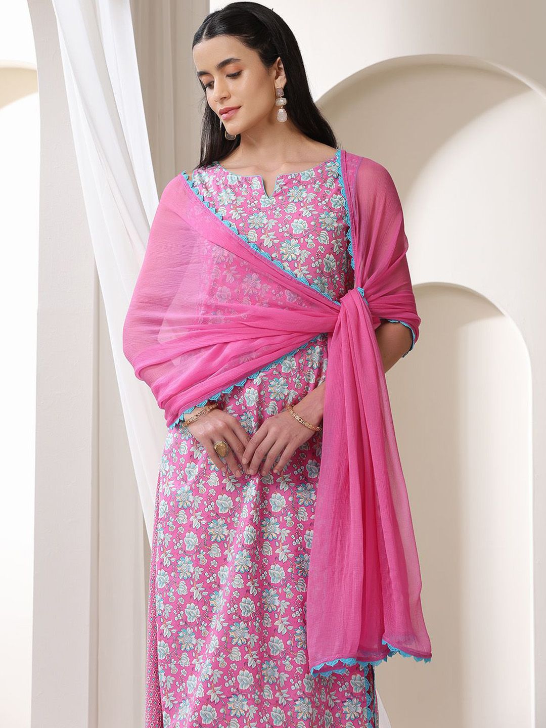 Khushal K Floral Printed Notch Neck Cotton Straight Kurta With Palazzos & Dupatta