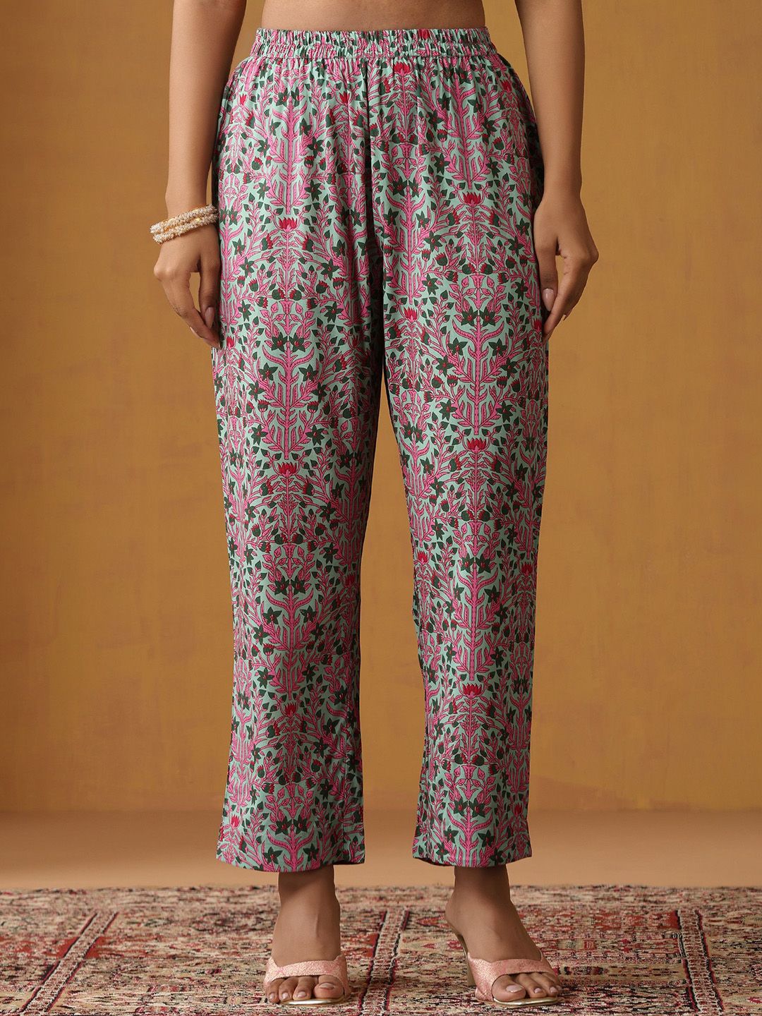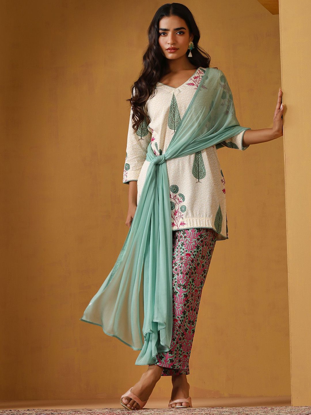 Khushal K Floral Printed V-Neck Pure Cotton Straight Kurta With Palazzo & Dupatta