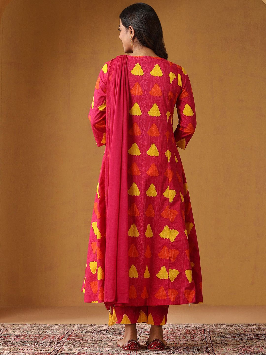 Khushal K Geometric Printed V-Neck Pure Cotton A-Line Kurta With Trousers & Dupatta