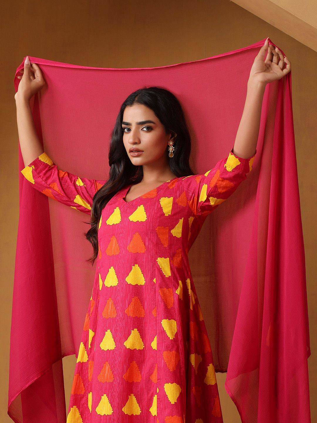 Buy this stylish Khushal K Geometric Printed V-Neck Pure Cotton A-Line Kurta With Trousers & Dupatta at Marincart Nepal. This product offers great quality and value. Perfect for those looking for the latest trends in fashion. Get yours now at unbeatable prices.