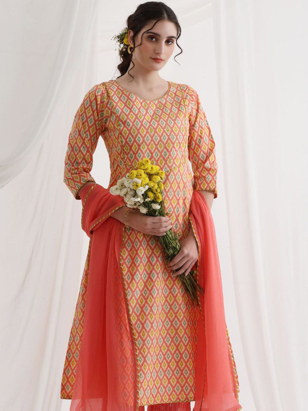 Buy this stylish Khushal K Women Geometric Printed Pure Cotton A-Line Kurta with Palazzos & Dupatta at Marincart Nepal. This product offers great quality and value. Perfect for those looking for the latest trends in fashion. Get yours now at unbeatable prices.