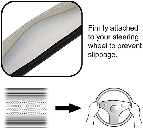 Breathable and Non-slip: The non-slip lining ensures a constant reliable grip. In summer, your steering wheel will no longer be a piece of hot coal. Greater safety: Better grip at the wheel that gives you more control on the road. New Style: Upgrade your vehicle instantly with this stunning luxury leather steering wheel cover with sporty accents and add some flair to your vehicle. Fits Most Cars: Fits all standard size steering wheels from 14.5 to 15.5 inches in diameter. Easy to Install: Slides directly onto the steering wheel and instantly improves the appearance of old or dirty steering wheels.