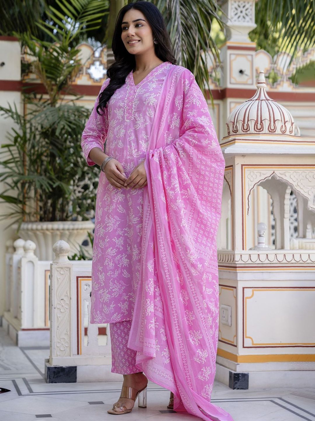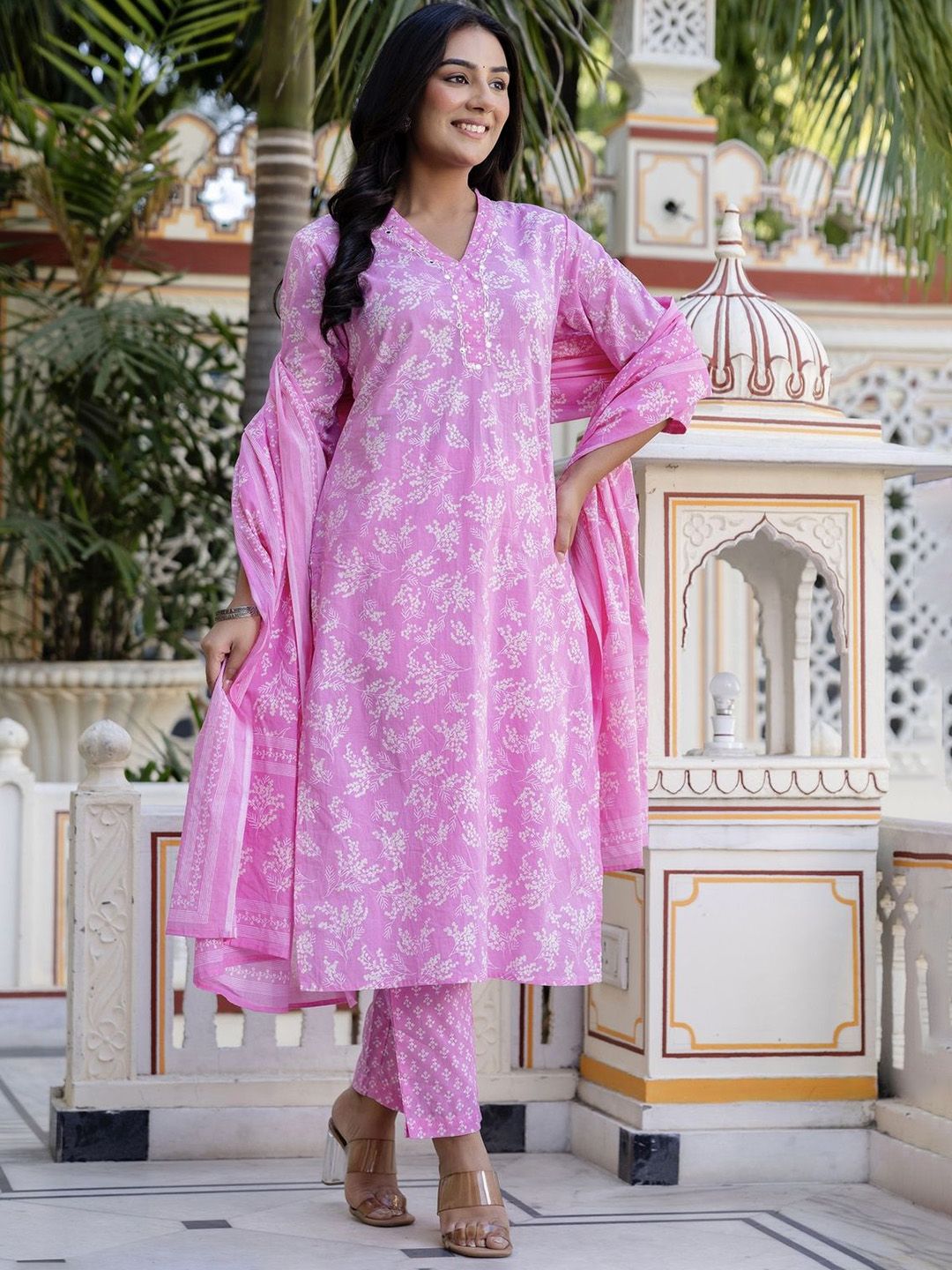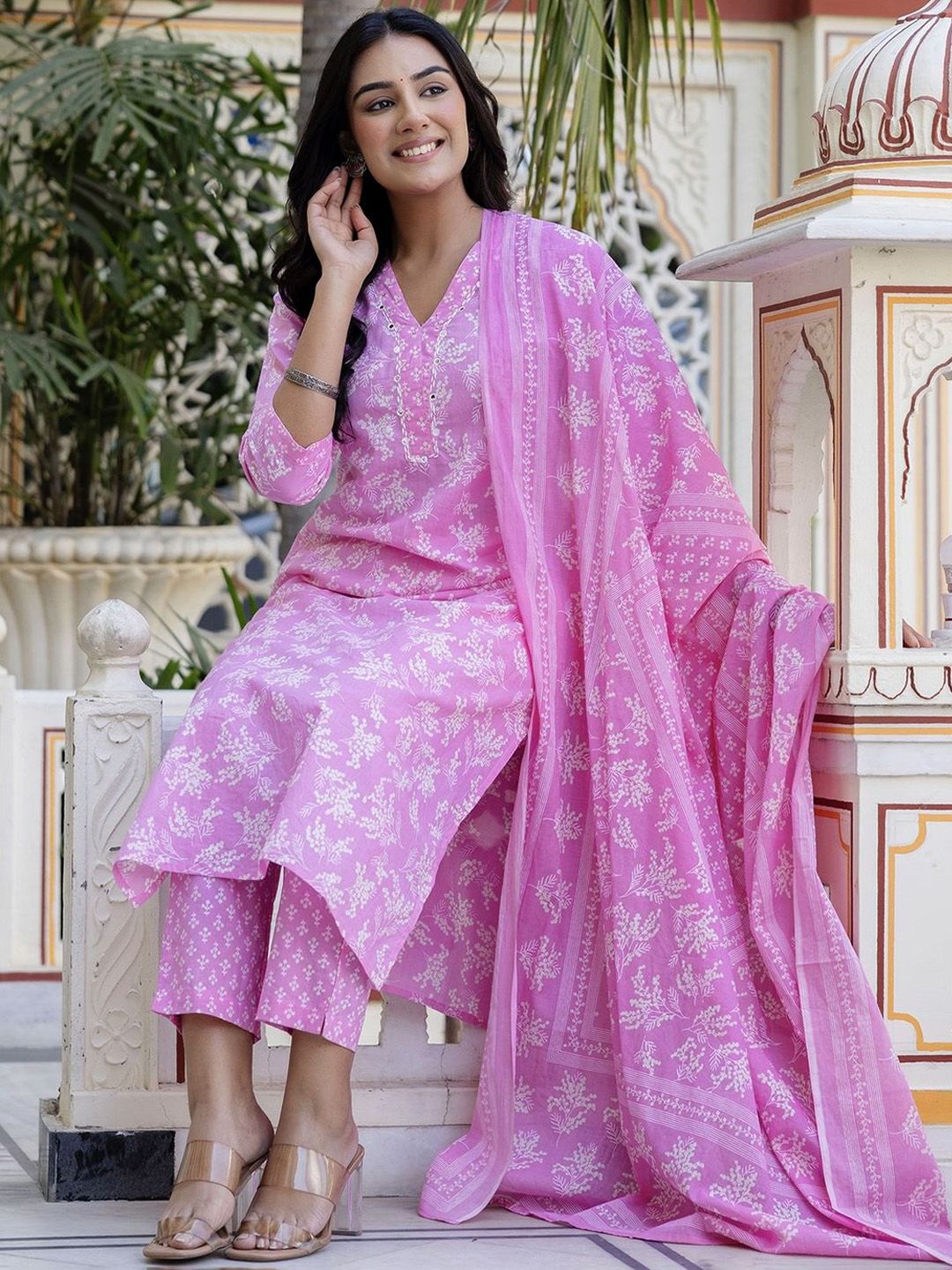Kohsh Floral Printed V Neck Mirror Work Pure Cotton Kurta With Trousers & Dupatta