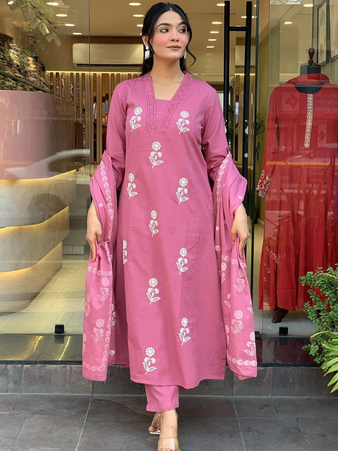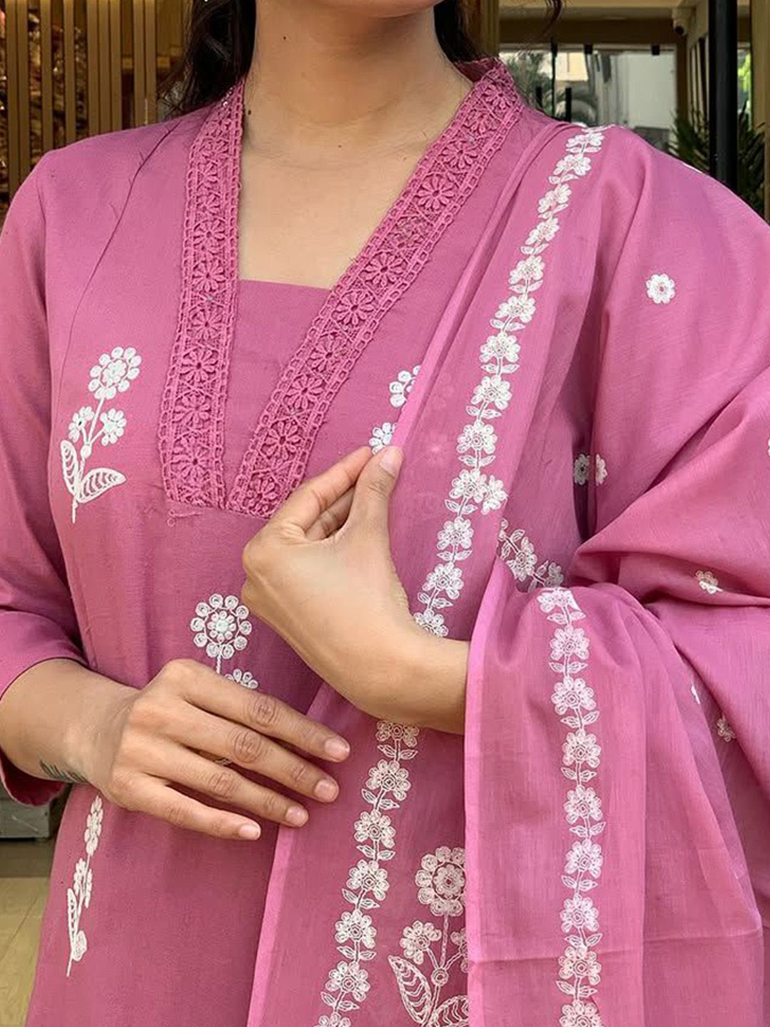 KOTRONS Floral Embroidered V-Neck Thread Work Pure Cotton Kurta With Trousers & Dupatta