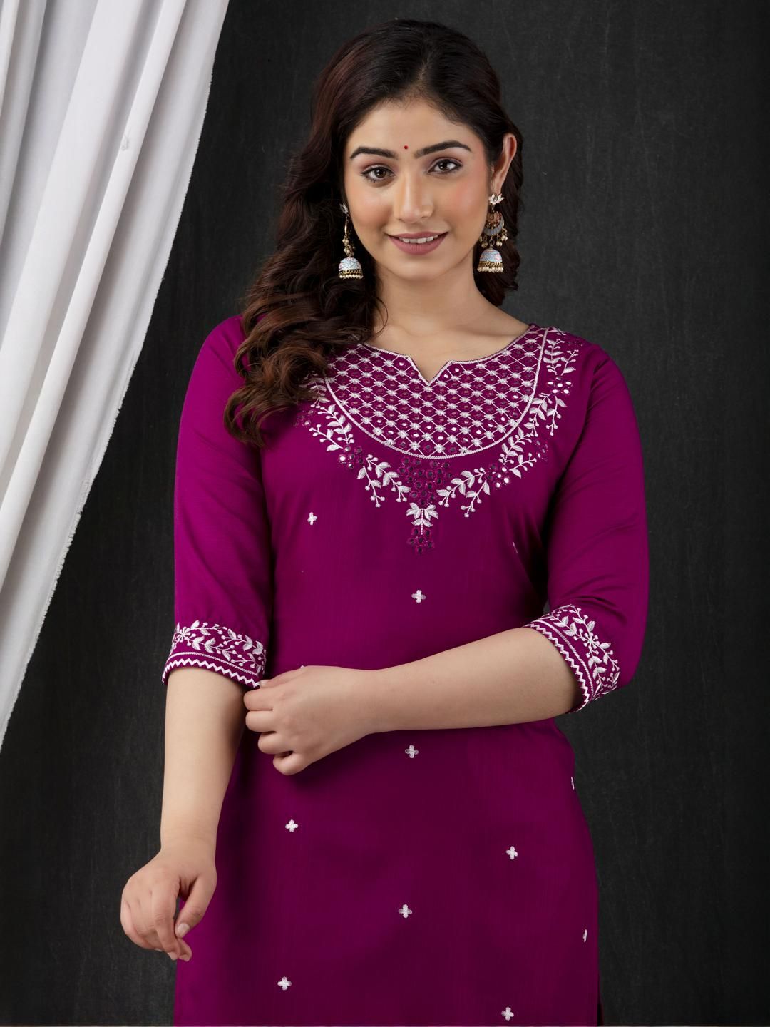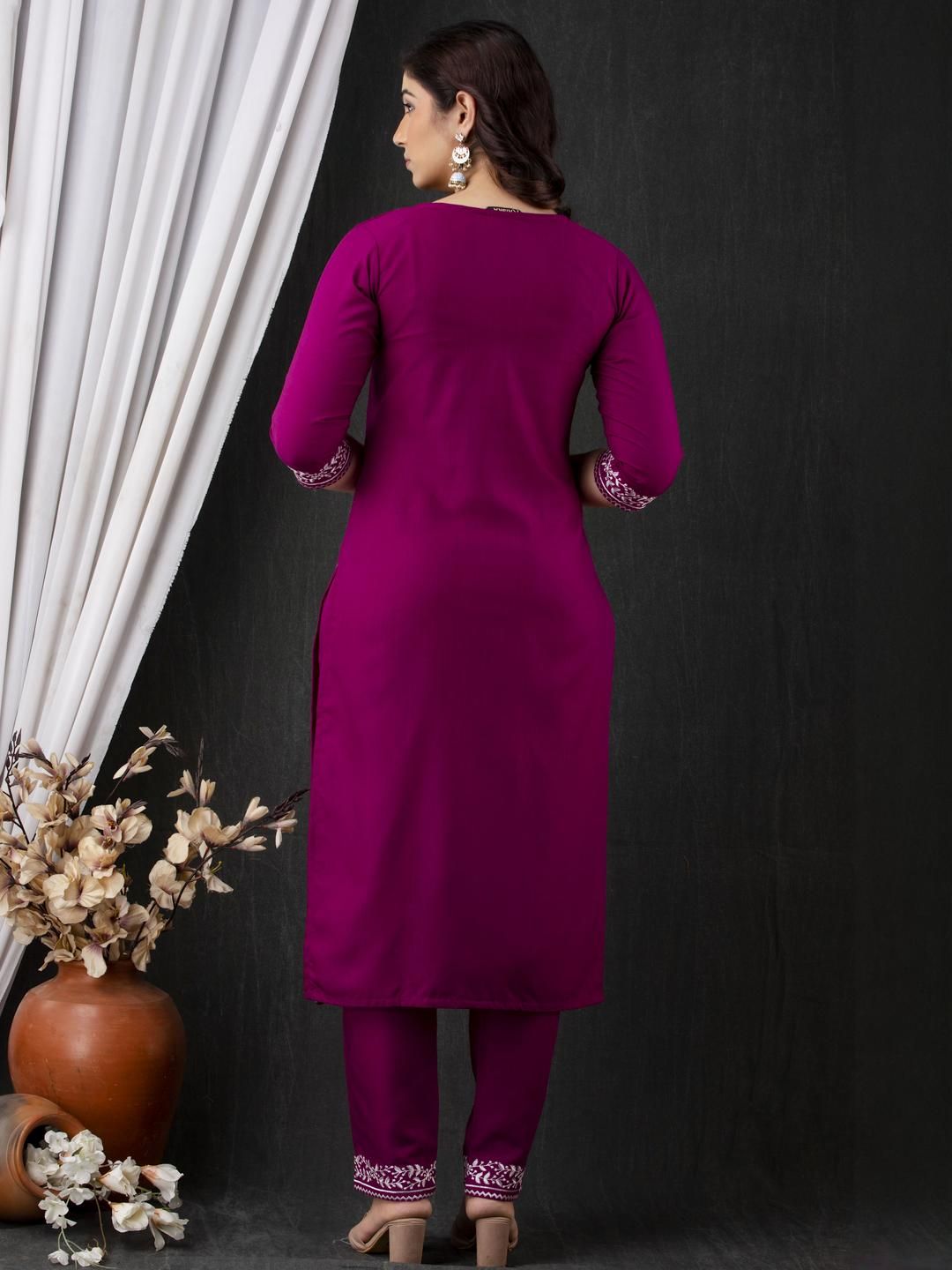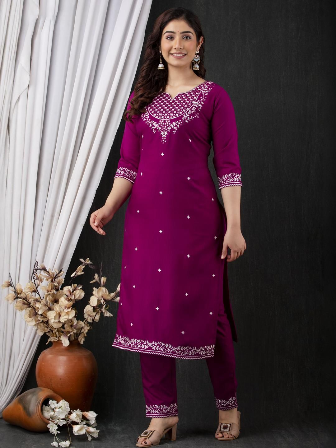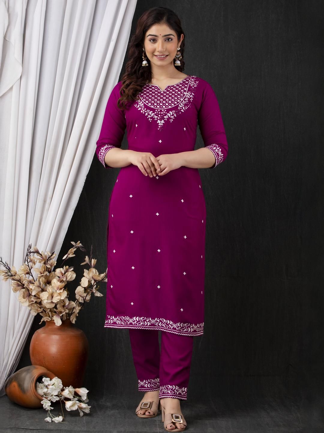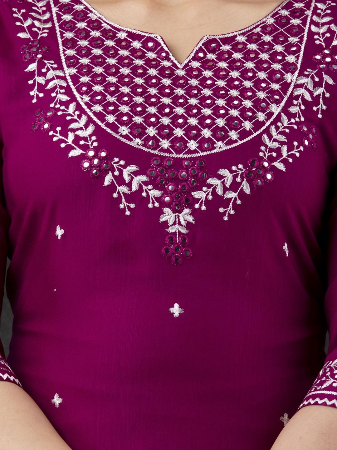 KRISKA Women Magenta & White Viscose Rayon Embroidered Kurta set