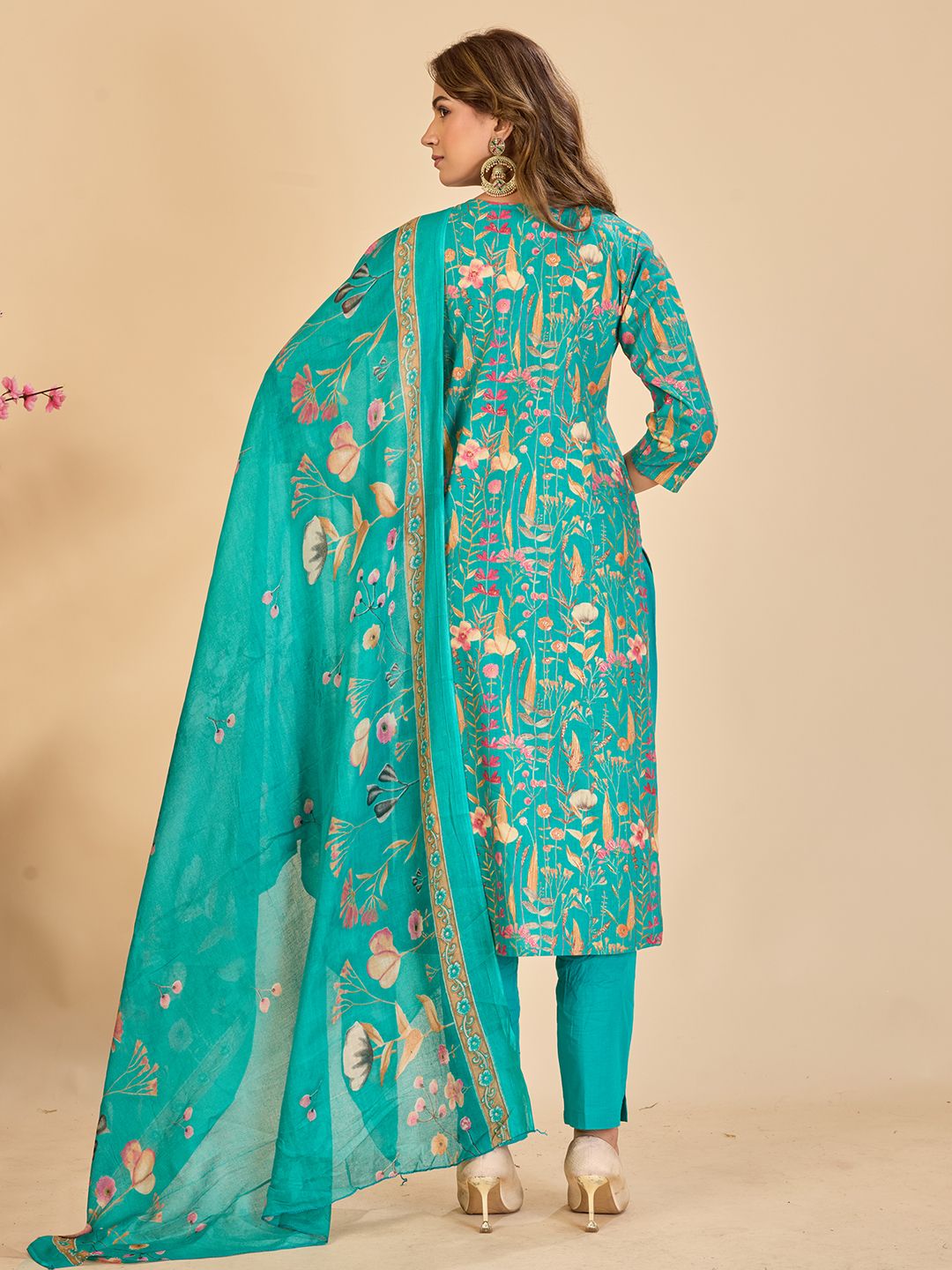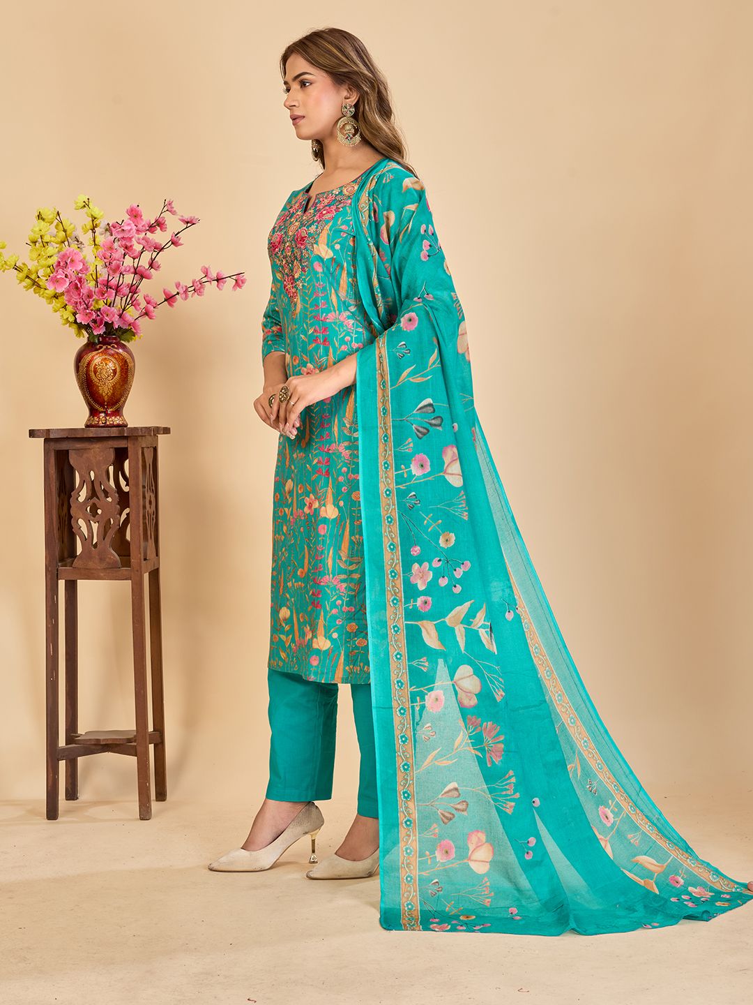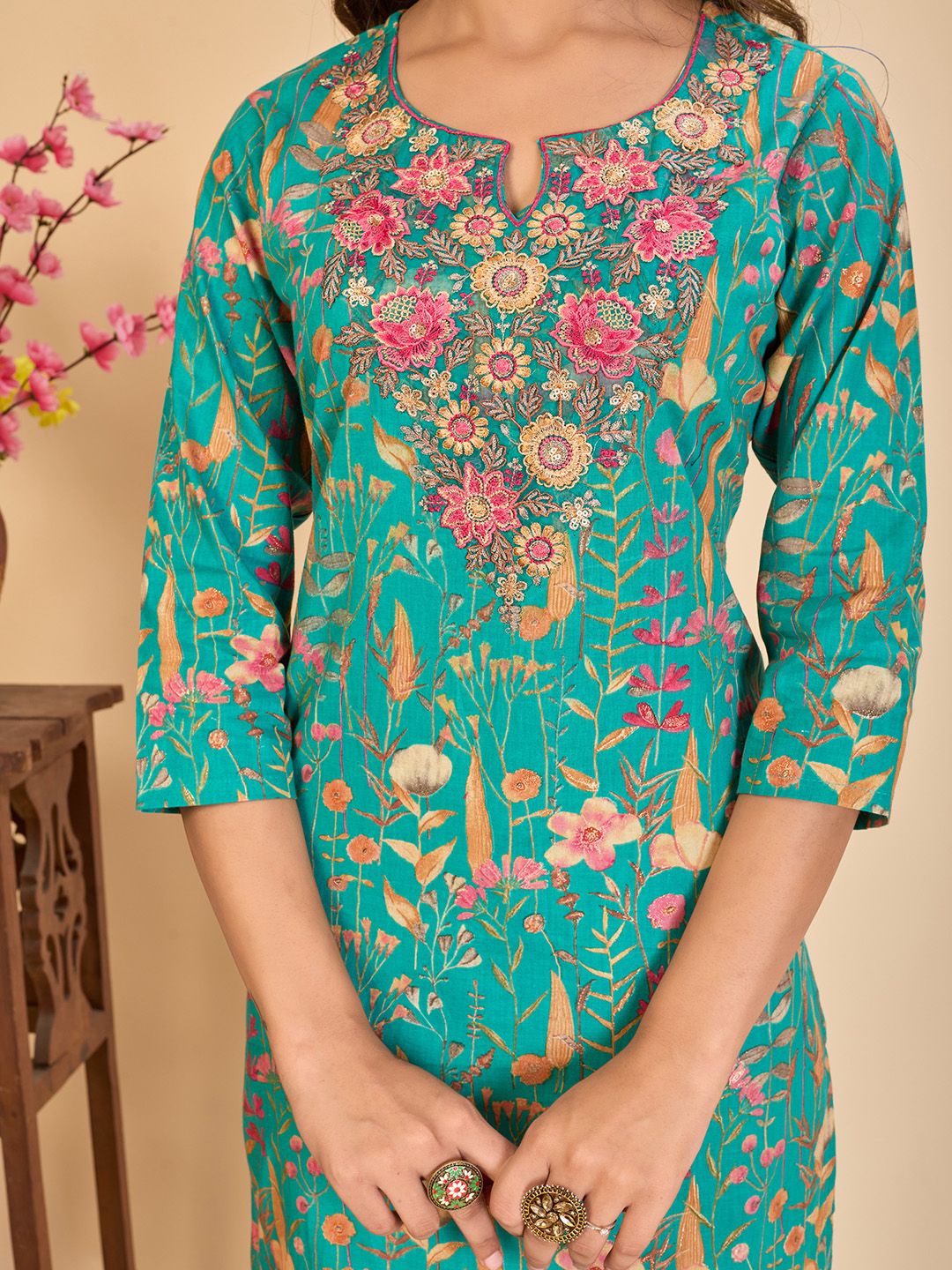 Larqi Floral Embroidered V-Neck Patchwork Pure Cotton Kurta With Trousers & Dupatta