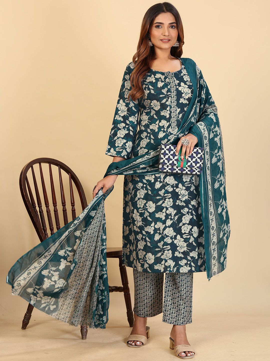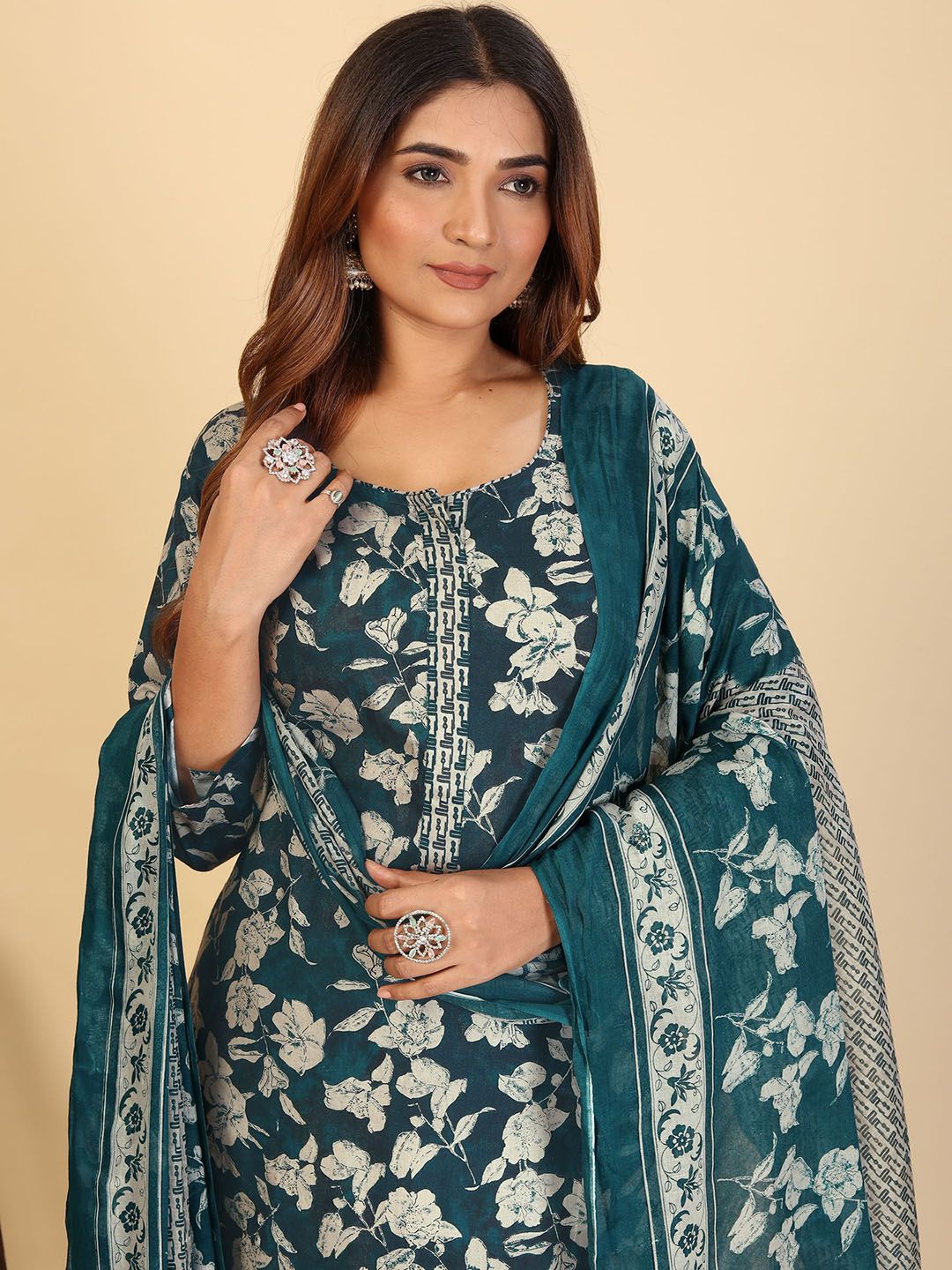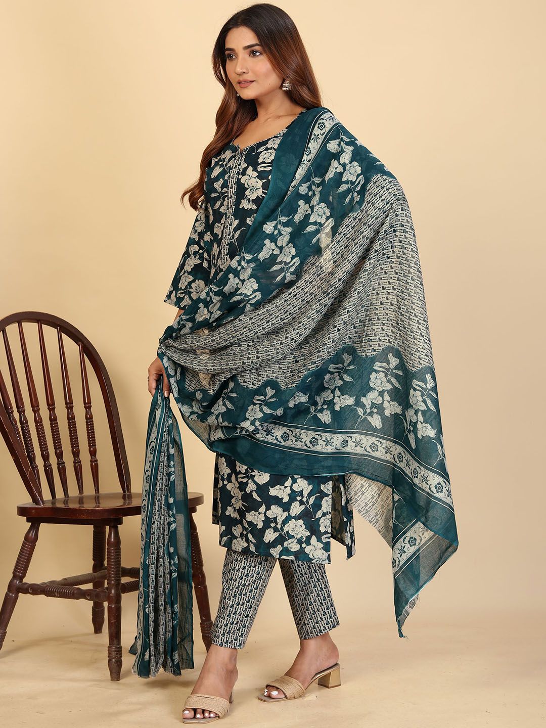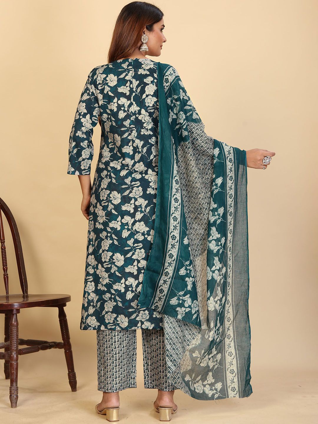 Larqi Women Floral Printed Cotton Kurta with Trousers & Dupatta