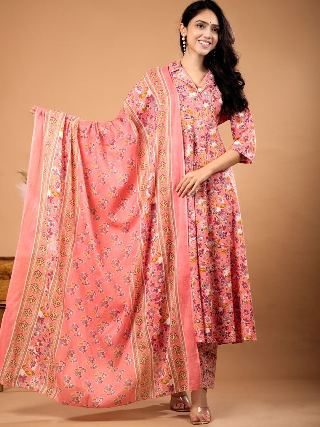 Le Mec Floral Printed Shirt Collar A-Line Pure Cotton Kurta With Trousers & Dupatta