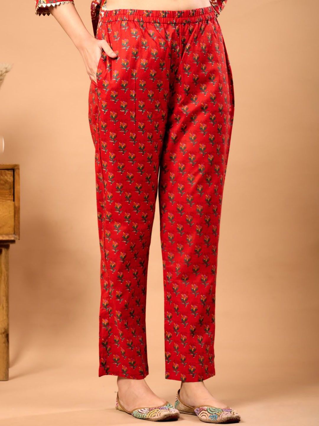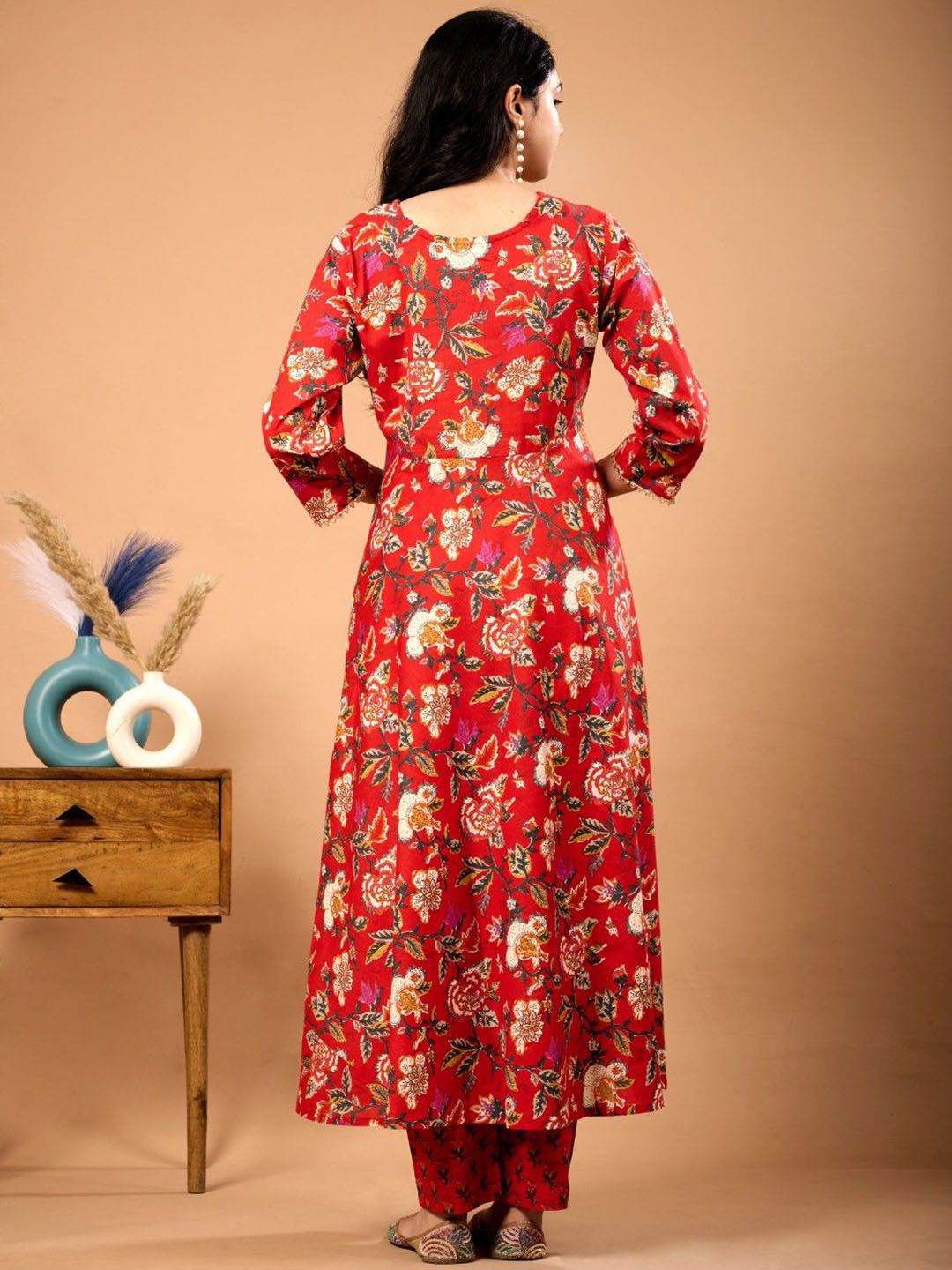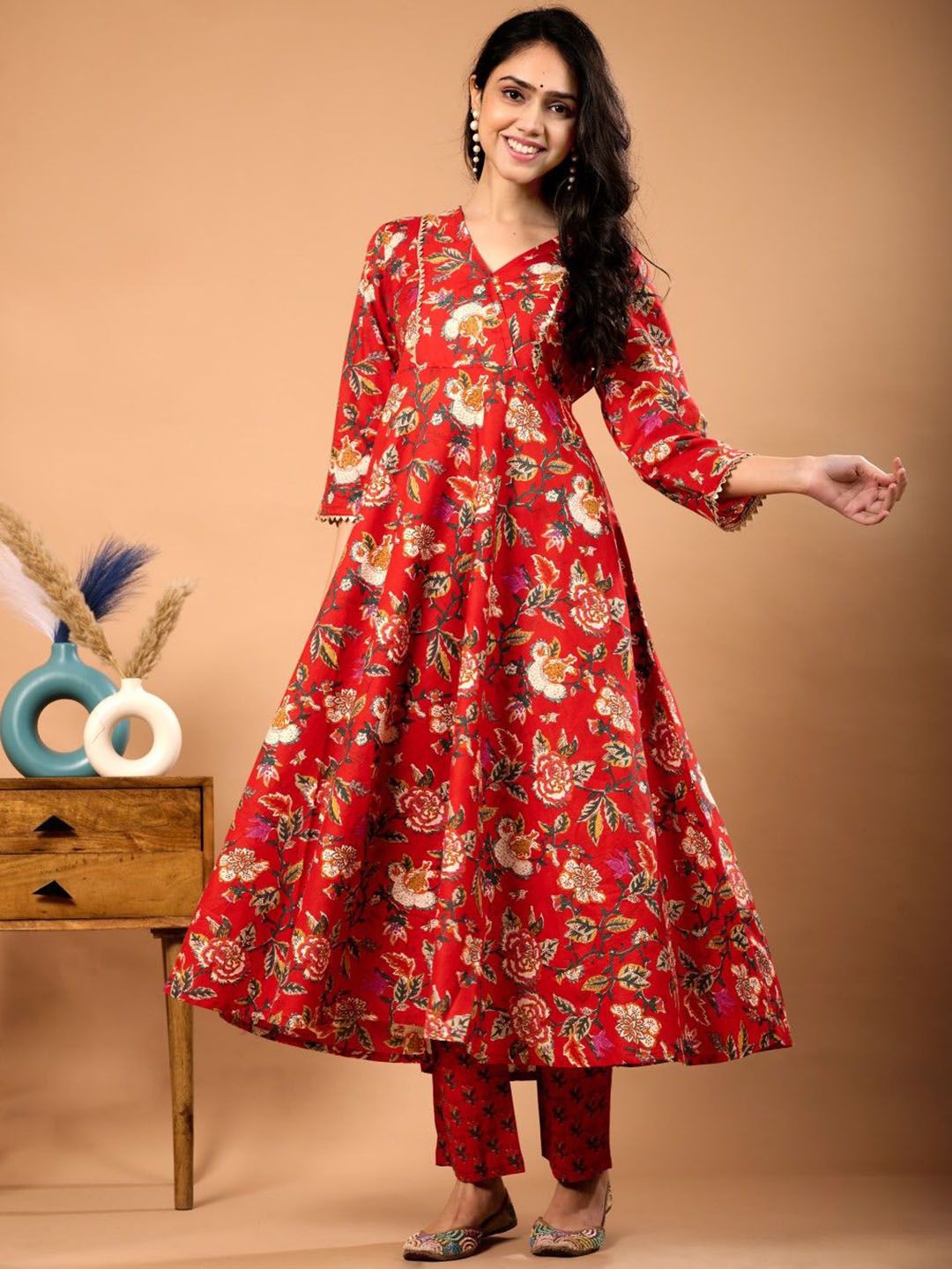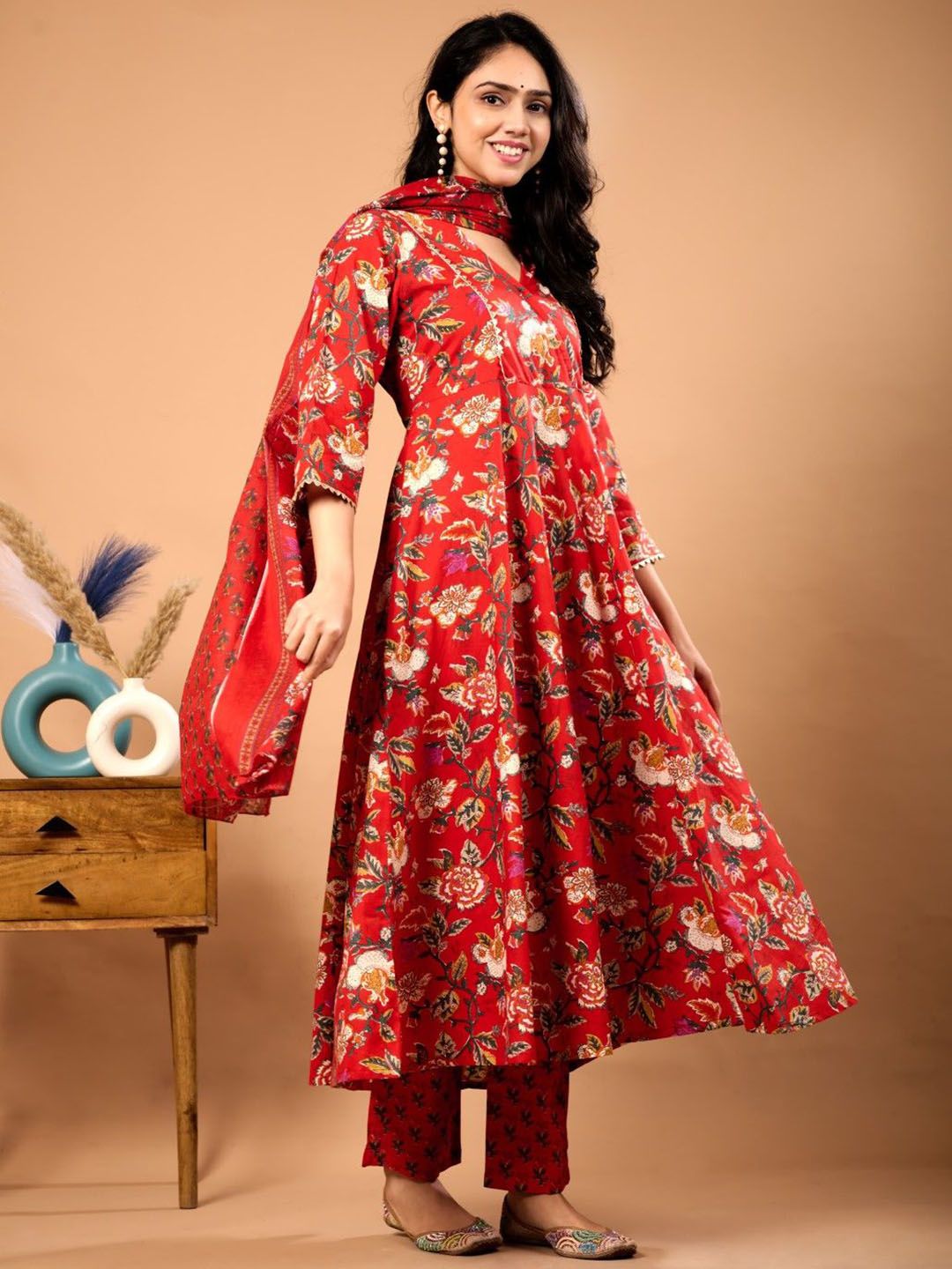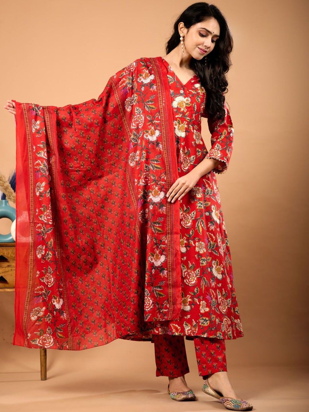 Le Mec Floral Printed V-Neck Flared A-Line Pure Cotton Kurta With Trousers & Dupatta