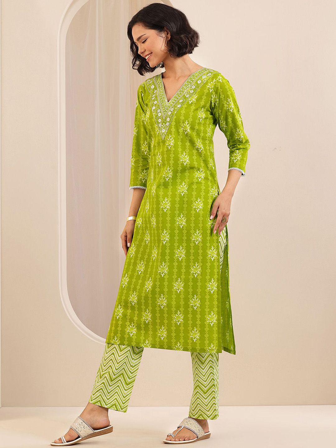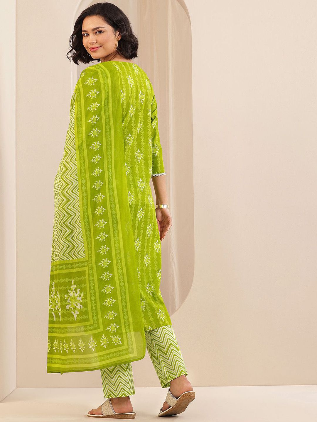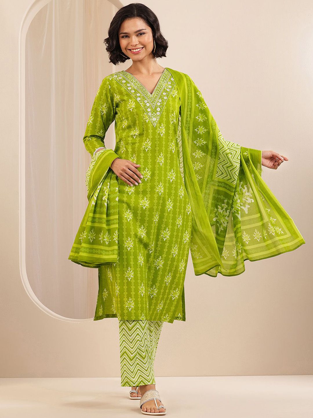 Libas Floral Printed Thread Work Straight Kurta With Trousers & Dupatta