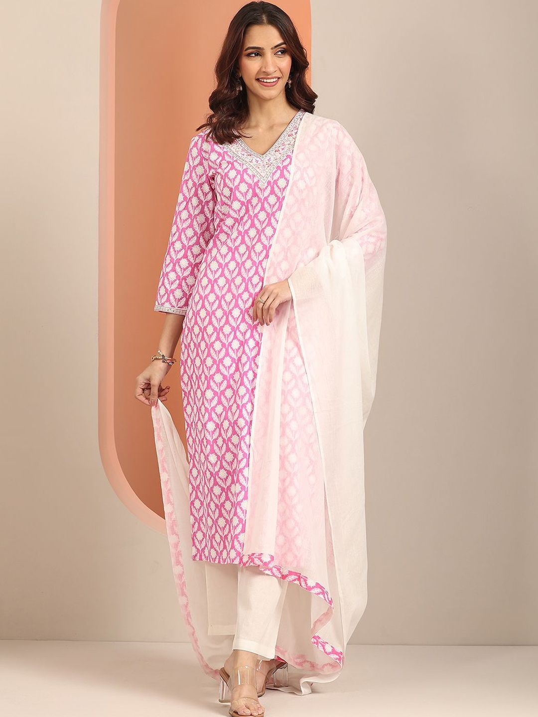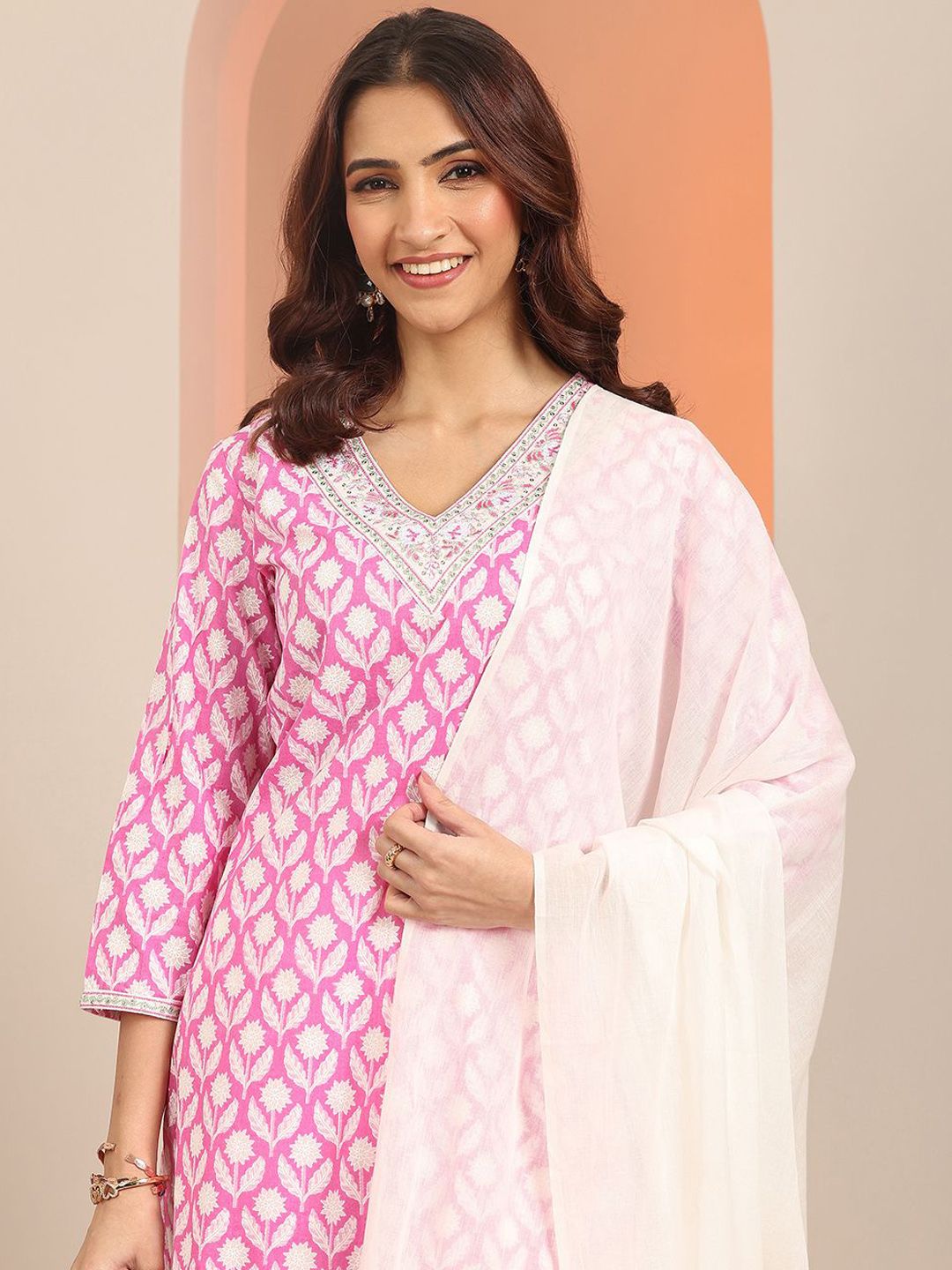 Libas Women Floral Yoke Design Regular Straight Kurta with Trousers & With Dupatta