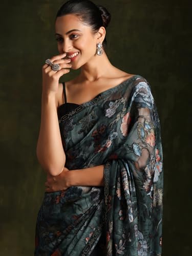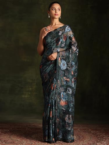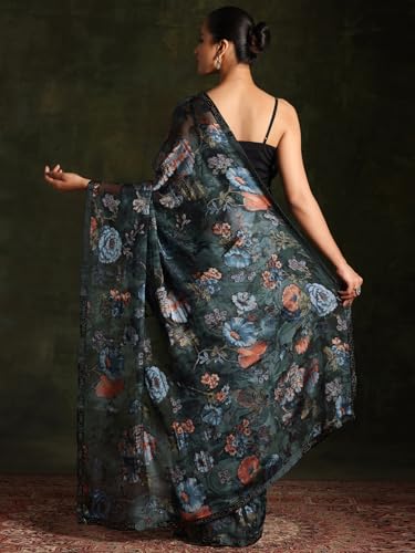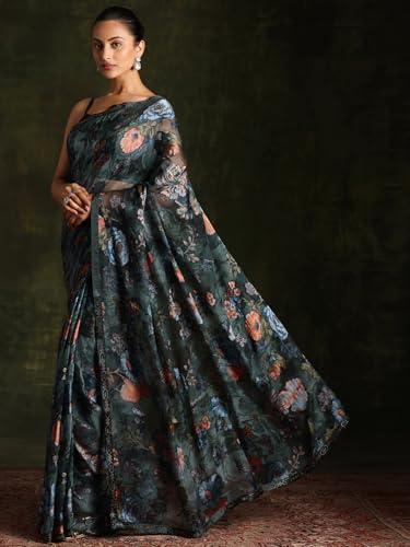 Libas Women's Teal Green Woven Design Brasso Saree With Unstitched Blouse