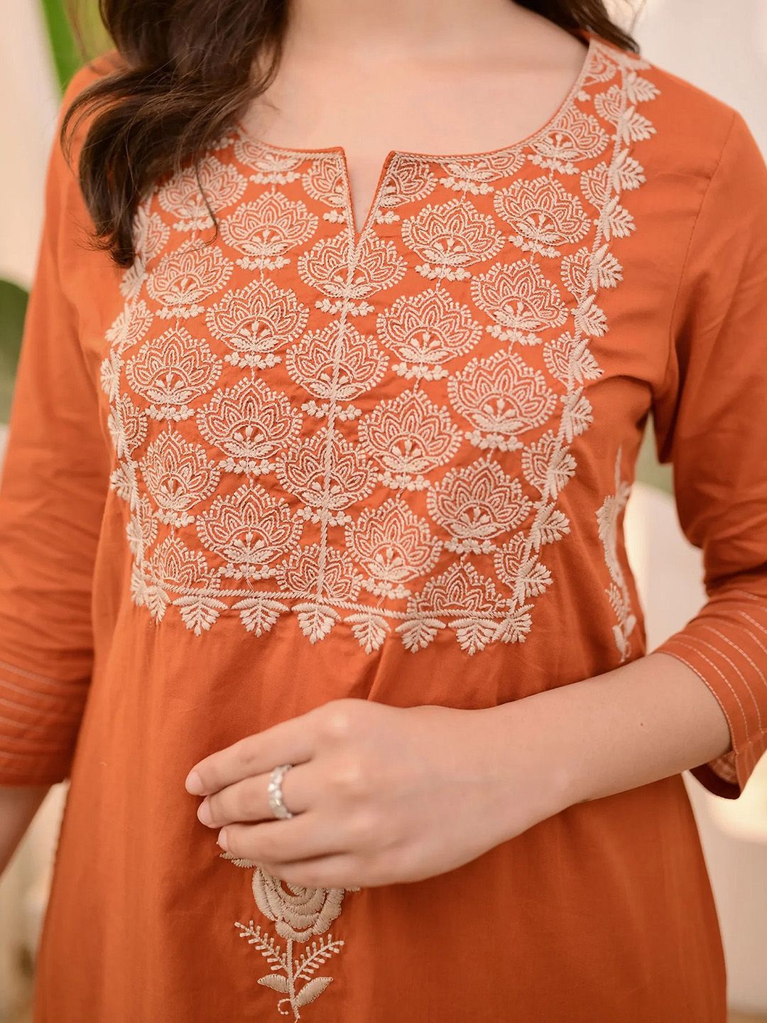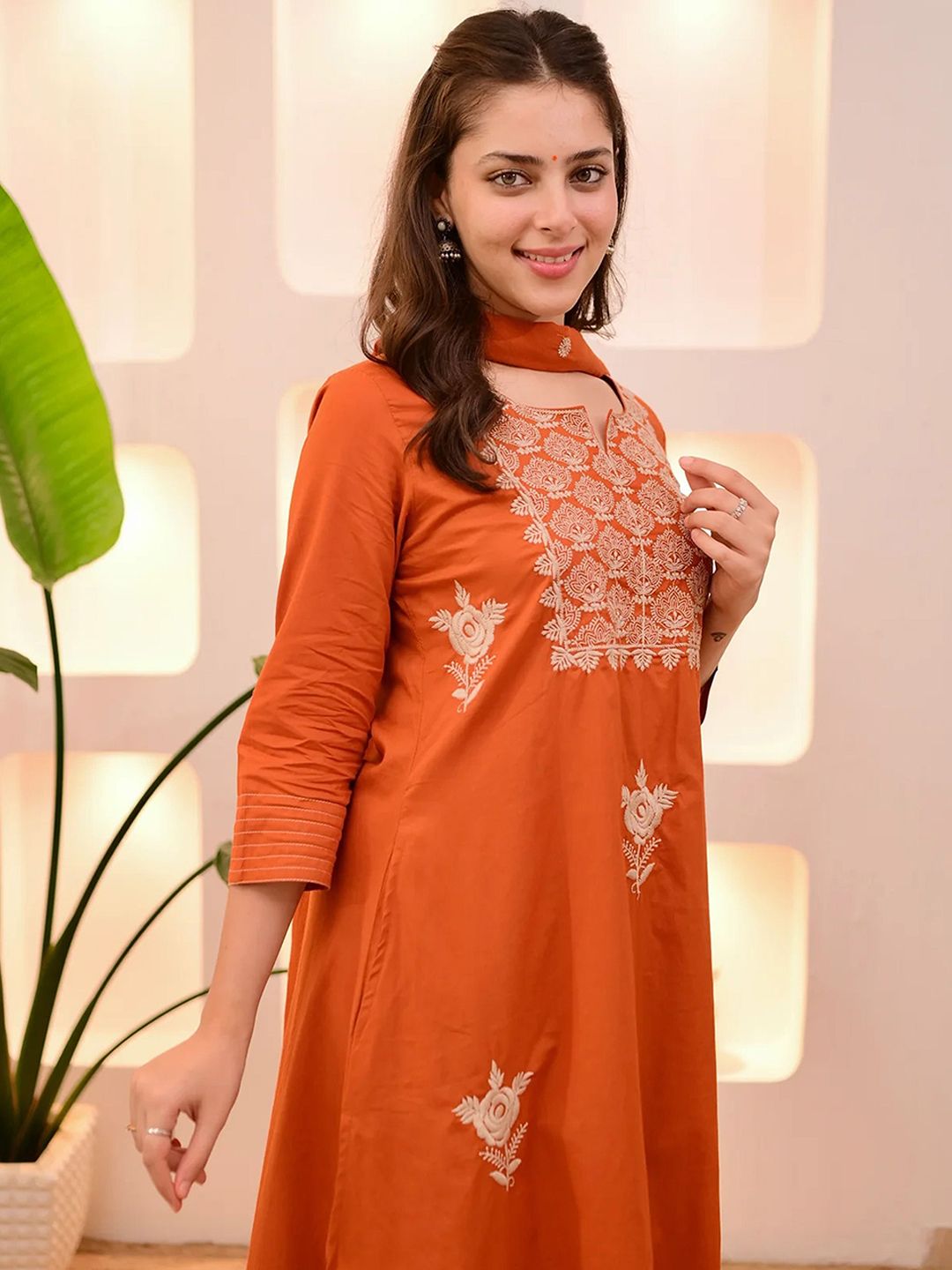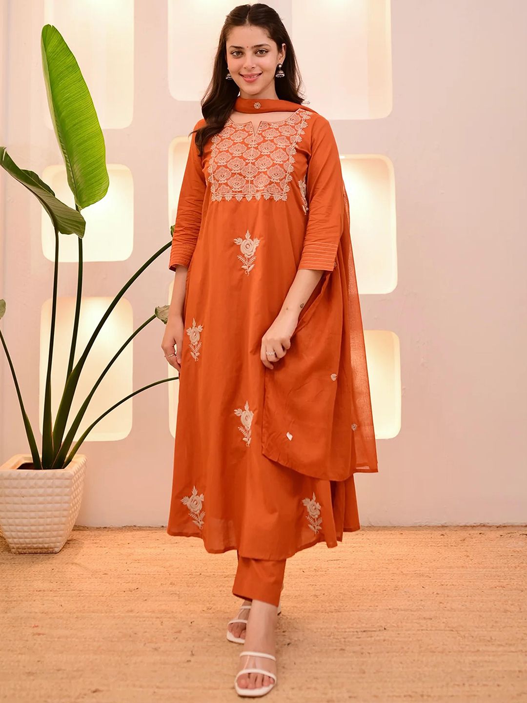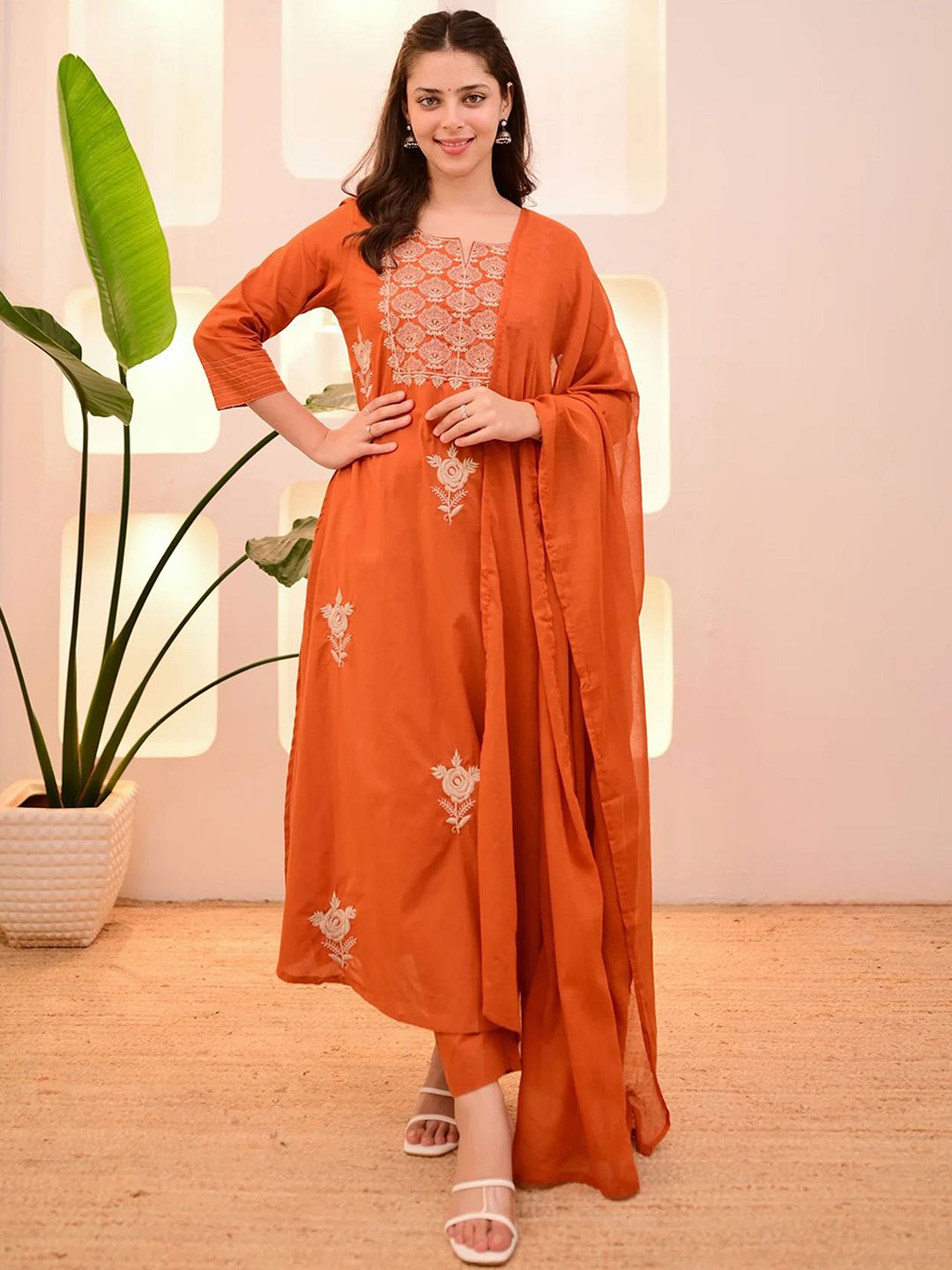 Light Daisy Floral Embroidered Round Neck Straight Kurta With Trousers & Dupatta
