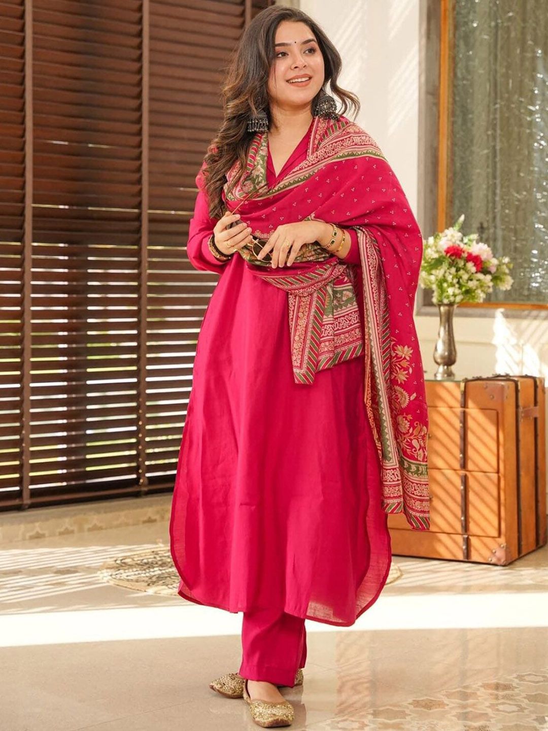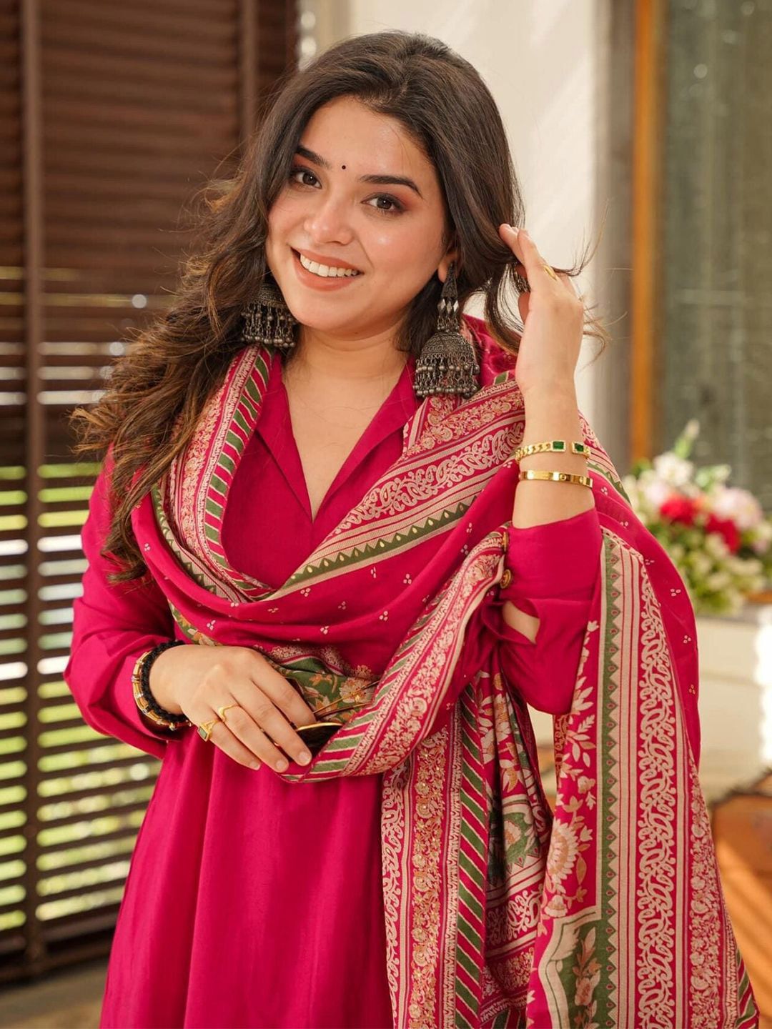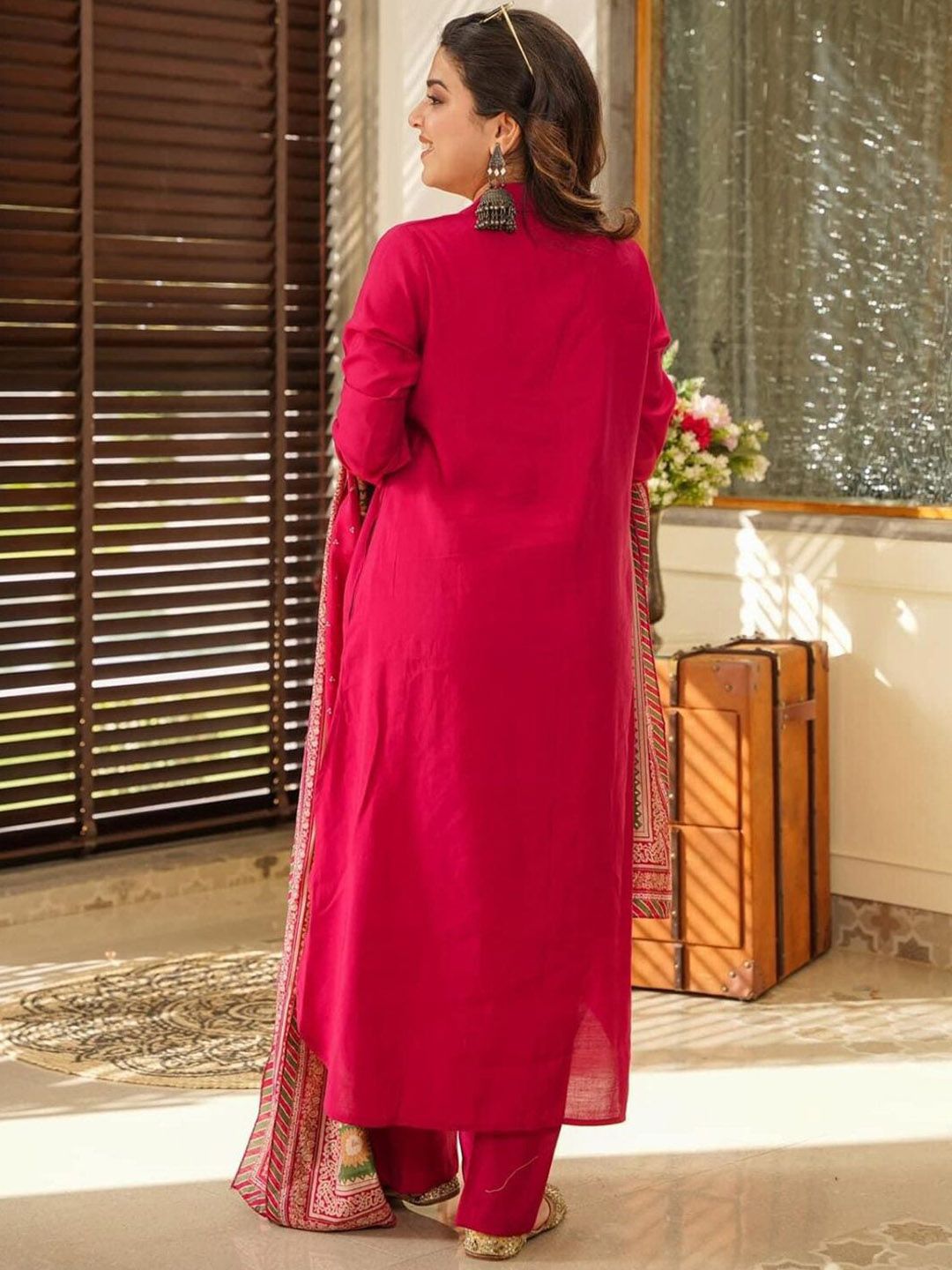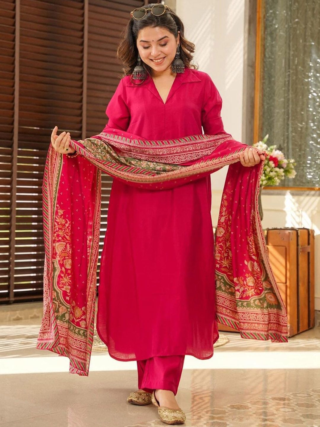 Lilots Shirt Collar A-Line Kurta With Trousers And Dupatta