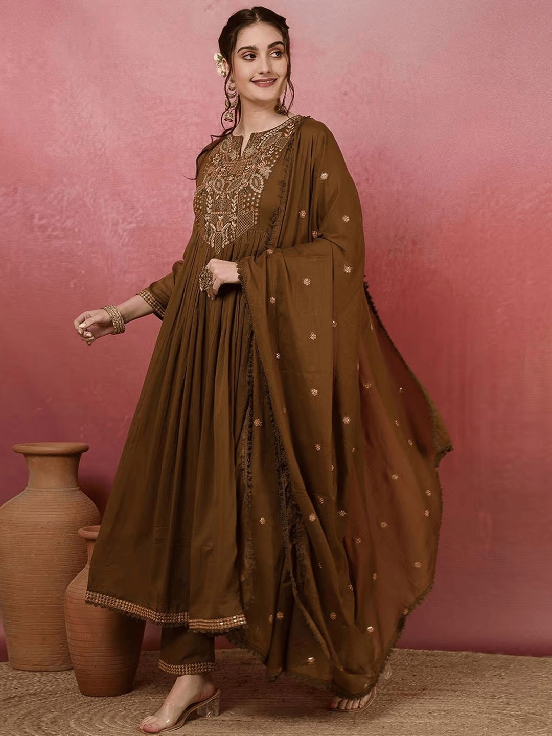 Lilots Women Ethnic Motifs Embroidered V-Neck Chanderi Silk Kurta with Trousers & Dupatta