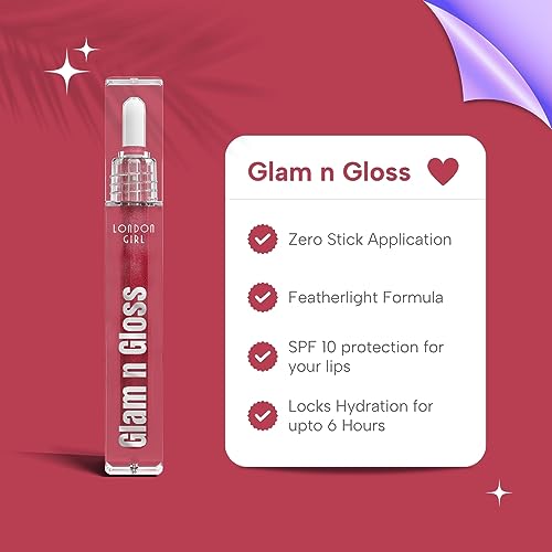 Non-Sticky Formula: Experience the innovation of Glam N Gloss lip gloss with its smooth, non-sticky formulation, delivering comfortable, shiny lips with every application Lightweight on Lips: Glam N Gloss has a lightweight formula that feels comfortable and airy on your lips, promising effortless shiny lips SPF 10 Protection: It helps shield your lips from harmful UV rays while delivering a high-shine finish for a radiant and protected pout. Hydrating Formula: With added moisturizing ingredients, enjoy deep hydration for your lips, leaving them soft, supple, and beautifully nourished for up to 6 hours Glamourous Shine: Elevate your look with Glam N Gloss lip gloss, boasting a luxurious pearly shine that adds a touch of glamour to your lips, perfect for any occasion. Enriched with Vitamin E: Infused with the nourishing benefits of Vitamin E, lip gloss not only provides a glossy shine but also moisturizes and protects your lips