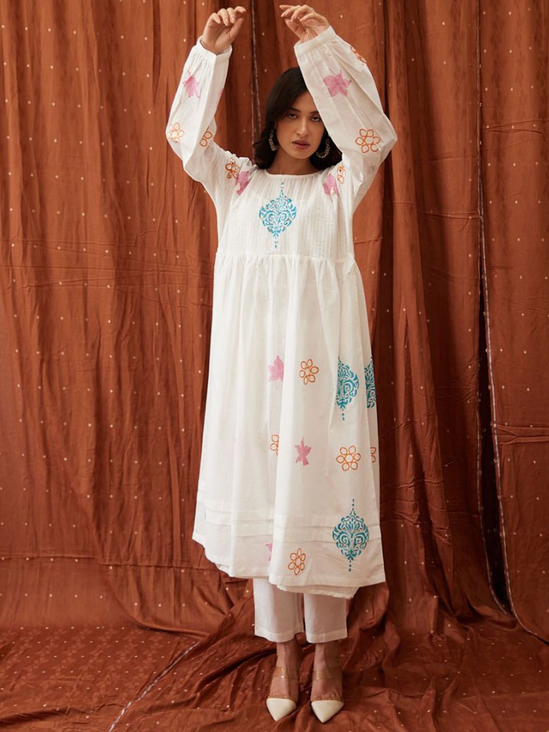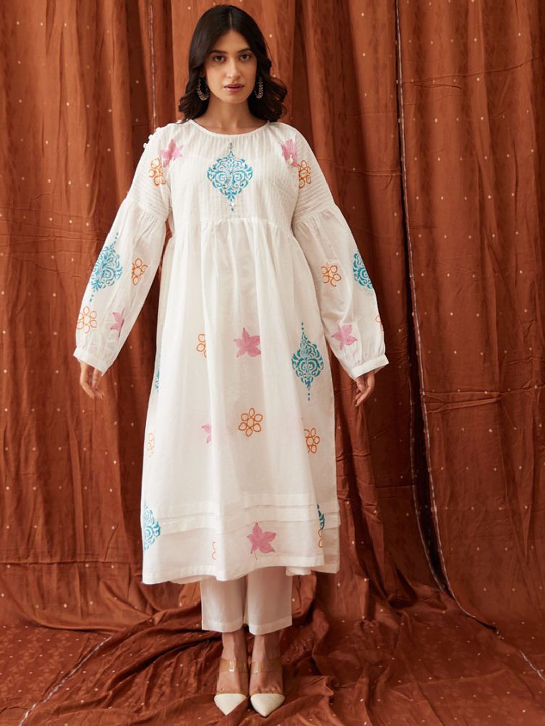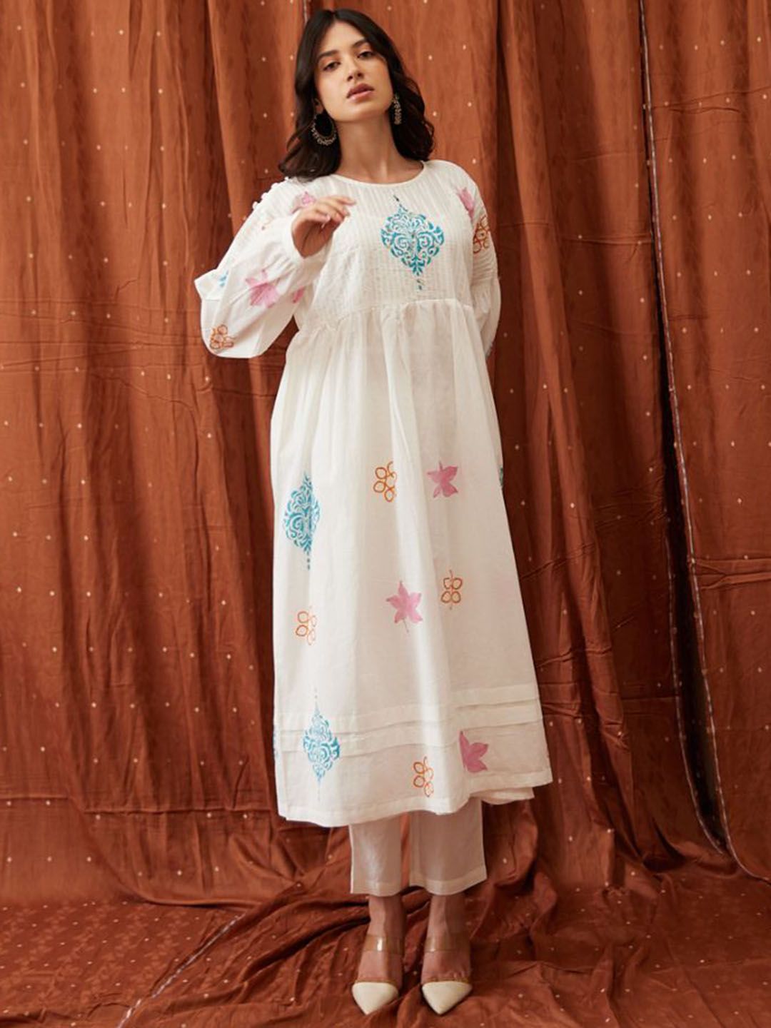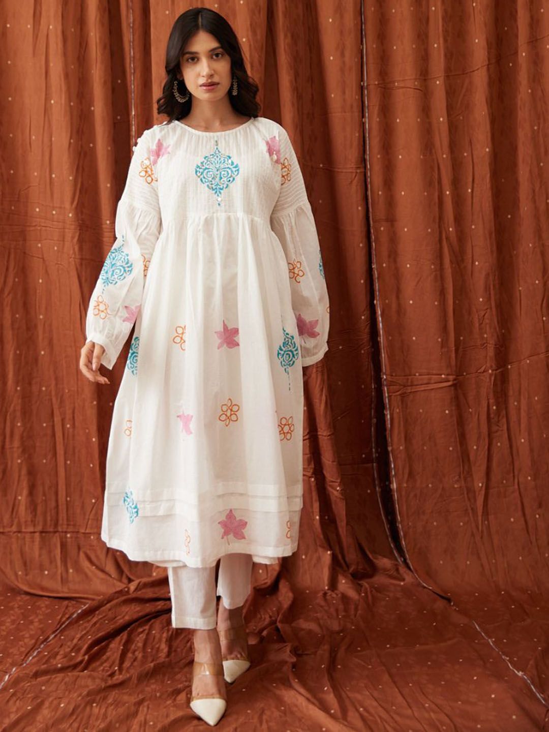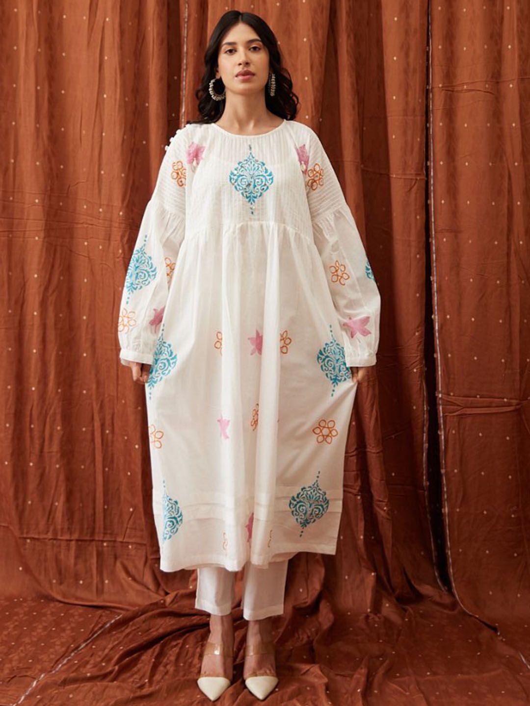 MAAND Ethnic Motifs Printed Sequinned Pleated Pure Cotton Kurta With Trousers