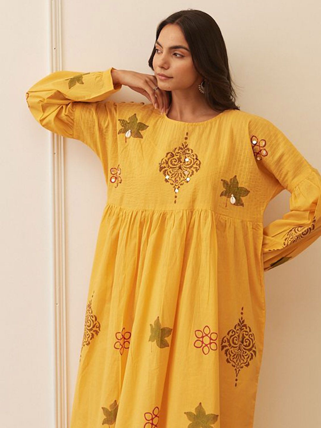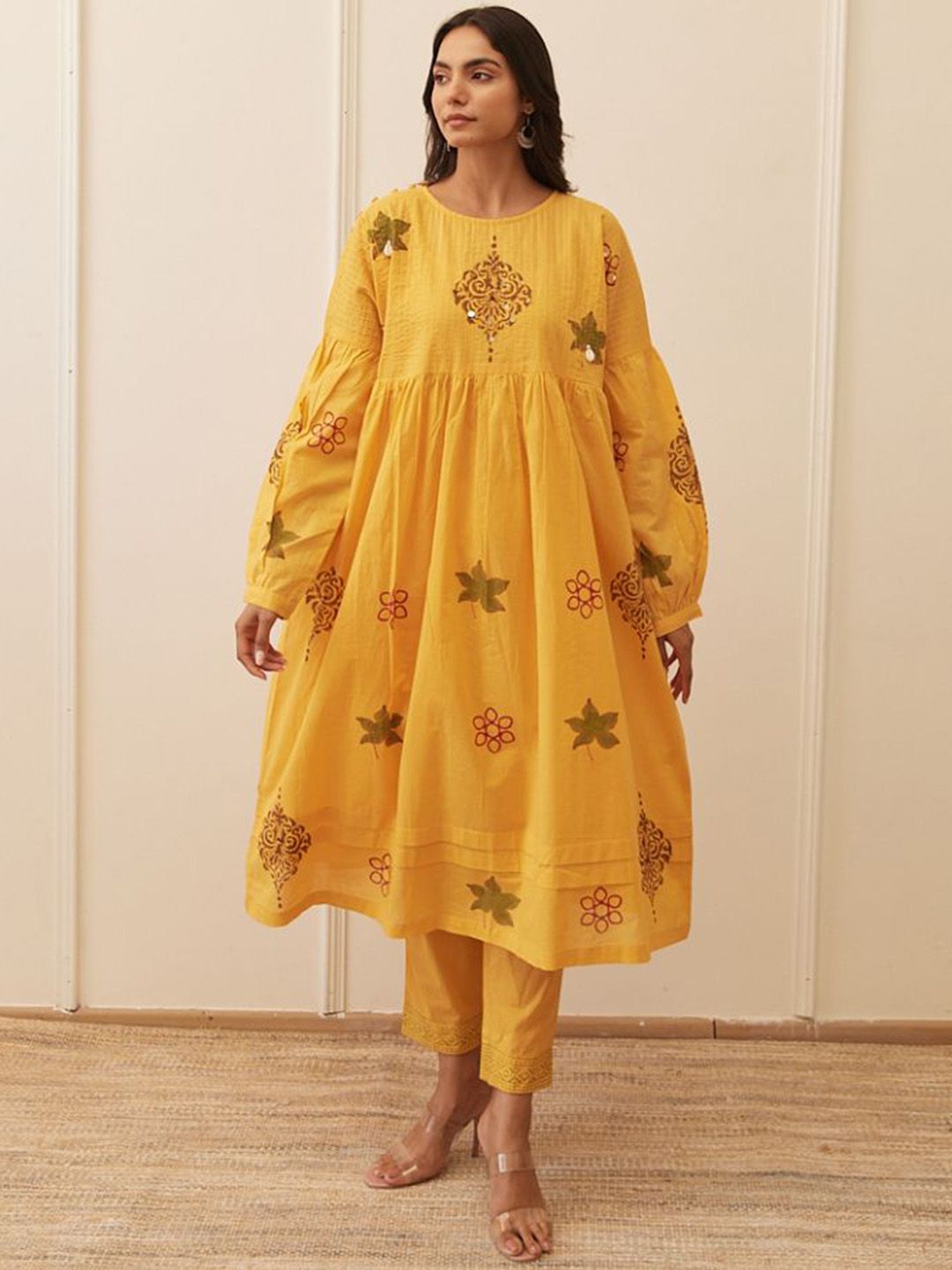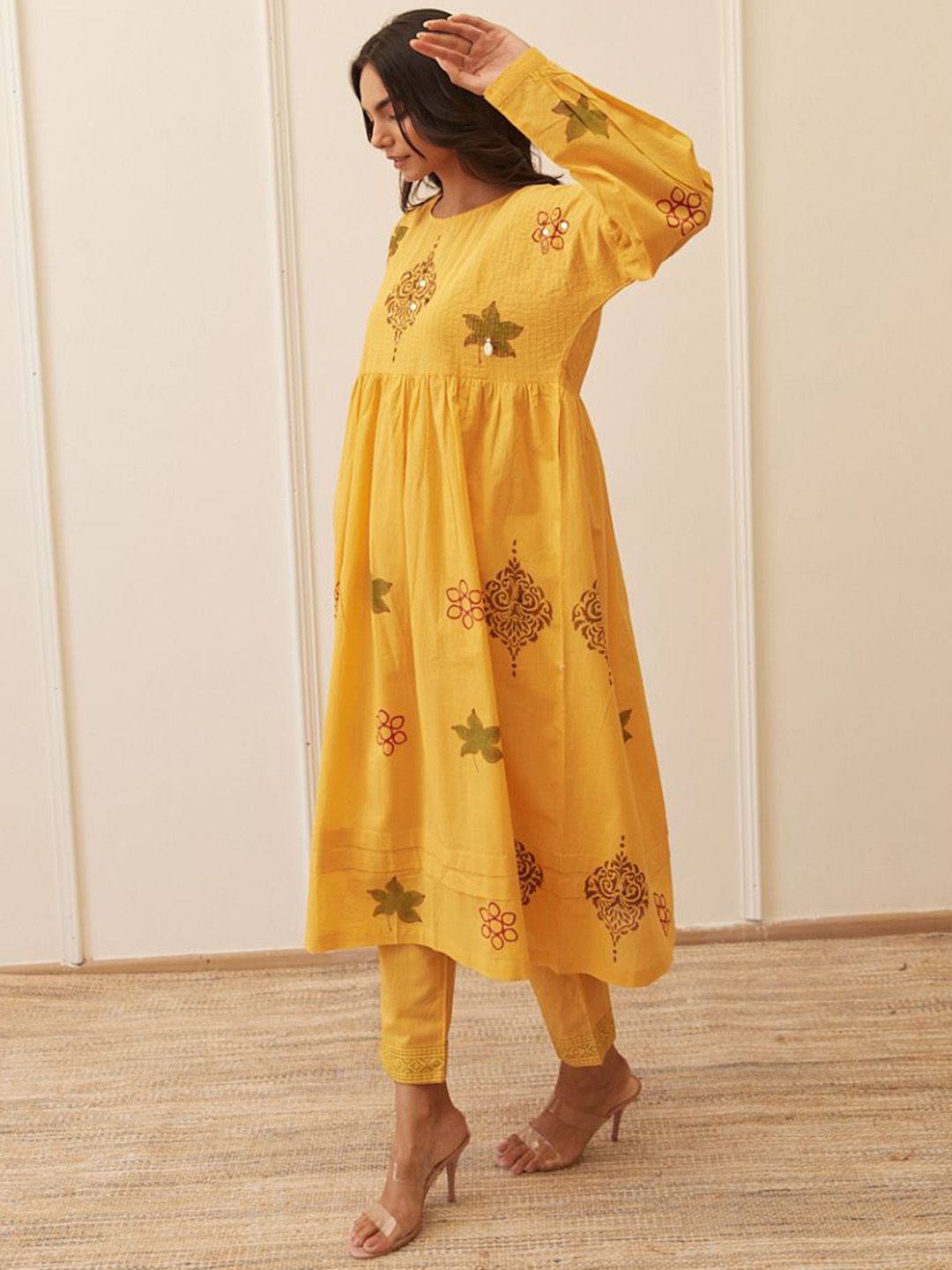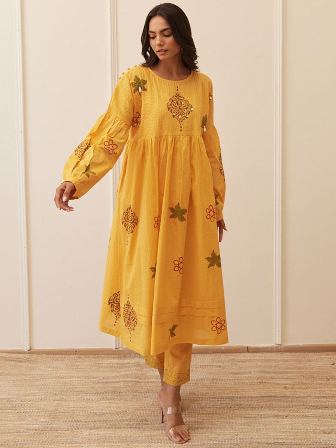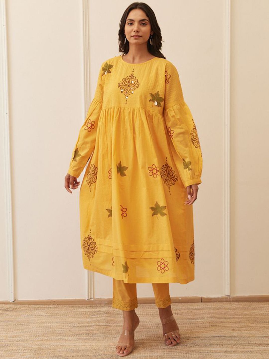 MAAND Ethnic Motifs Printed Sequinned Pure Cotton Empire Kurta With Trousers