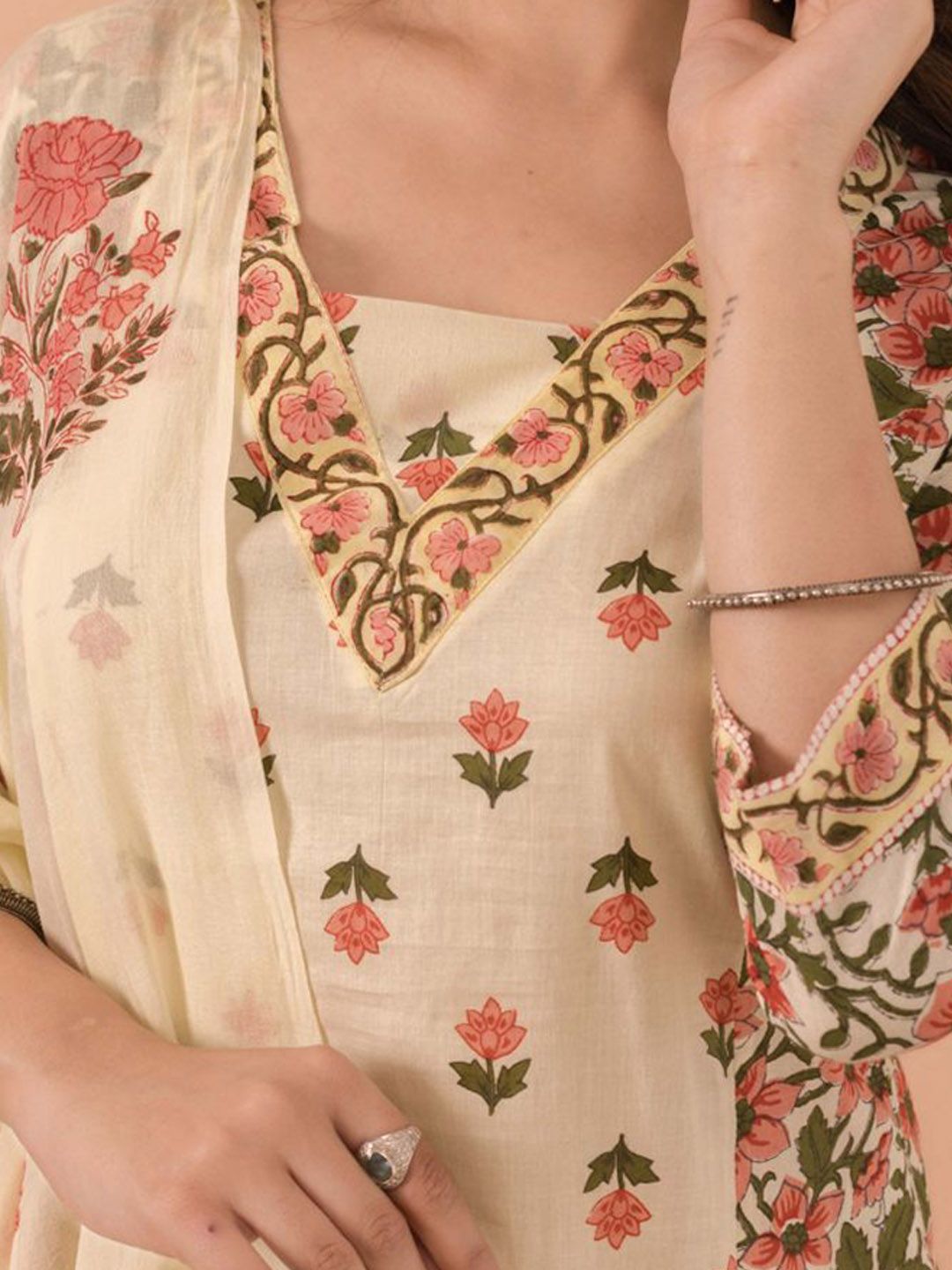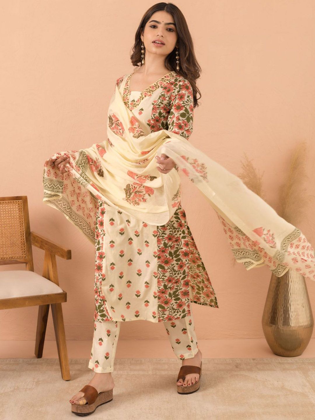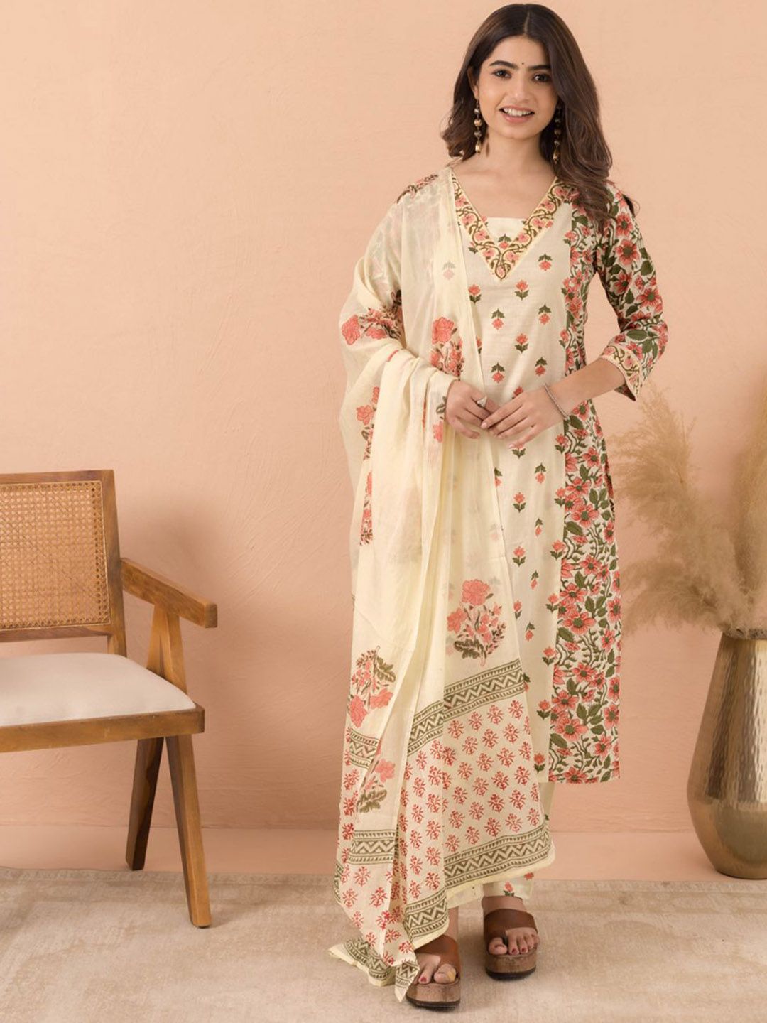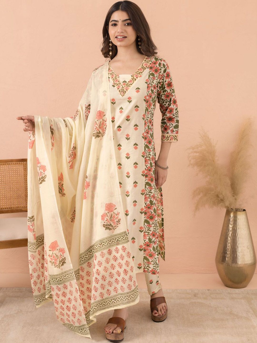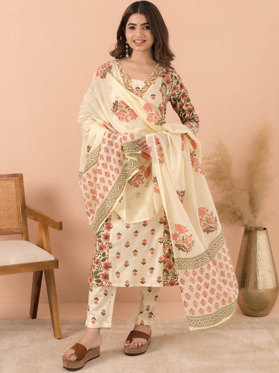 MAAND Floral Printed V Neck Pure Cotton Kurta With Trousers & Dupatta