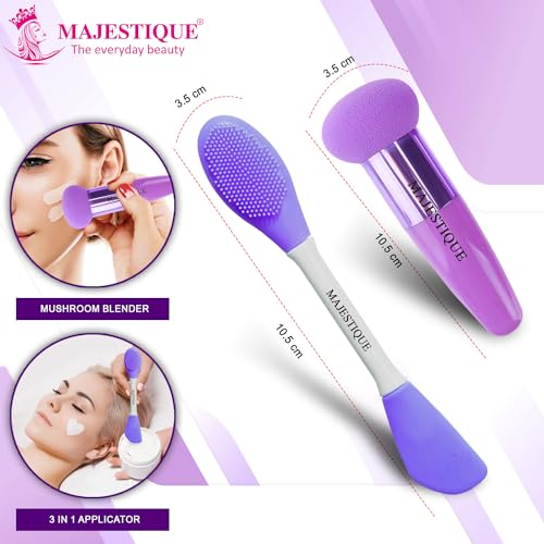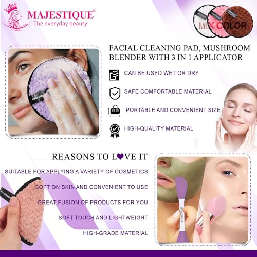 Versatile Beauty Set: The Majestique Reusable Multi-functional Set is a beauty essential designed to elevate both skincare and makeup routines, offering versatility and convenience. Dual-Sided Facial Cleansing Puff: This set features a specially crafted round facial cleansing pad with a dual-sided design, also known as Microfiber Reusable makeup remover pads. It excels in deep cleansing and effective makeup removal. Mushroom Blender: The mushroom blender, a powder puff cosmetic sponge, and makeup brush Blender, boasts an innovative design suitable for both dry and wet use with various products like liquid, creams, and powders. Facial Applicator for Skincare: The Facial Applicator, a three-sided Mask Brush, combines the benefits of a silicone face applicator and a double-sided cleansing facial brush. It facilitates the easy and even application of skincare products, ensuring a flawless and uniform result. Eco Friendly: Majestique Reusable Multi-functional Set for a revolutionary beauty regimen, addressing effective makeup removal and delivering a polished and radiant look.