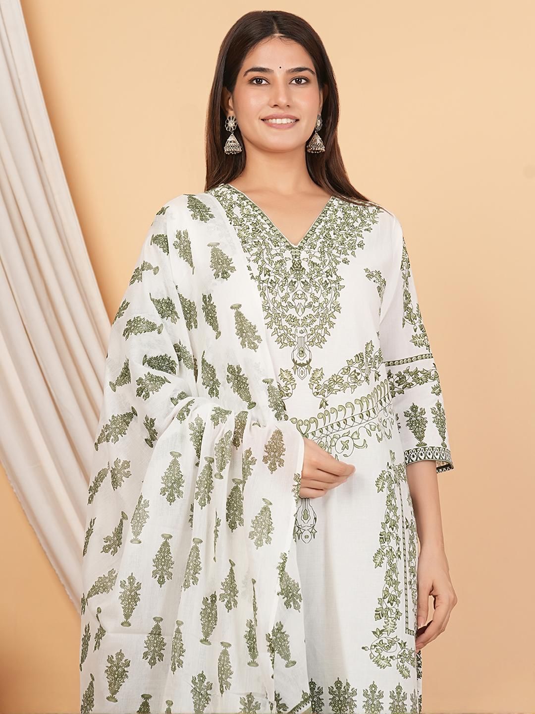 MANDAKINI Women Green & White Printed Regular Pure Cotton Kurta with Palazzos & Dupatta