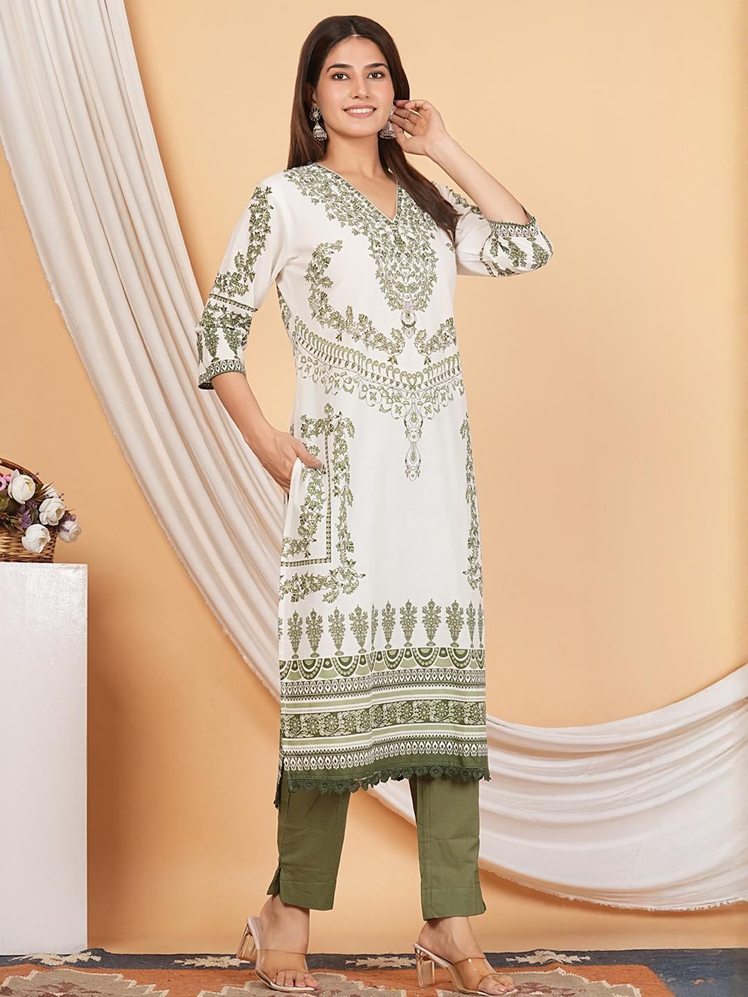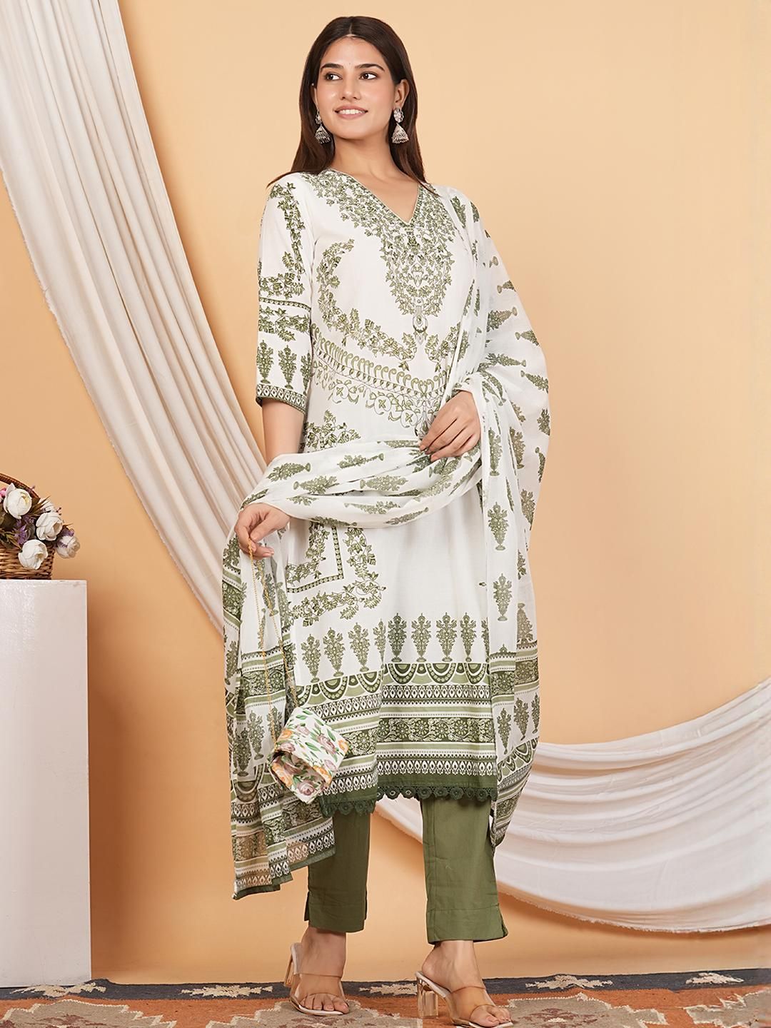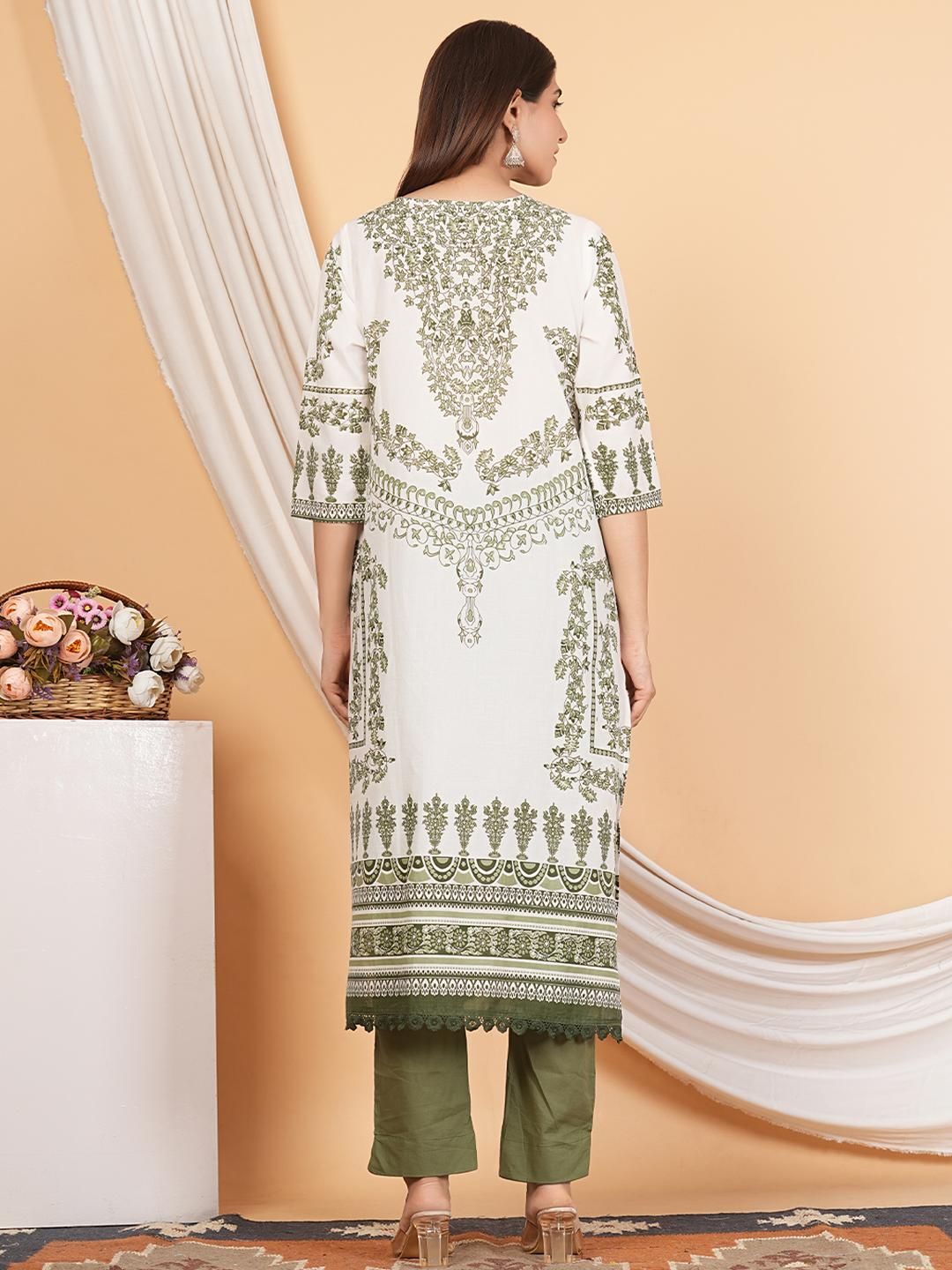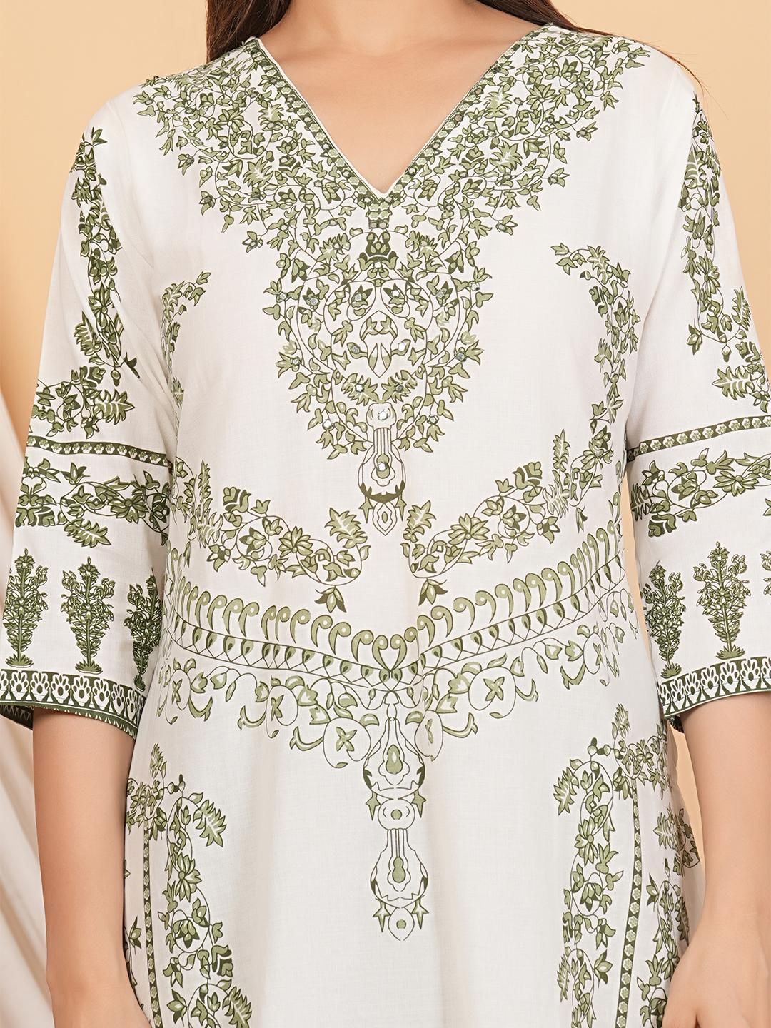 Buy this stylish MANDAKINI Women Green & White Printed Regular Pure Cotton Kurta with Palazzos & Dupatta at Marincart Nepal. This product offers great quality and value. Perfect for those looking for the latest trends in fashion. Get yours now at unbeatable prices.