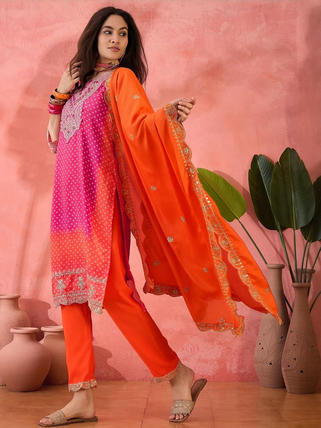 Buy this stylish Maroosh Bandhani Embroidered Round Neck Sequinned Chinon Kurta With Pyjamas & Dupatta at Marincart Nepal. This product offers great quality and value. Perfect for those looking for the latest trends in fashion. Get yours now at unbeatable prices.