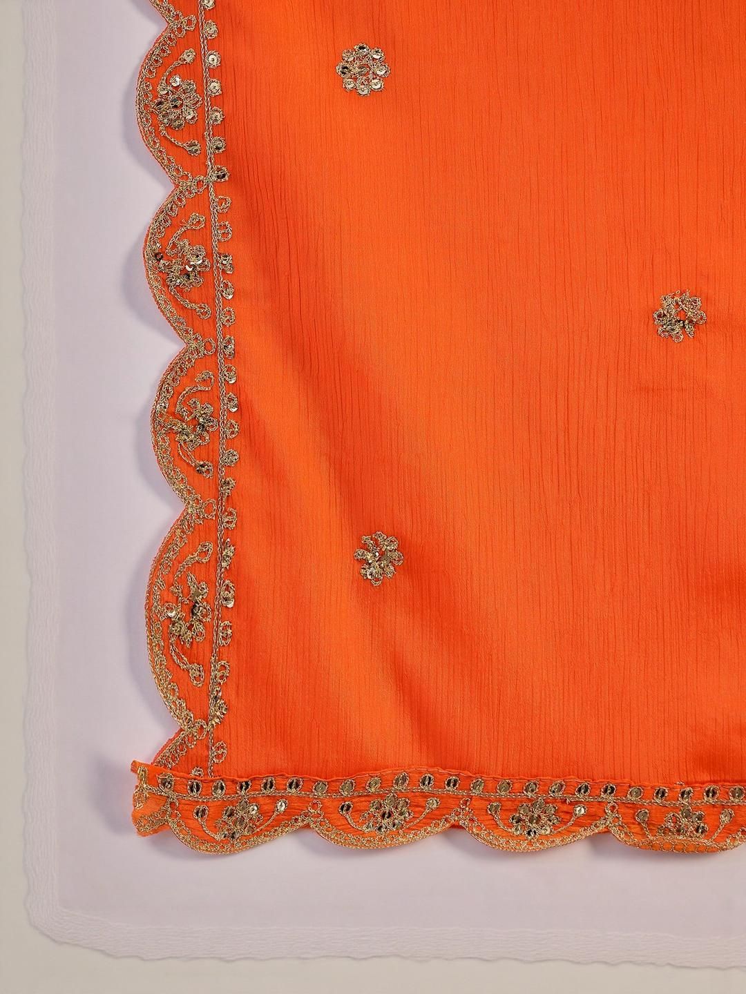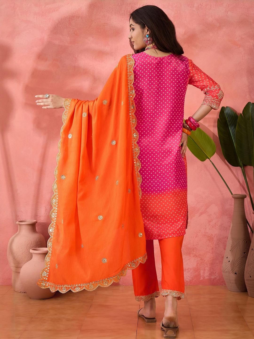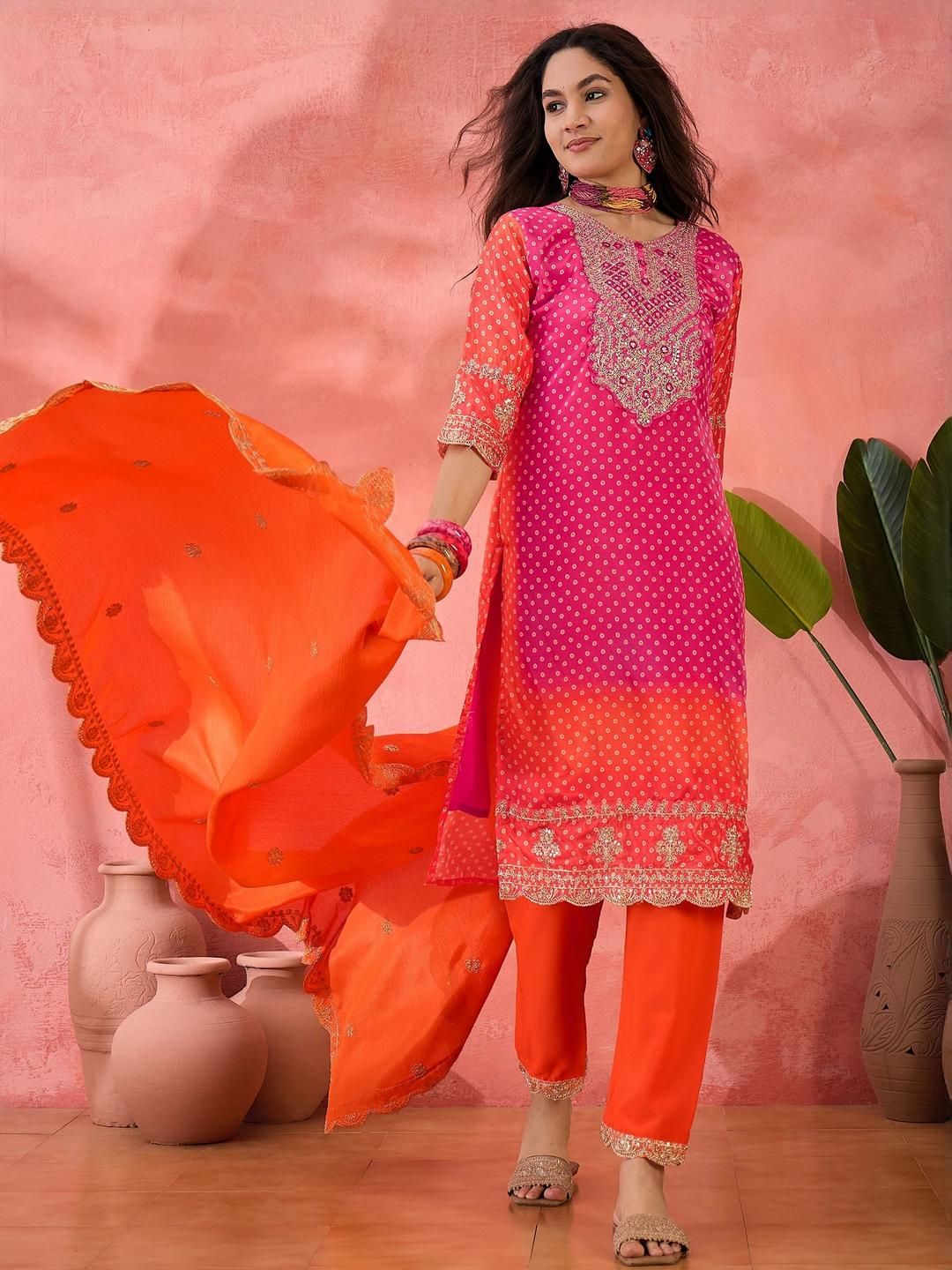 Maroosh Bandhani Embroidered Round Neck Sequinned Chinon Kurta With Pyjamas & Dupatta