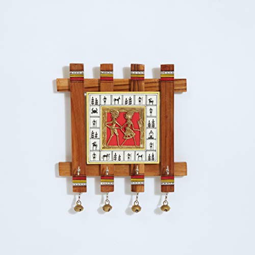 Handmade Key Hanger to enhance your wall decor We have very beautifully integrated this 5000 year old metal casting art with today’s day to day home decor products such as key hangers. The dhokra art beautifully incorporated on wooden key hangers and combined with tribal hand painting.These key hangers adds story and pure art to your wall decor. This is a perfect buy for your house or gifting it to someone in house warming , birthday etc he key hangers are made from teak wood and is a unique hand made product. This comes with 4 hooks.