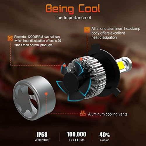 LED CAR HEADLIGHT: Fits for H4 Hi/Lo with Korea CSP led chipsets . 8,000Lm (4,000Lms per bulb),50W(25W each bulb) 6500K Xenon White DC9V-32V.High luminous efficacy Flux up to 8,000 lumens per pair, 200% brighter than your halogen headlights. without any dark spots or foggy light, it can increased distance visibility and visual field when you driving at night. LONG LIFESPAN: Compared with Cheap headlight bulb, our works fine better.All-in-one LED headlight bulb kit,no noise caused by fan, IP68 rated waterproof and dustproof, lower power consumption, energy saving, efficiently heat dissipation to ensures your bulbs last longer than your car! long lifespan up to 100,000 hours. EASY INSTALLATION: All-in-One LED Headlight Bulbs, which compatiiable with more than 99% vehicle.Easy to install,only takes no more than 5 minutes and it can start to work.For built in CAN-BUS system vehicles, may need the load decoder or resistor to avoid the error code or blinking issues. EFFICIENT COOLING SYSTEM: Air-craft Aluminum Profile,High quality aviation standard aluminum lamp body, anti-oxygen and high temperature resistance;Built in fans, control driver get optimal;heat protection;cooler faster 50% off than other auto headlight.The latest technology to ensure a perfect beam pattern without any dark spots or foggy light. IMPORTED CSP LED CHIP: LED HEADLIGHT LIGHT SOURCE, Use CSP LED chip,Little illuminated surface but maximum light efficiency, Better penetration and stronger condenser, Waterproof and dustproof, All-in-one, Plug-N-Play, Smart heat radiator, Instant start.Over 10,000 hrs of brilliant continuous light,IP68 Rainproof driver, housing, and fan works even in extreme situations.