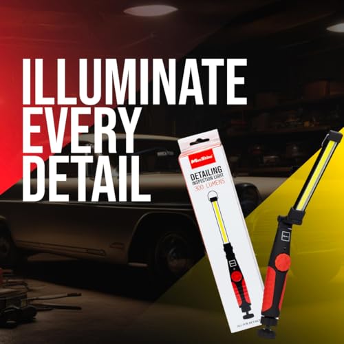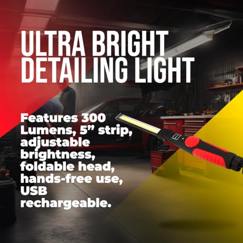 Illuminate Every Detail; 300-lumen output with 40 LEDs reveals swirl marks for precise paint correction; ideal for auto detailing in garages or outdoors; reliable visibility for results Adaptable Lighting On Demand; fully adjustable foldable design ensures hands-free use at any angle; perfect for inspecting hard-to-reach surfaces during car polishing or paintwork Compact Power Anywhere; lightweight at just 5.8 oz and folds to 8.25 inches for easy transport; keep in your detailing kit or glove box for on-the-go inspections Effortless Rechargeability; USB rechargeable battery eliminates the need for disposable batteries; maintain consistent lighting during long detailing sessions or mobile jobs Built for Versatility; magnetic base secures the light to metal surfaces for stable, hands-free operation; suitable for professional and enthusiast users working on vehicles or outdoor projects