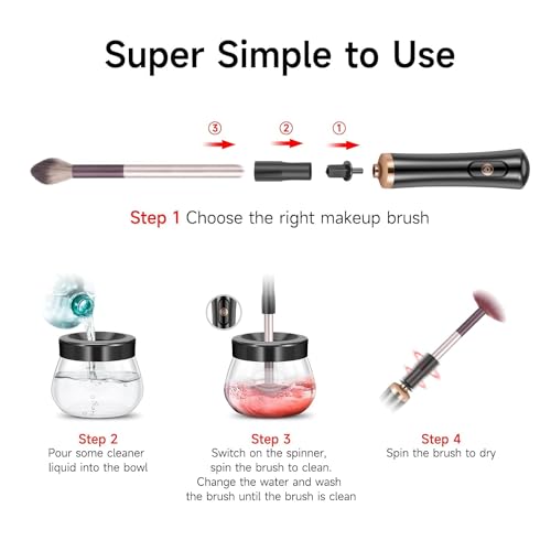 FAST CLEAN & QUICK DRY 2-IN-1 DESIGN: Newest design, no need to clean it by hands, just take 10 seconds for a thorough clean and dry with our premium electric makeup brush cleaner and dryer. achieve 98% cleanliness, like getting a new makeup brush. Save your time and money! 8 RUBBER COLLARS FOR MOST OF BRUSHES SIZE: 8 different customized rubber collars (3mm, 5mm, 7mm, 10mm, 15mm, 18mm, 24mm, 30mm) to fit different brushes, suitable for 95% makeup brushes in the market. EASY TO USE: One ergonomic switch for operating dual modes (clean and dry), just 3 steps easily to use this makeup brushes cleaner and dryer. 1. Attach the brush to the spinner. 2. Pour water and soap(just a little) into the bowl. 3. Dip & spin to clean, raise & spin to dry. Needs 2*AAA batteries to operate(NOT Included). FOR SKIN HEALTHY: Dirty brushes host germs that cause breakouts, rashes, and other skin problems. Cleaning makeup brush every 2 weeks is recommended by professionals and dermatologists. Our brush cleaner can effectively clean the dirty on makeup brushes, keep our skin flawless, which is a must makeup accessories. FRIENDLY TO YOUR BRUSHES: This make up brush cleaner cleanser comes with quality motor and 100% authentic silicon collars, assuring consistant and durable on our brush cleaner. And the extra provided makeup brush holder will keep our brushes organized.