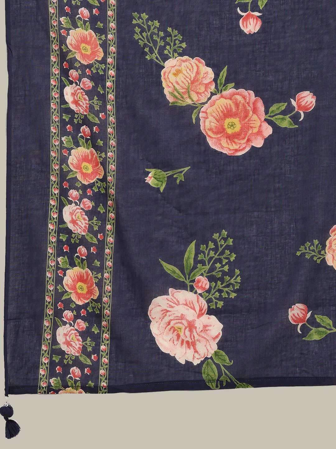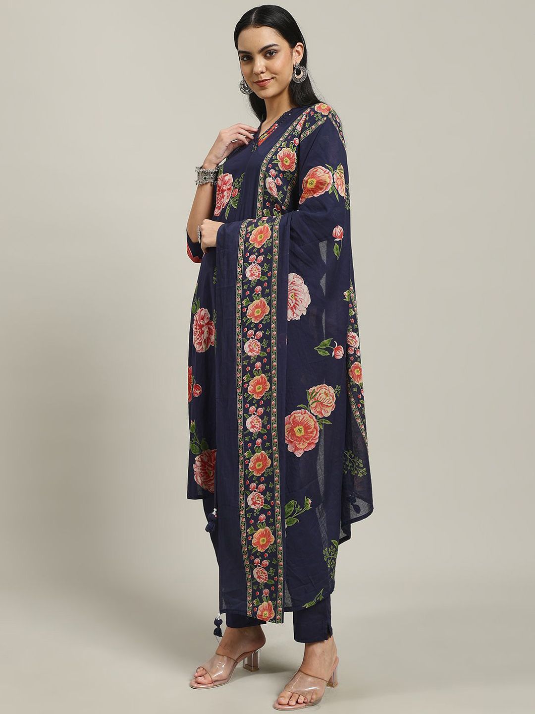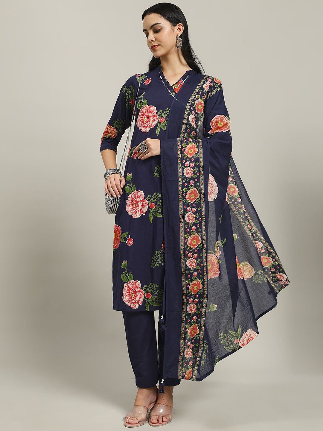 Meena Bazaar Floral Printed Mirror Work V-Neck Kurta With Trousers & Dupatta