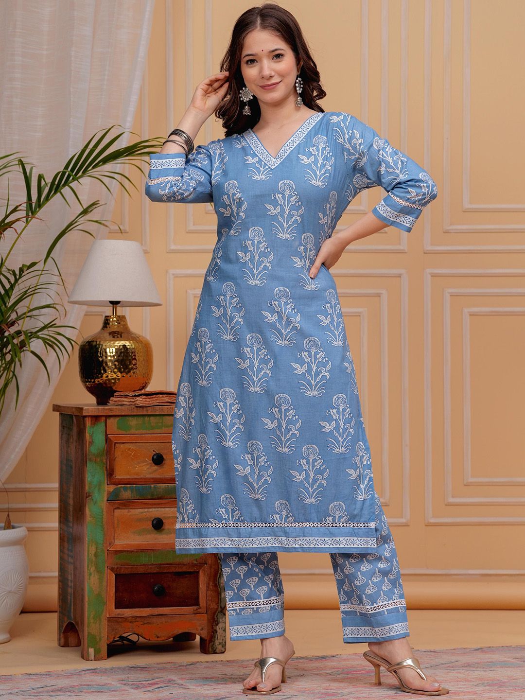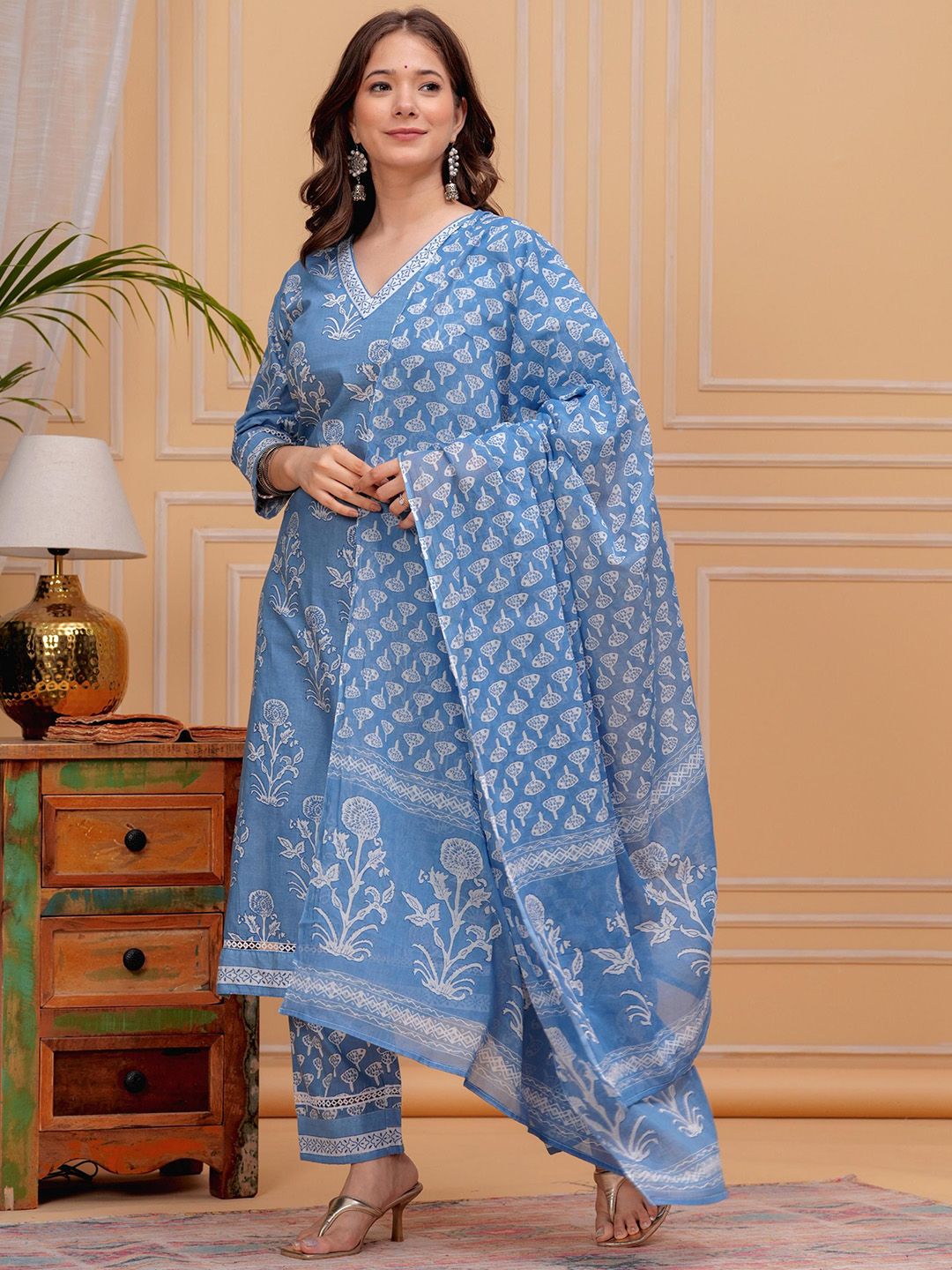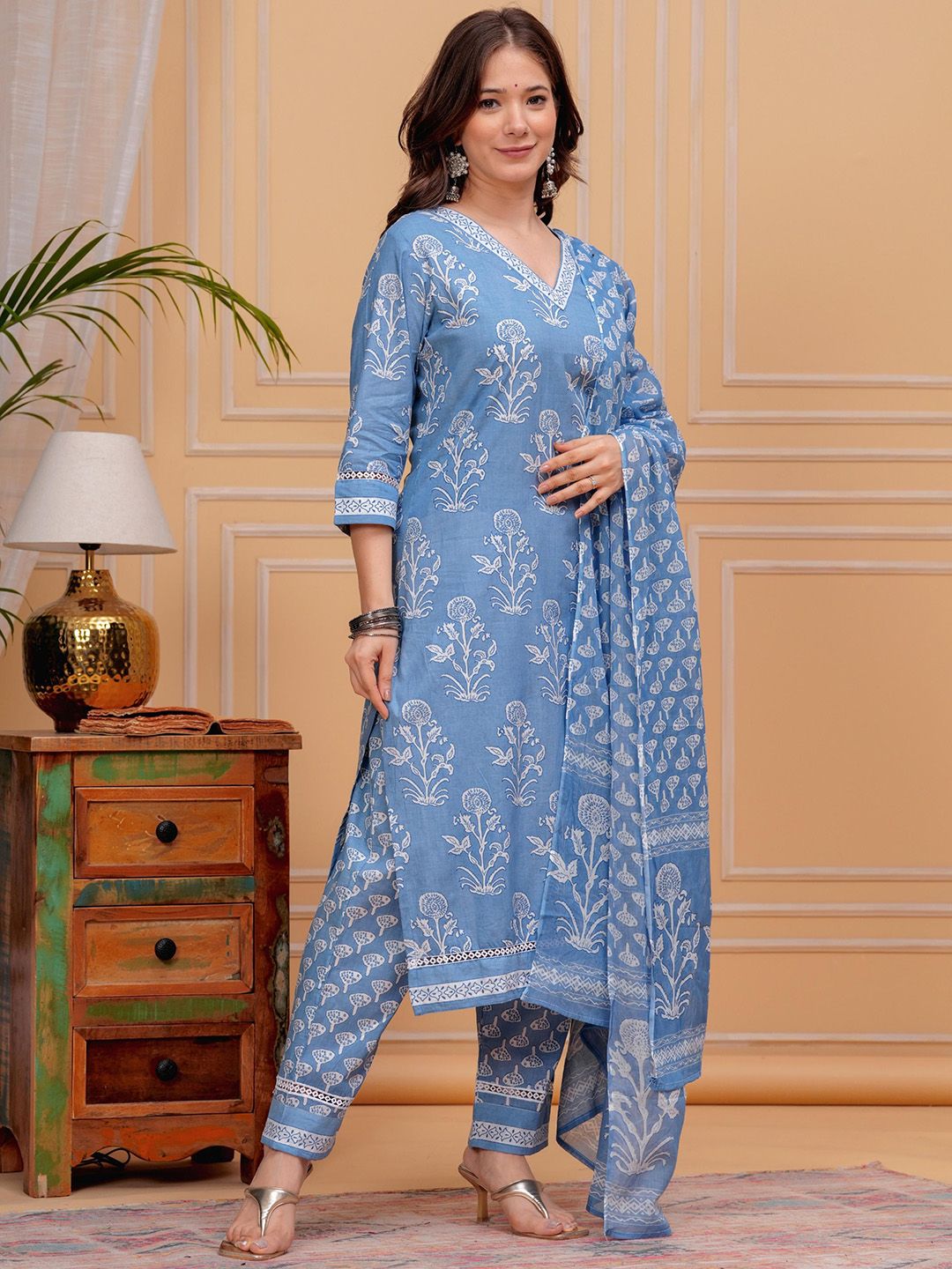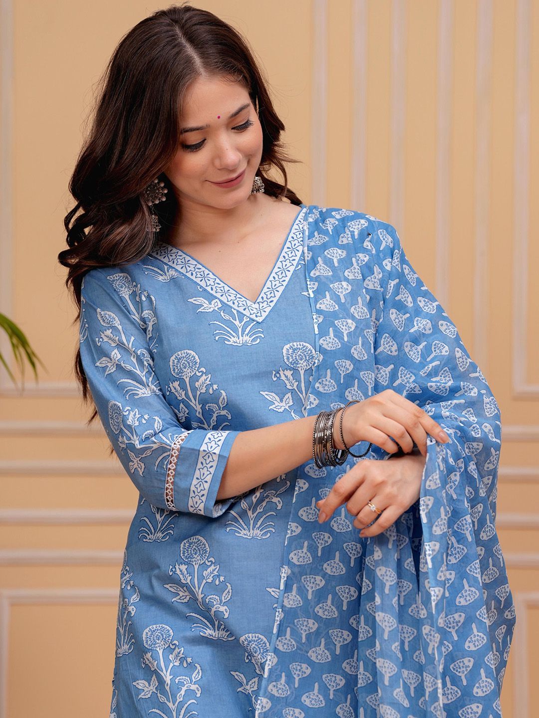 MEERA FAB Floral Printed V-Neck Pure Cotton Kurta With Trousers & Dupatta