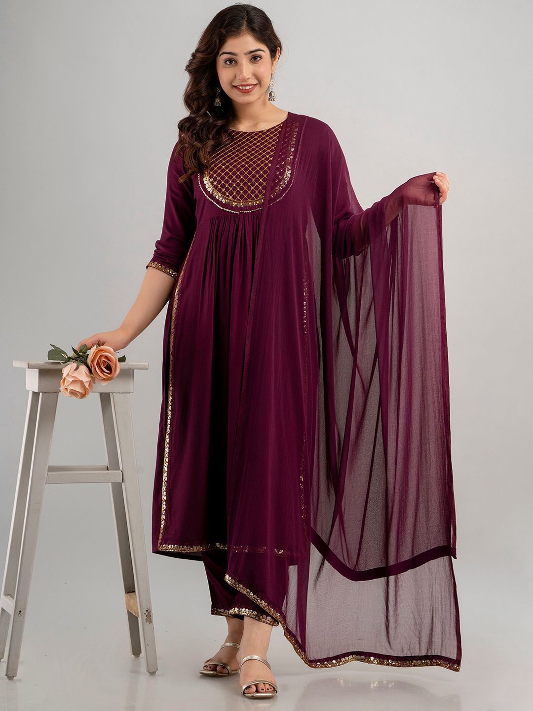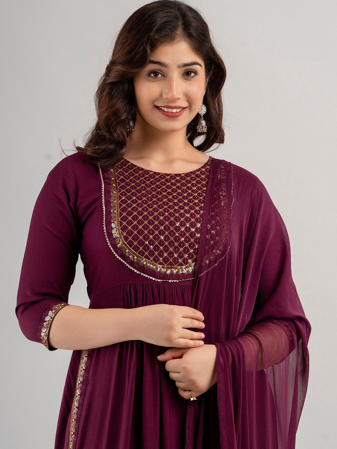 Buy this stylish Meeranshi Floral Yoke Design Pleated Thread Work Naira Cut Kurta With Trouser & Dupatta at Marincart Nepal. This product offers great quality and value. Perfect for those looking for the latest trends in fashion. Get yours now at unbeatable prices.