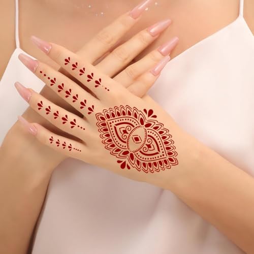 BEAUTIFUL DESIGN: These mehndi stickers feature gorgeous heart shaped henna flower designs perfect for festivals, parties or any occasion EASY TO APPLY: Just peel and stick the self-adhesive tattoos onto clean, dry skin for a beautiful hand painted look without the mess or skill LASTS 3-5 DAYS: The high quality henna inspired designs will last 3 to 5 days, allowing you to enjoy your mehndi without constant reapplication SMALL AND PORTABLE: Convenient individual sheets come in a small portable size that easily fits in your purse or pocket for on the go touch ups and designs SAFE MATERIALS: Made of vinyl and approved cosmetic dyes, these stickers are skin safe and allergy tested for those with sensitive skin