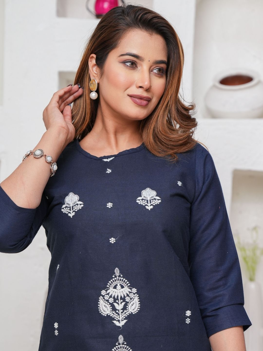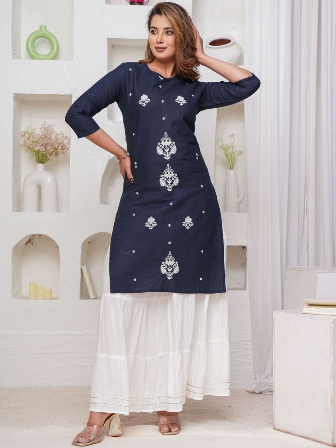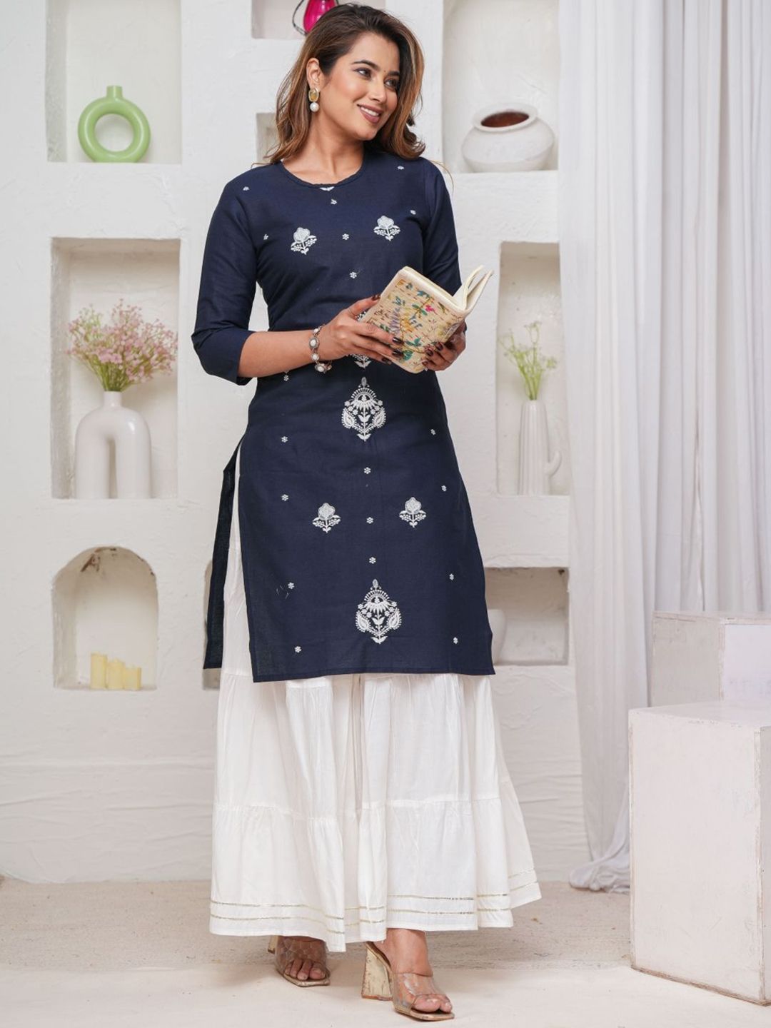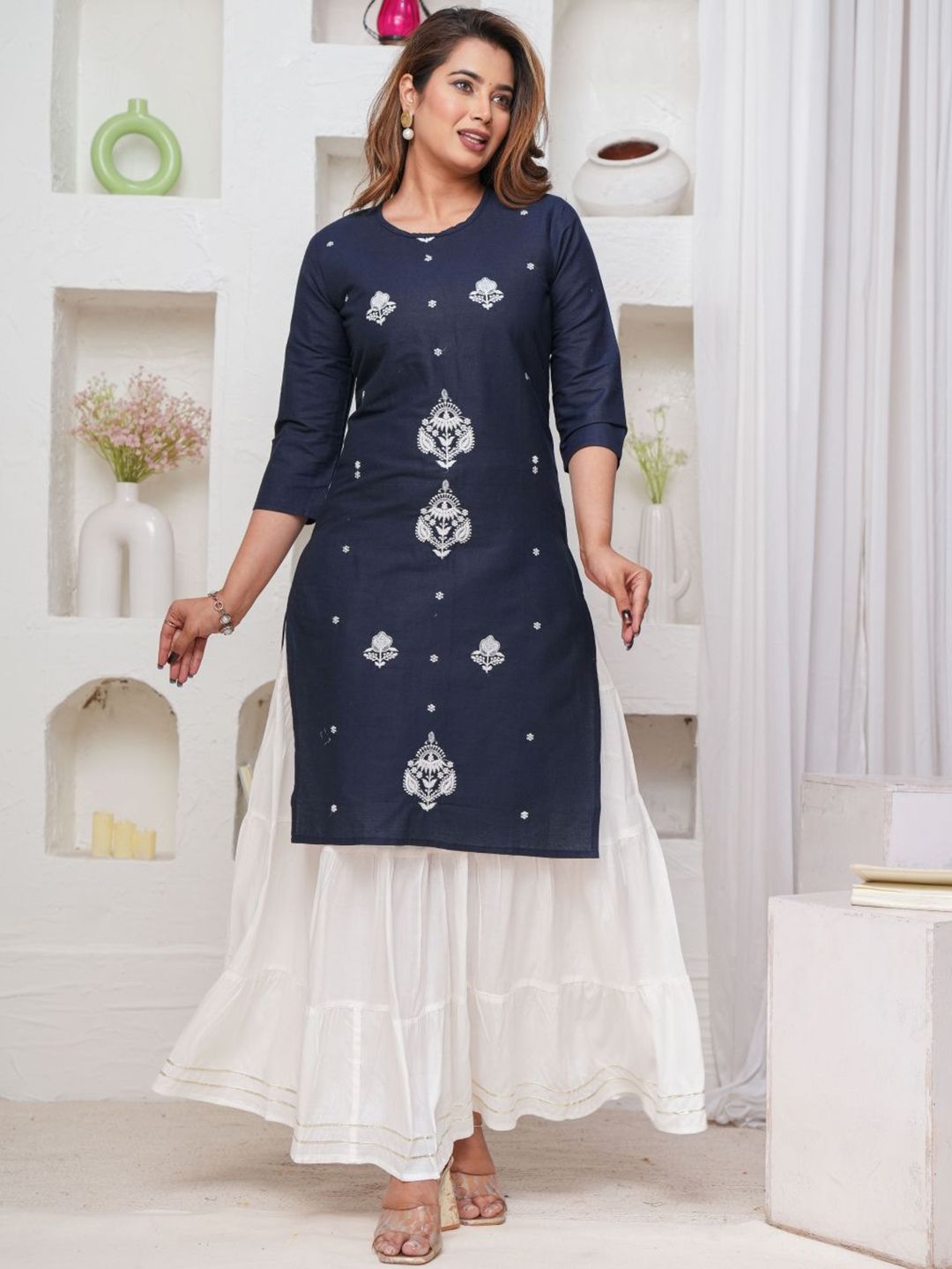 Mehsoos Floral Embroidered Thread Work Pure Cotton Straight Kurta With Skirt